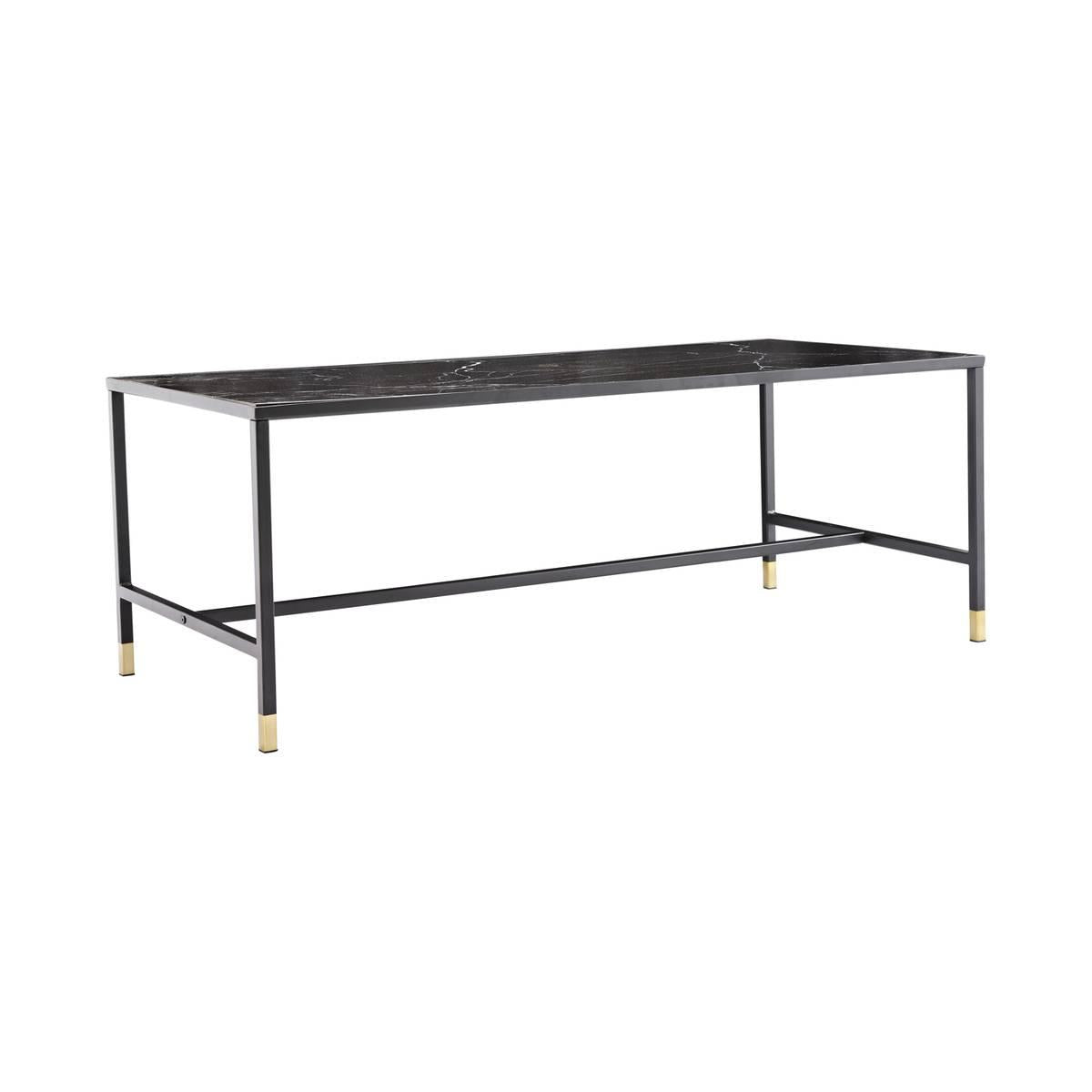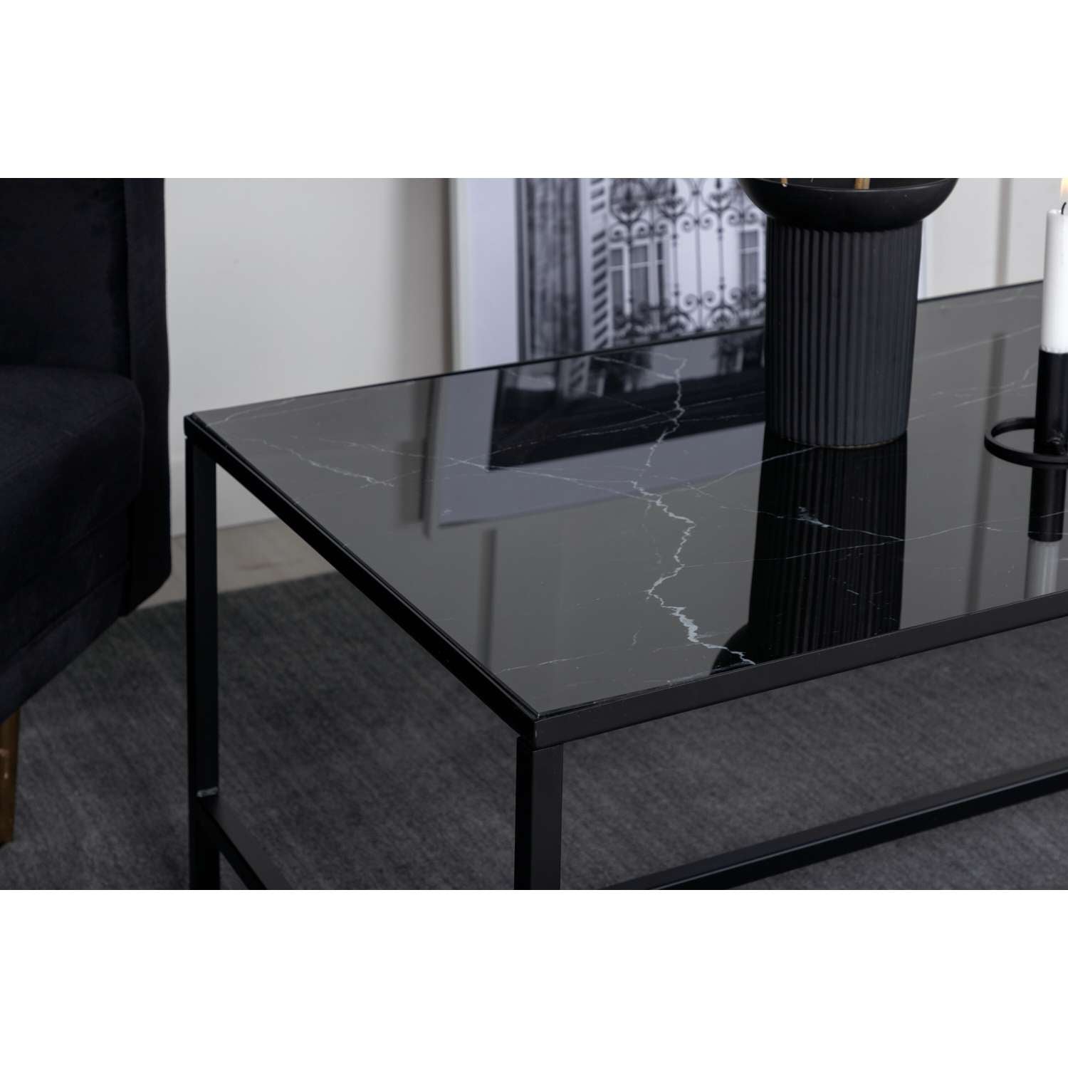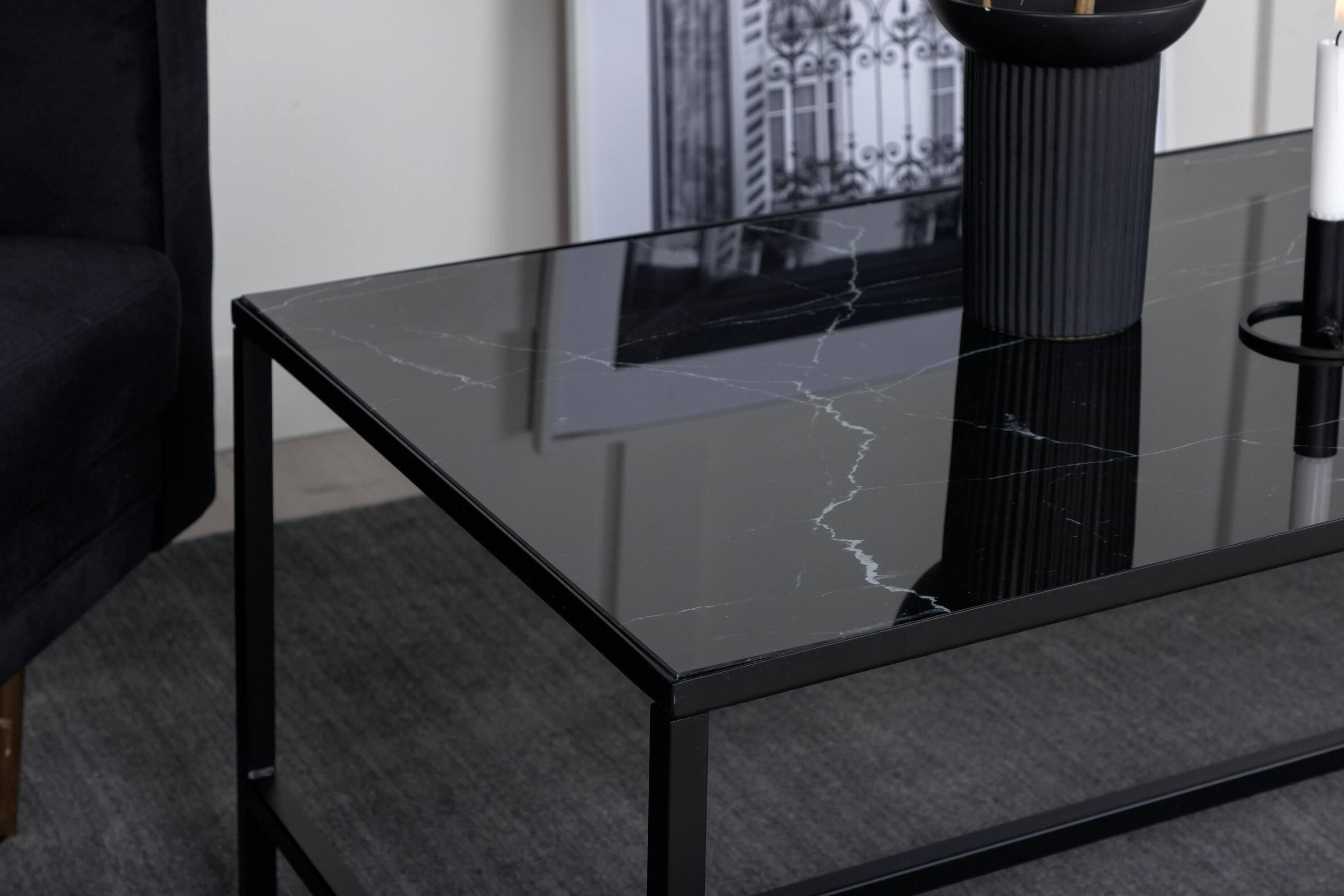 De salontafel Dipp heeft een licht gemarmerd tafelblad van glas en een onderstel van zwart metaal met messingkleurige pootuiteinden.