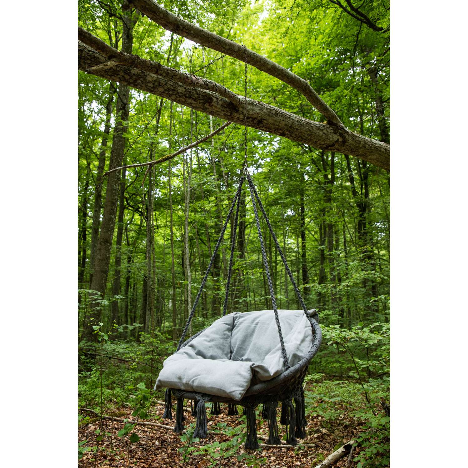 - Het ontwerp is doordacht en lijkt op een mand die wordt gedragen door duurzame, grijze touwen
