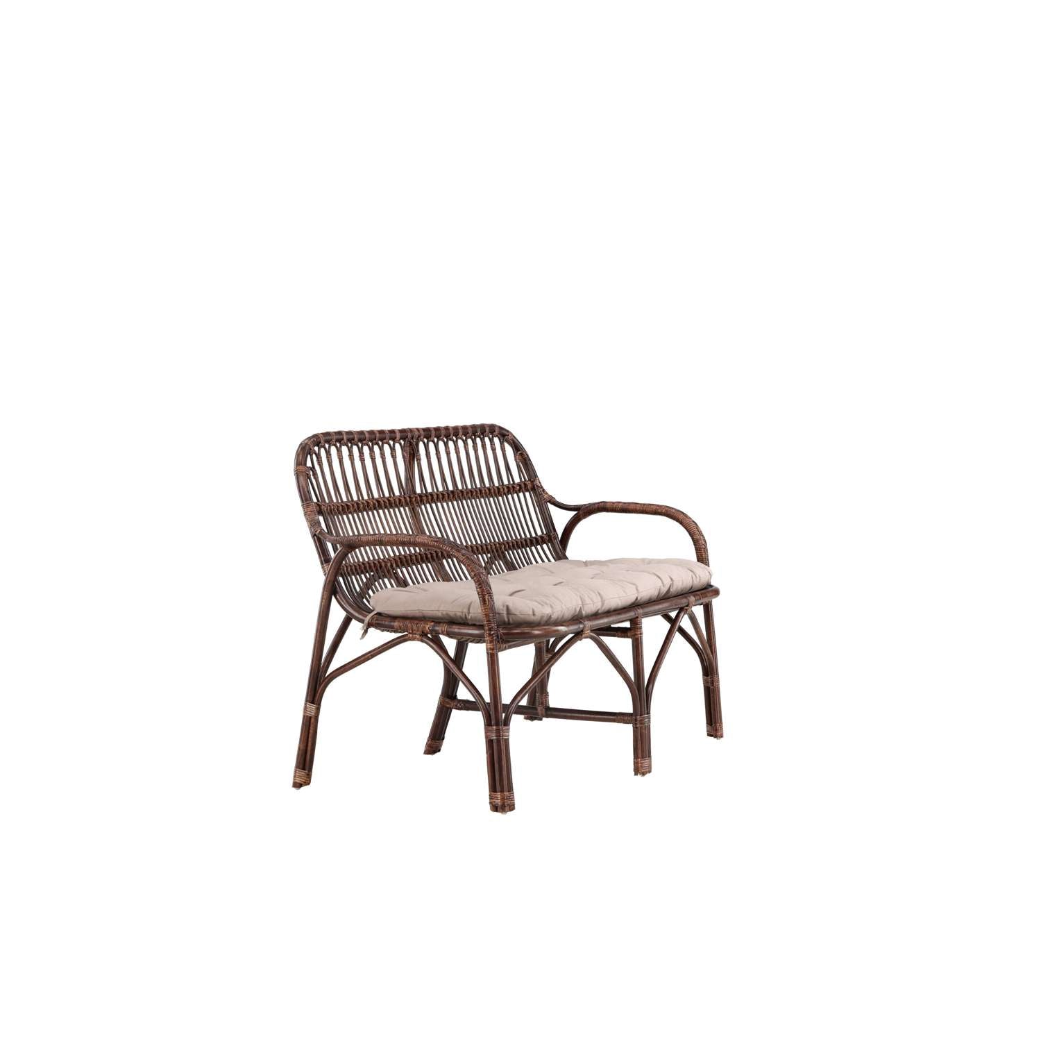 - Deze elegante zitbank, in een warme bruine tint met zachte beige kussens, is de perfecte aanvulling om uw momenten buitenshuis op te fleuren