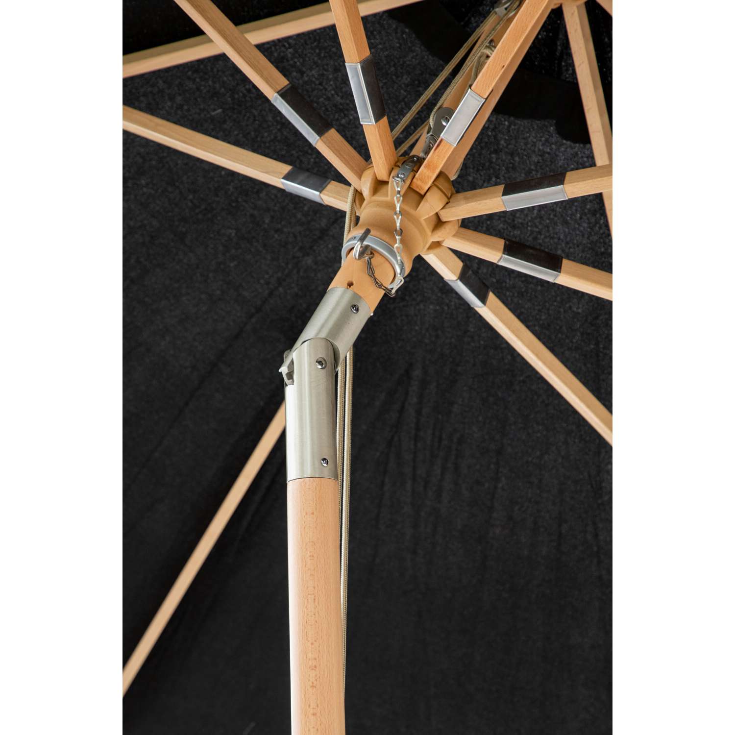 - Deze eenvoudig inklapbare parasol met zwarte stof en houten frame heeft een moderne en tijdloze uitstraling die bij elk huis en elke stijl past.