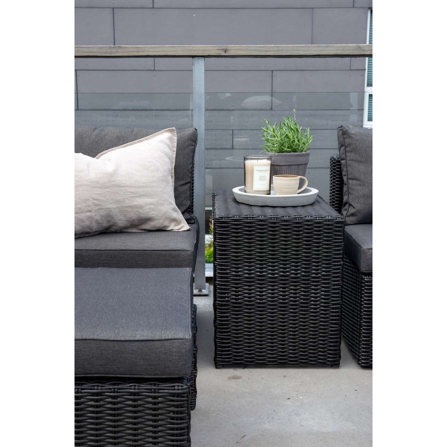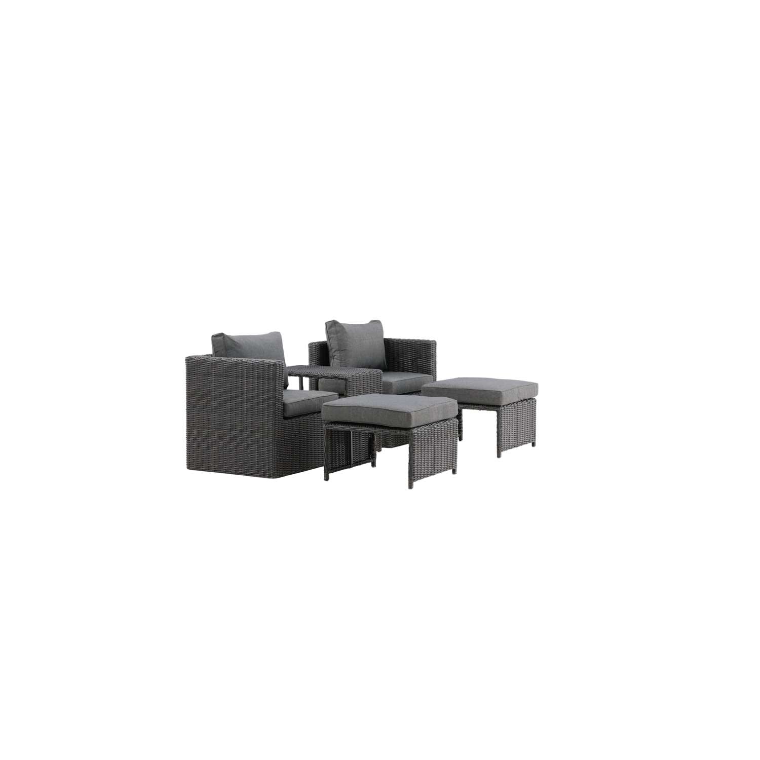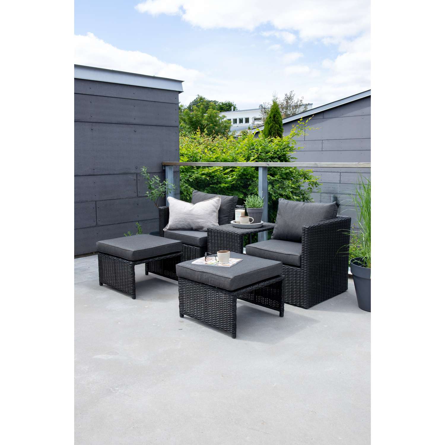 Creëer de perfecte sfeer op het terras deze zomer! Deze uitnodigende loungeset bestaat uit twee fauteuils met voetenbankjes, een kleine tafel en zachte zwarte kussens - allemaal gemaakt van tijdloos zwart kunstrotan en duurzame stof