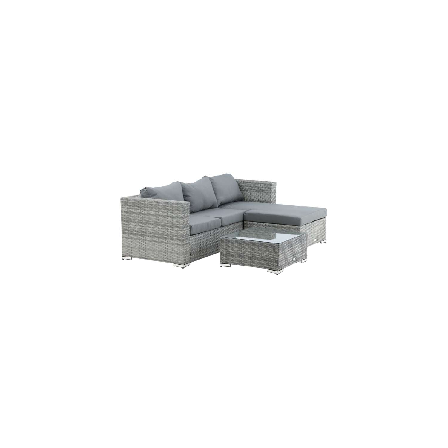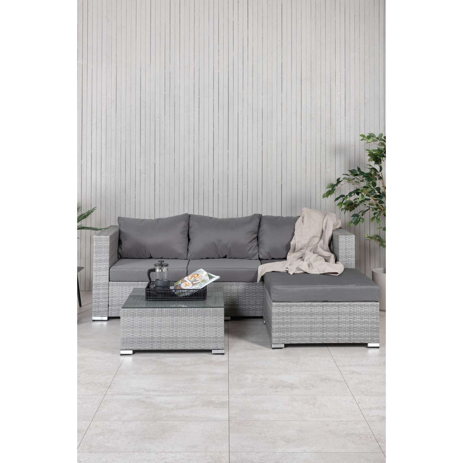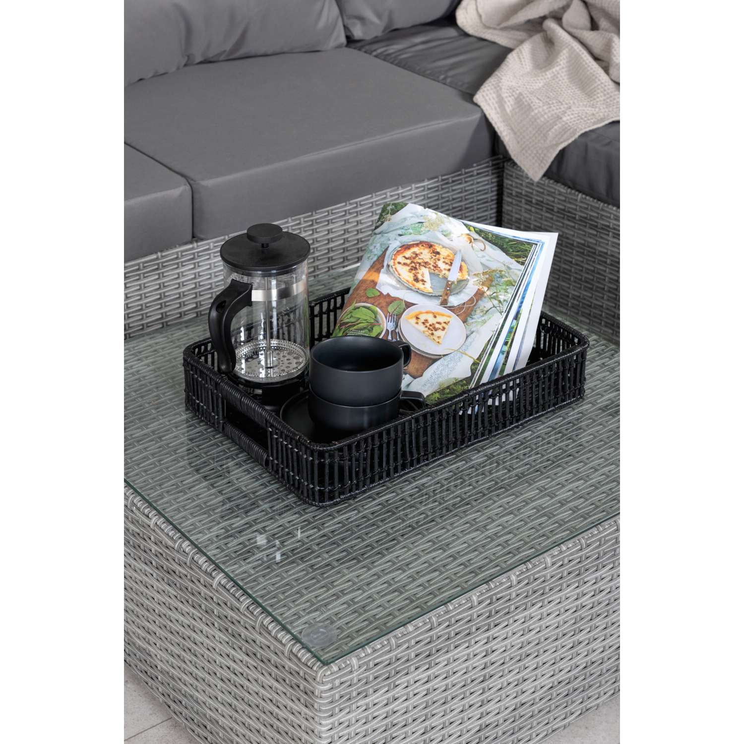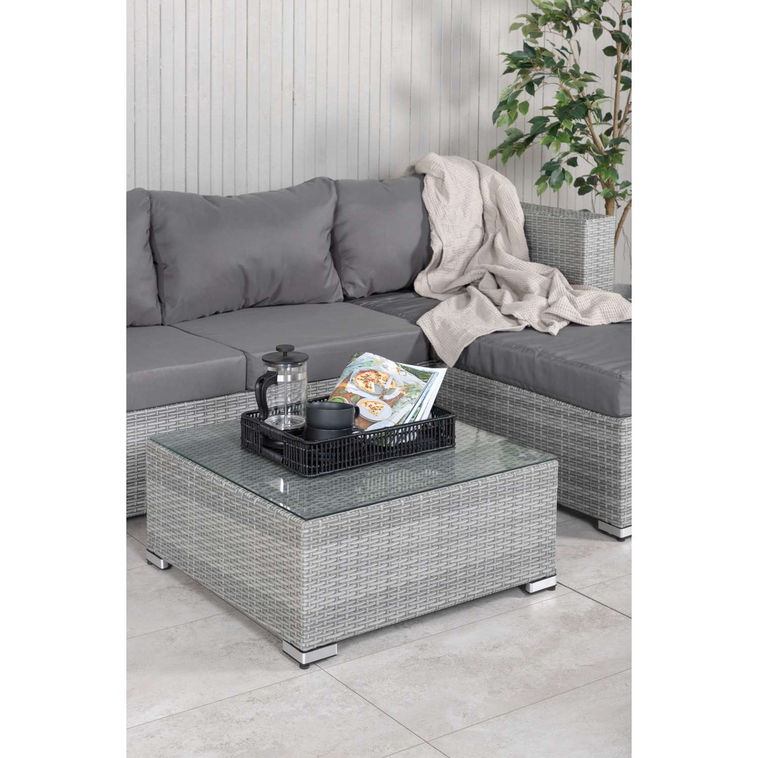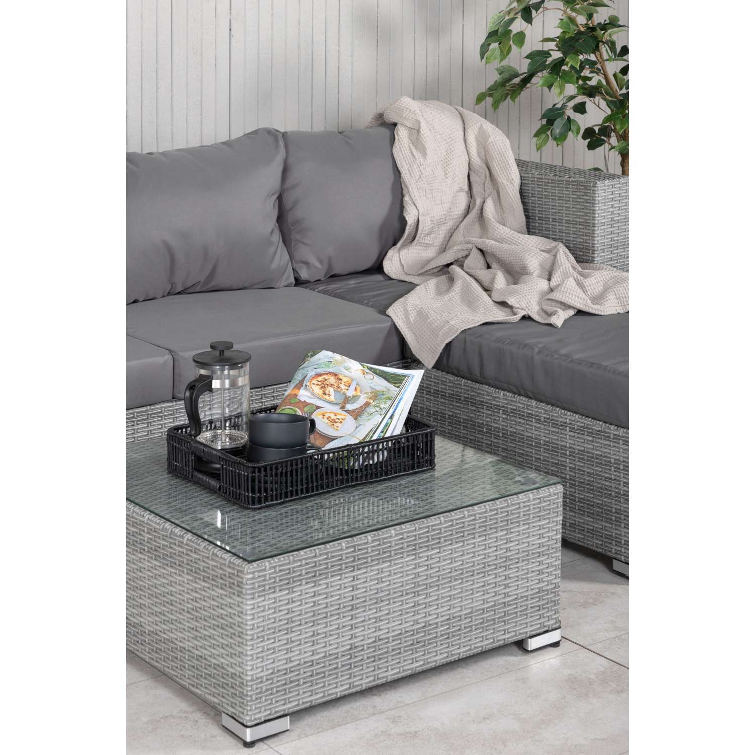 - Gemaakt van duurzame grijze rotan en staal, met een bijpassende tafel met een glazen tafelblad