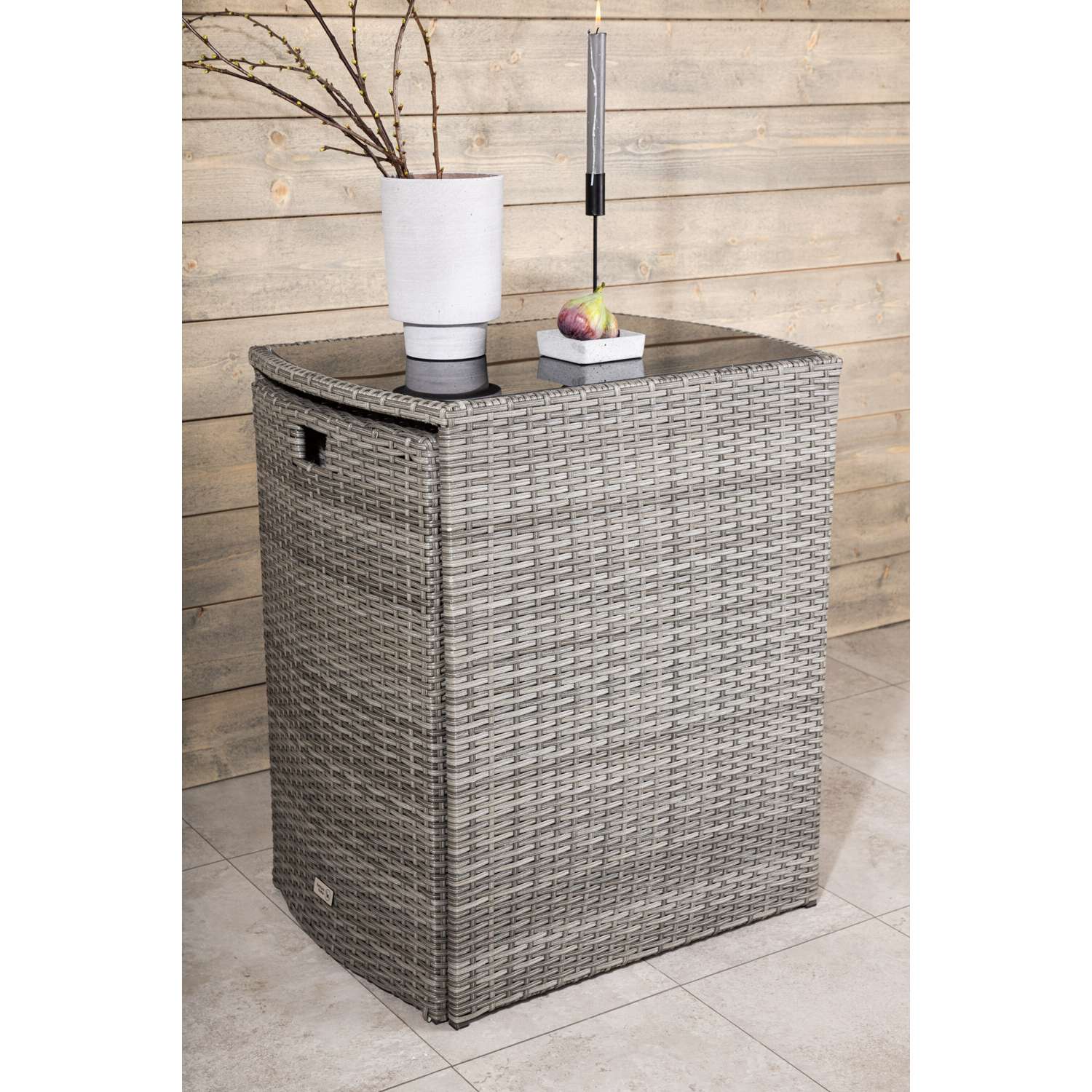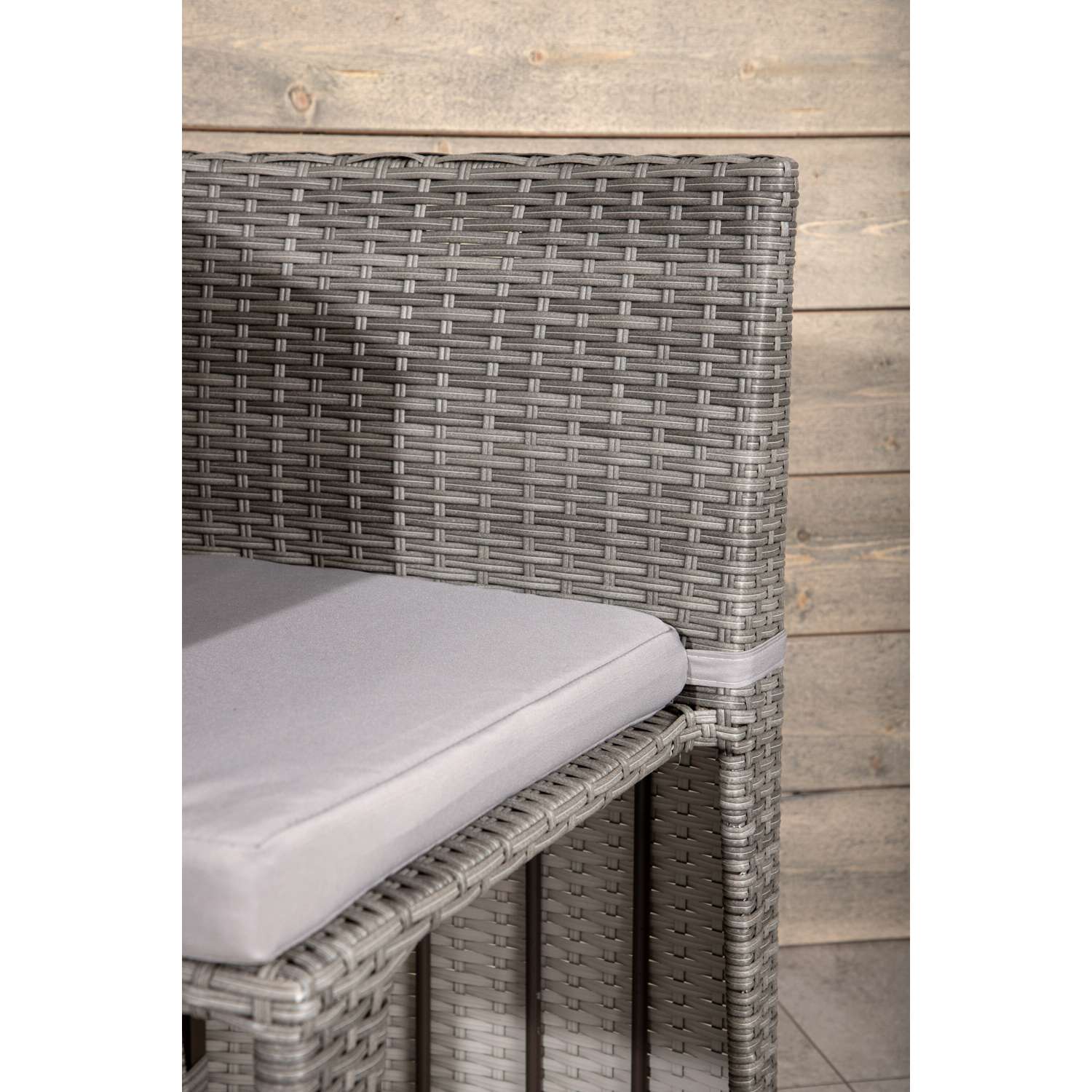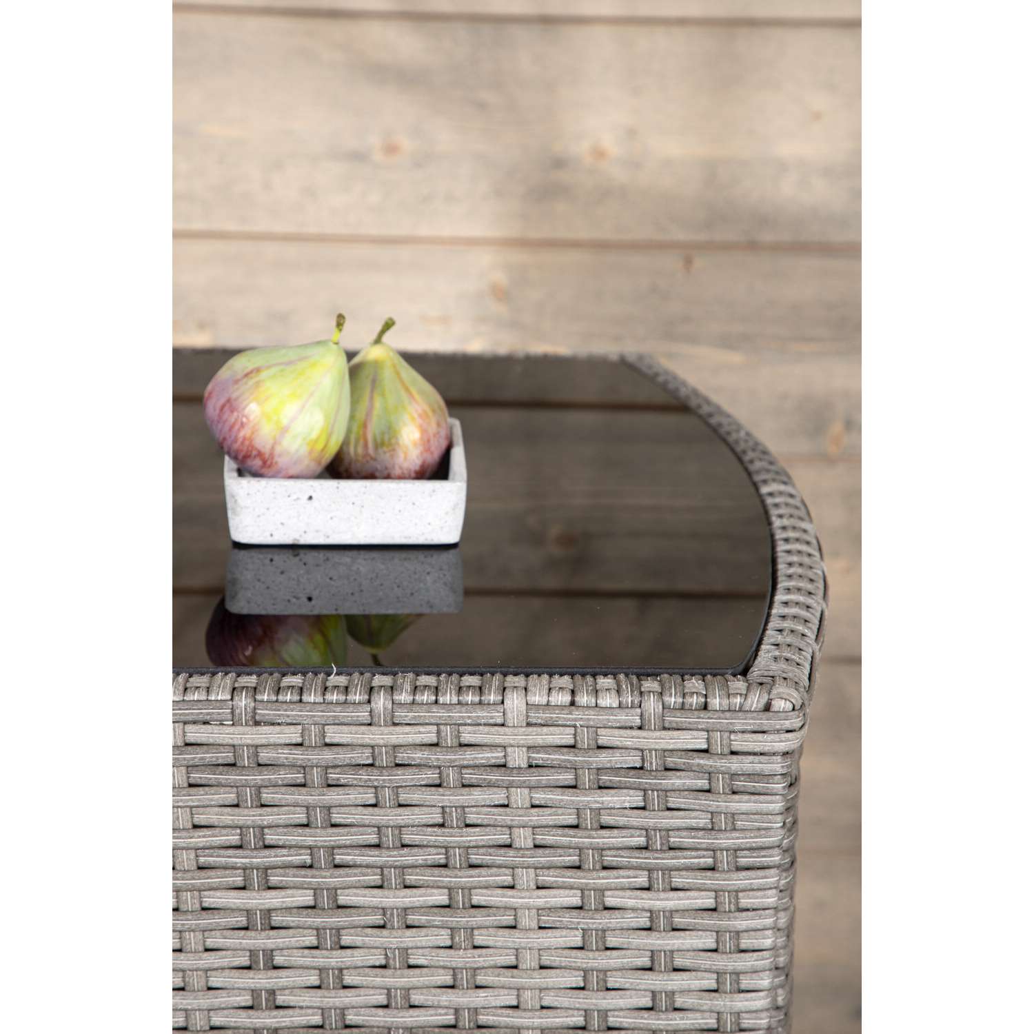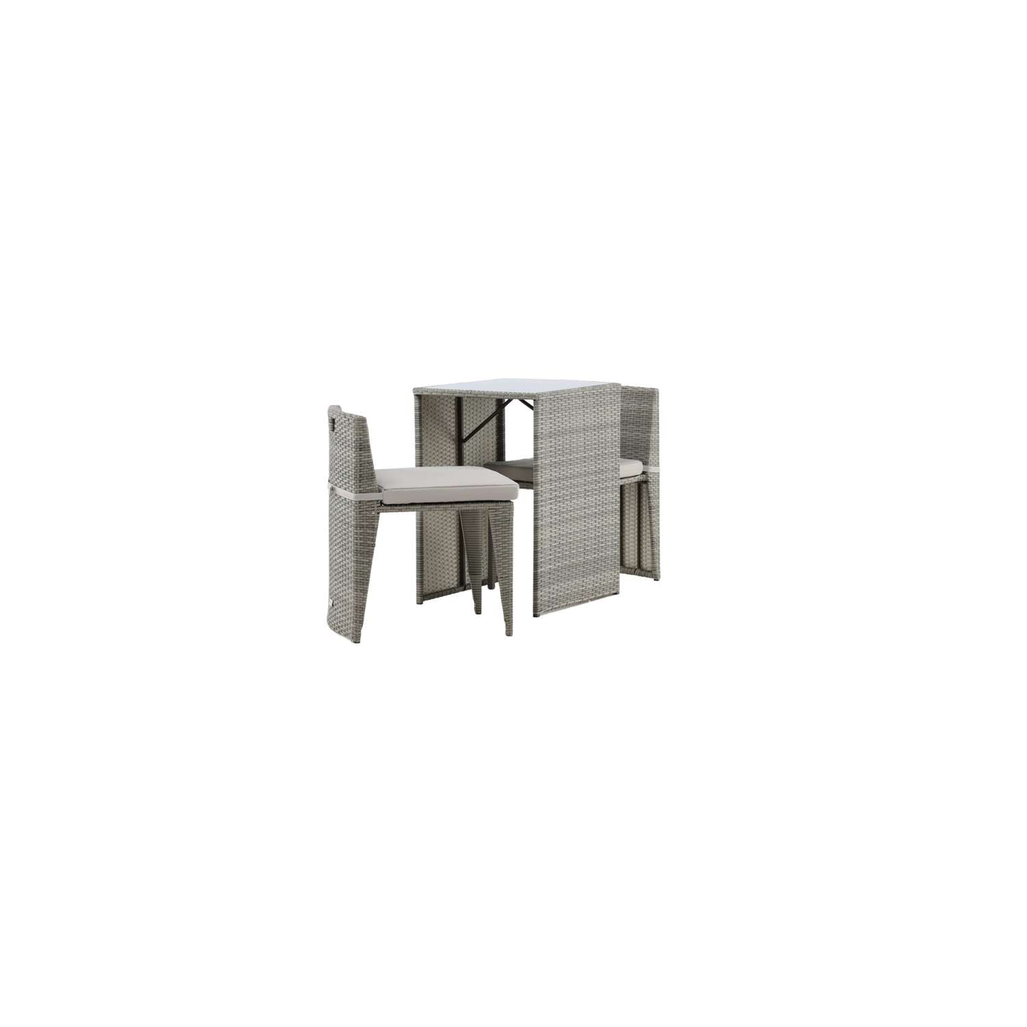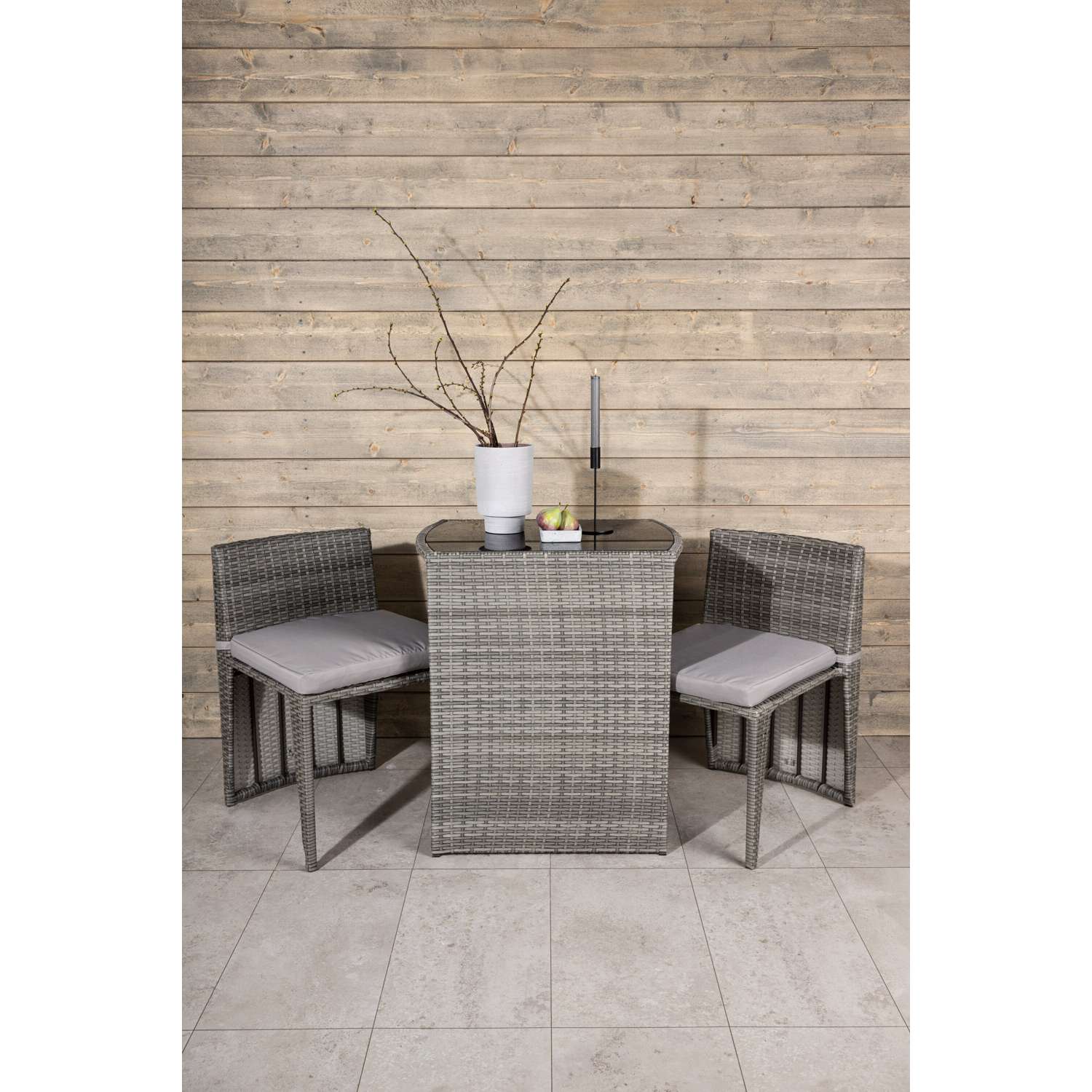 - De caféset bestaat uit twee stoelen en een tafel met bijbehorend glazen blad dat bestand is tegen weer en wind