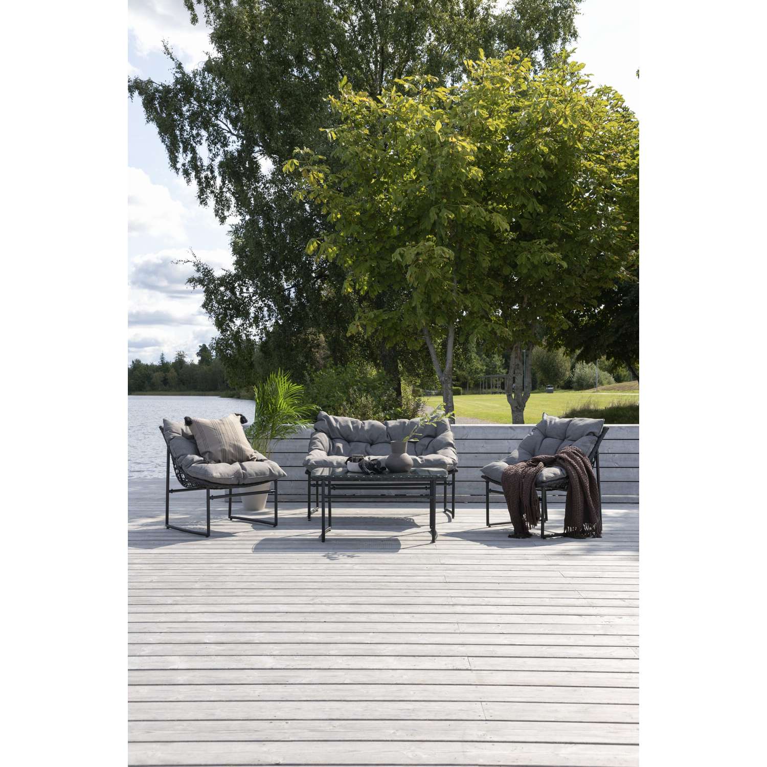 - Duurzame grijze kussens zijn inbegrepen en de set biedt plaats aan in totaal 4 zittende gasten