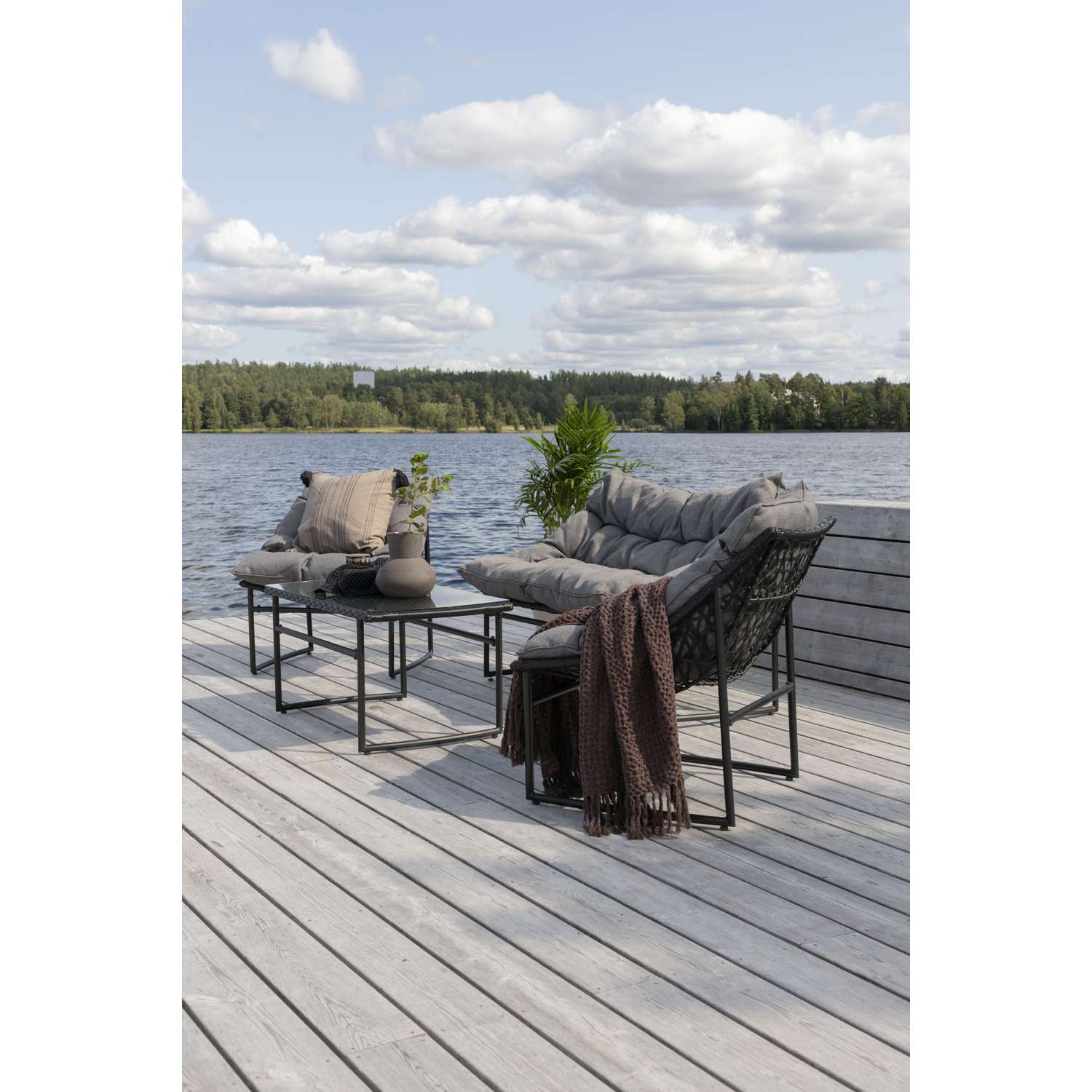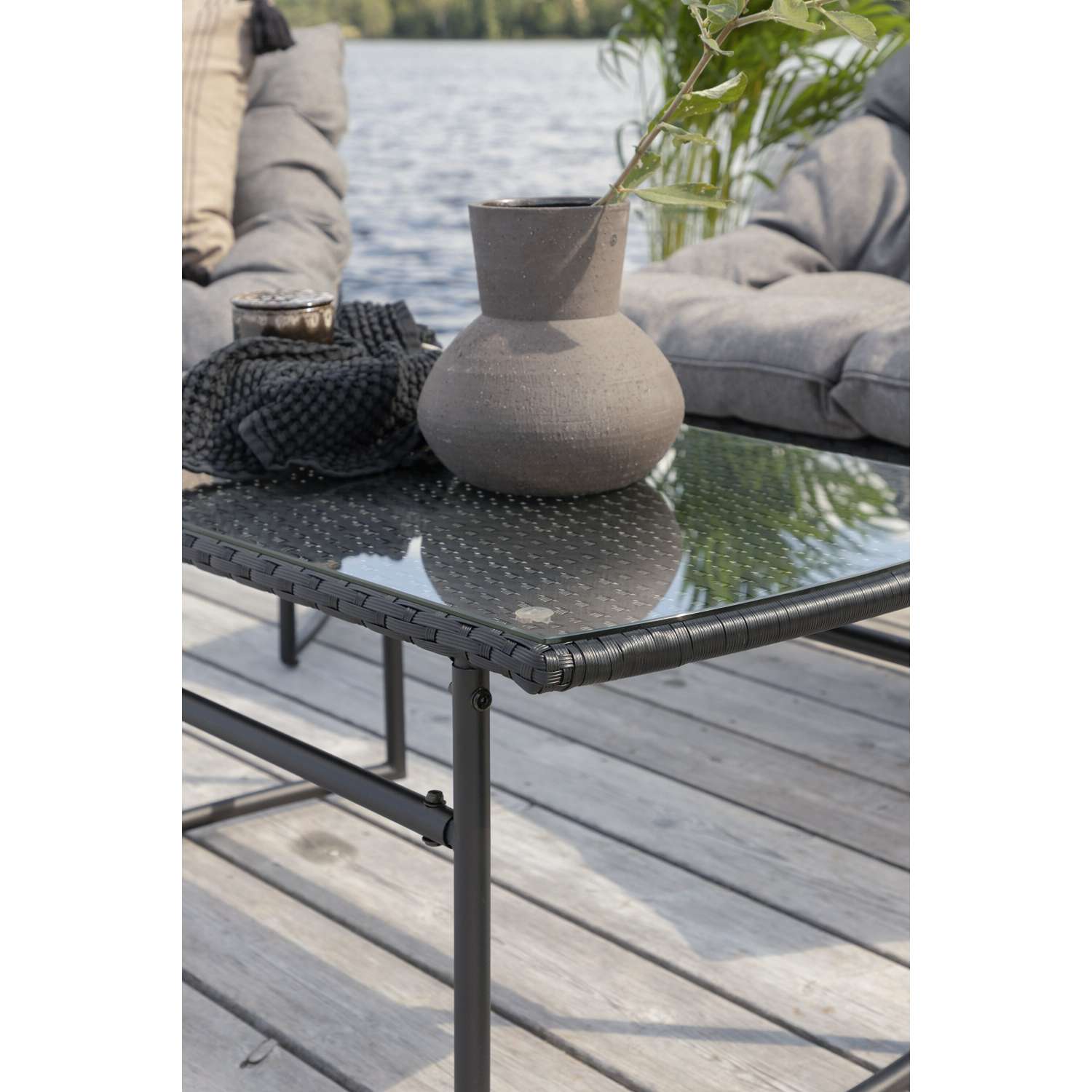 Welkom thuis in een ontspannende en opvallende set met trendy design! De Tina is een mooie en stijlvolle set van zwart aluminium met bijbehorende tafel die matcht met een glazen blad