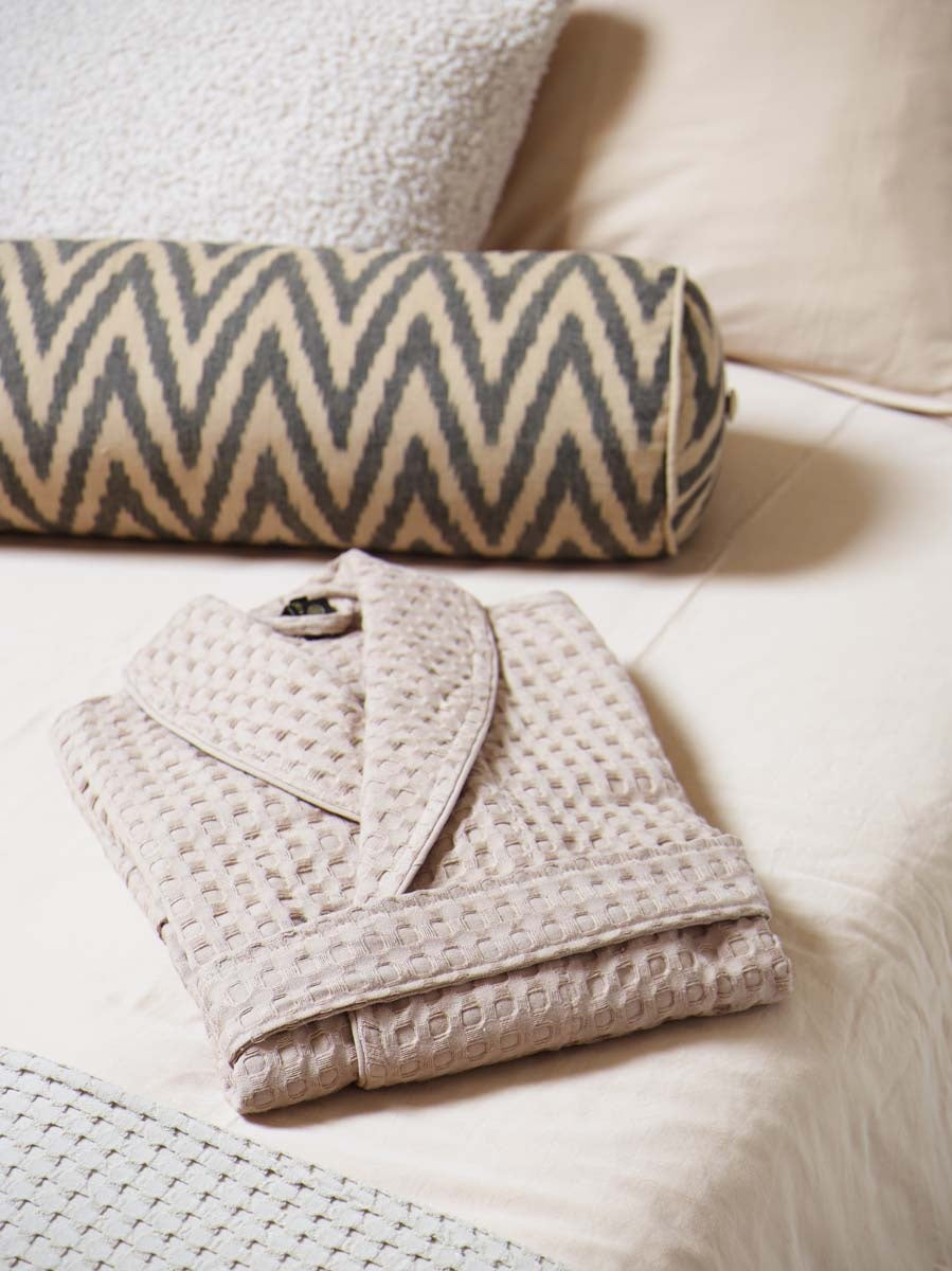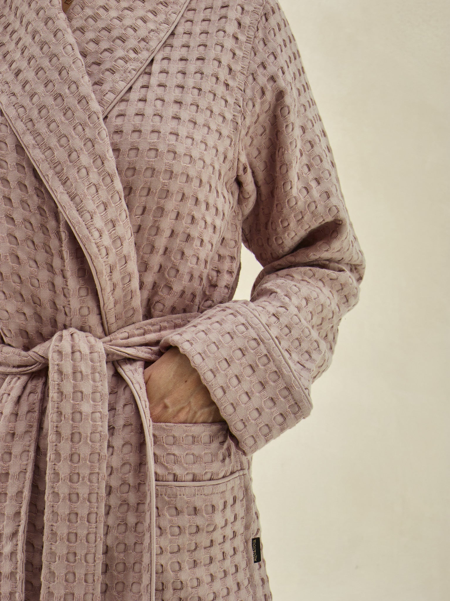 - Deze badjas heeft een 'Slim Fit', weinig overslag en heeft smalle mouwen met een ruime omslag.