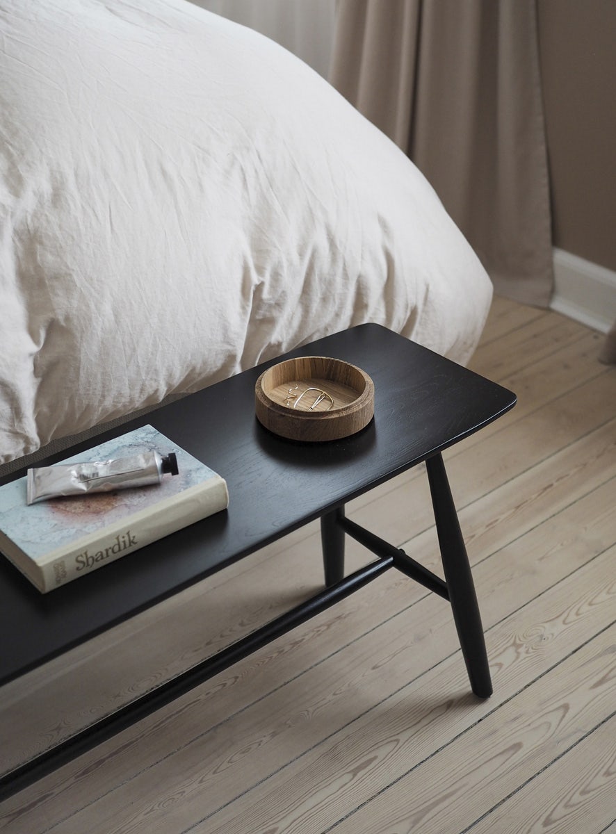 Het houten bankje is gemaakt van FSC™-gecertificeerd eikenhout (FSC-C166612). Dit betekent dat het hout uit verantwoord beheerde bossen afkomstig is. Het eikenhout is afgewerkt met een zwarte verflaag. Het bankje is 90 cm breed, 28 cm diep en 45 cm hoog. Door de verbindingen tussen de poten staat het bankje stevig op de grond. De zithoogte van 45 cm is perfect voor een bankje aan de eettafel of aan een bureau, zoals het Bast eikenhouten bureau. Je kan het bankje natuurlijk ook als decoratie gebruiken en er een mooie plant of woonaccessoires op zetten in de woonkamer, of het als nachtkastje gebruiken naast je bed. Zet er een lampje en een wekker op en je hebt een stijlvol tafeltje voor in de slaapkamer.