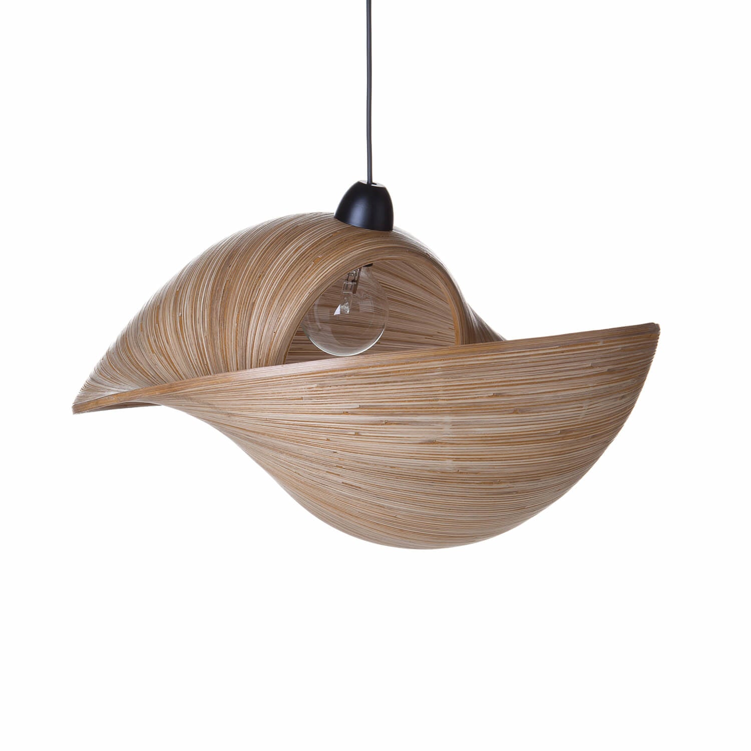 De Hanglamp Bamboo Shell 60cm is een trendy hanglamp in de vorm van een schelp. De plafondplaat is van metaal en zwart van kleur, deze bijzondere lampenkap is gemaakt van bamboe dat is samengeperst tot een lampenkap in zijn natuurlijke kleur.