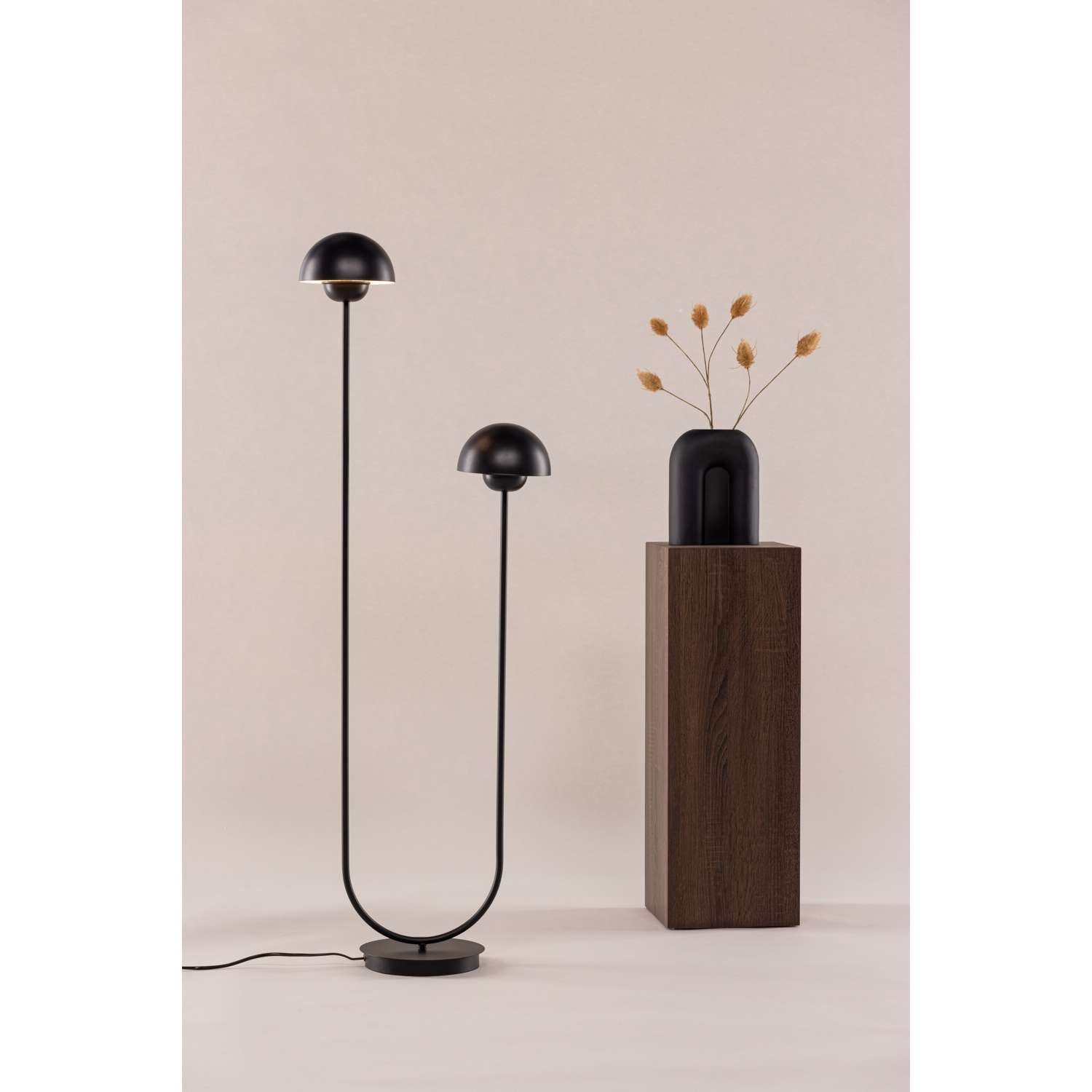 De vloerlamp uit de Lyckorna-serie bestaat uit twee kleinere lampen die verbonden zijn met een prachtig onderstel van zwart ijzer