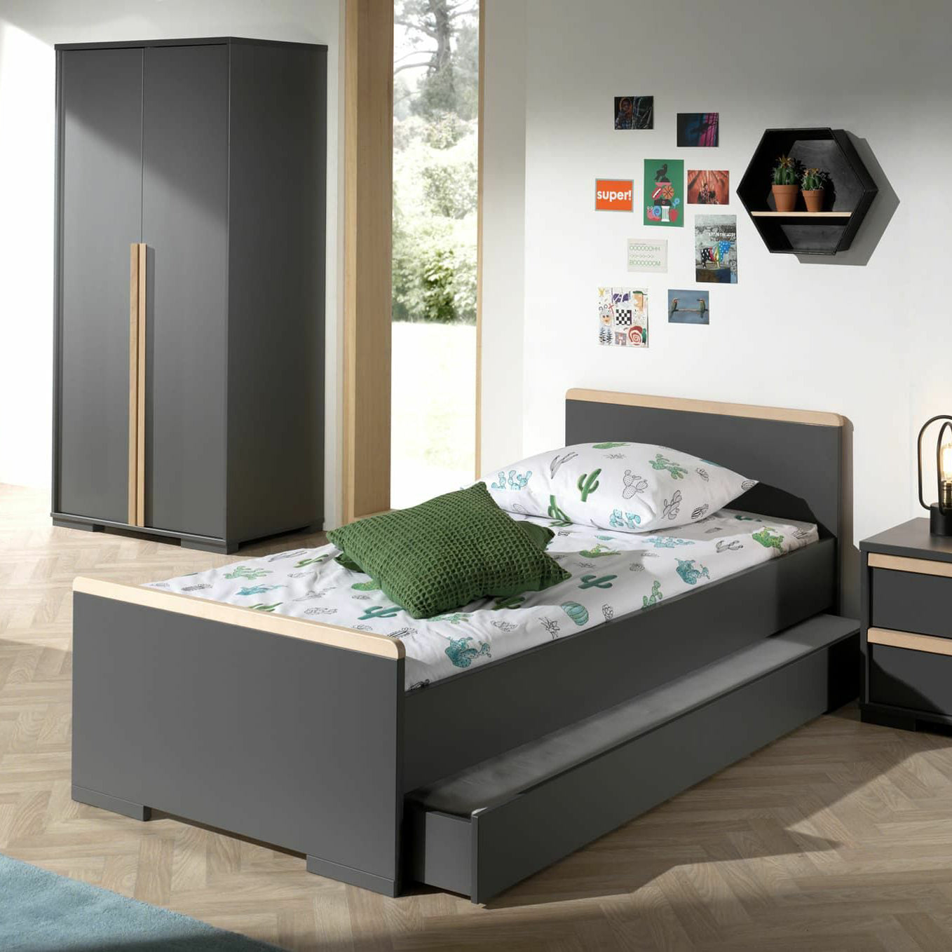 - De lange verticale handgrepen van beukenhout zorgen voor een warm accent in de kinderkamer