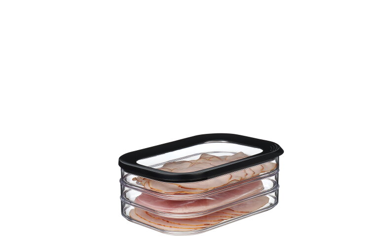 Vleeswarendoos Modula 550/3, voorzien van een doorzichtige deksel met zwarte ring. De rechthoekige Modula vleeswarendoos met afgeronde hoeken heeft een inhoud van 1650 ml en geeft direct zicht op inhoud, ook in de koelkast! De zwarte afdichtring zorgt voor een perfecte afsluiting, waardoor deze doos geschikt is voor het bewaren van diverse vleeswaren in 3 lagen. De Modula bewaar- en opbergdozen van Mepal zijn verkrijgbaar in verschillende maten en uitvoeringen, liggen goed in de hand en zijn makkelijk te openen. Bovendien zijn ze stapelbaar en vaatwasmachinebestendig. Hoe veeleisend u ook bent: Modula bewaardozen zijn erop berekend!