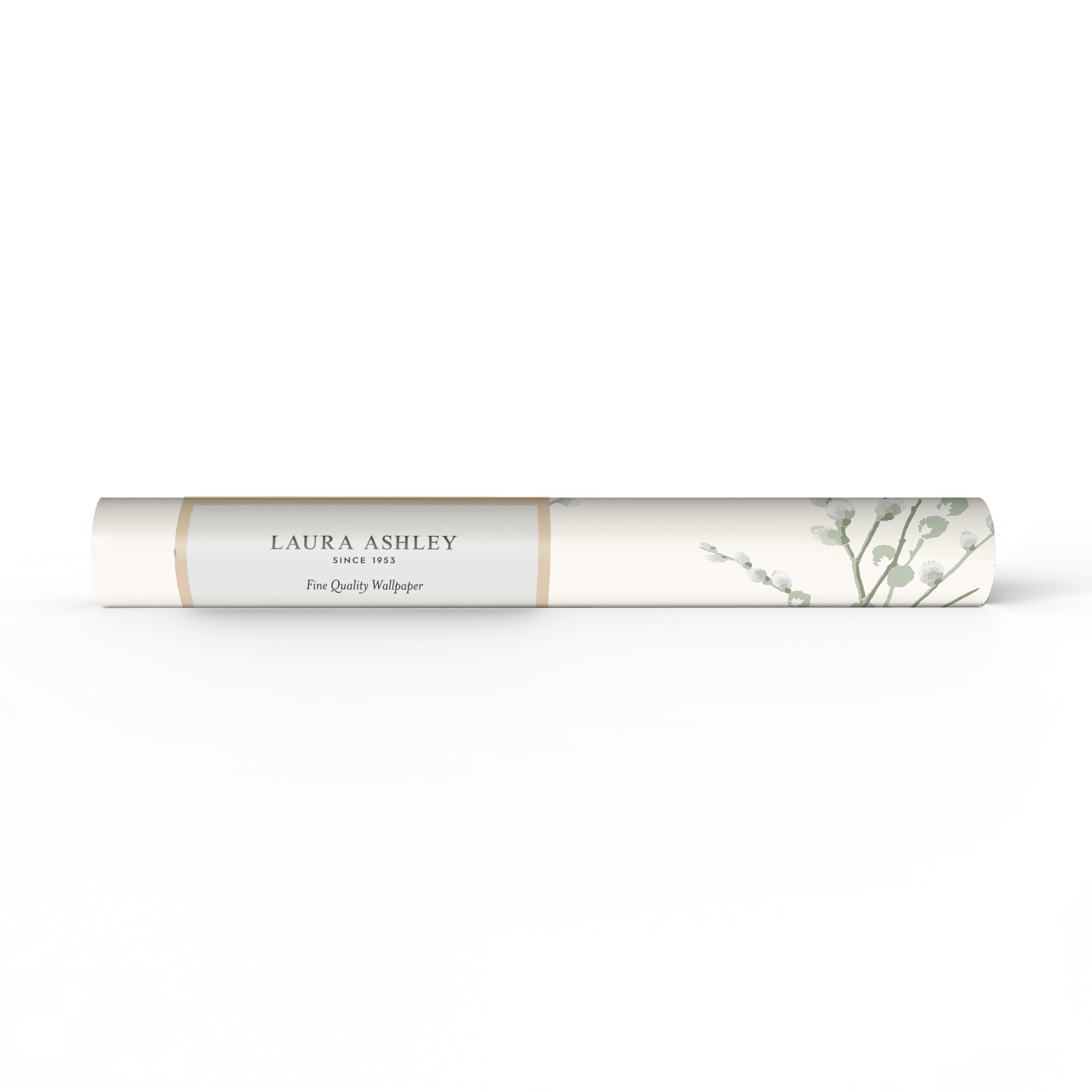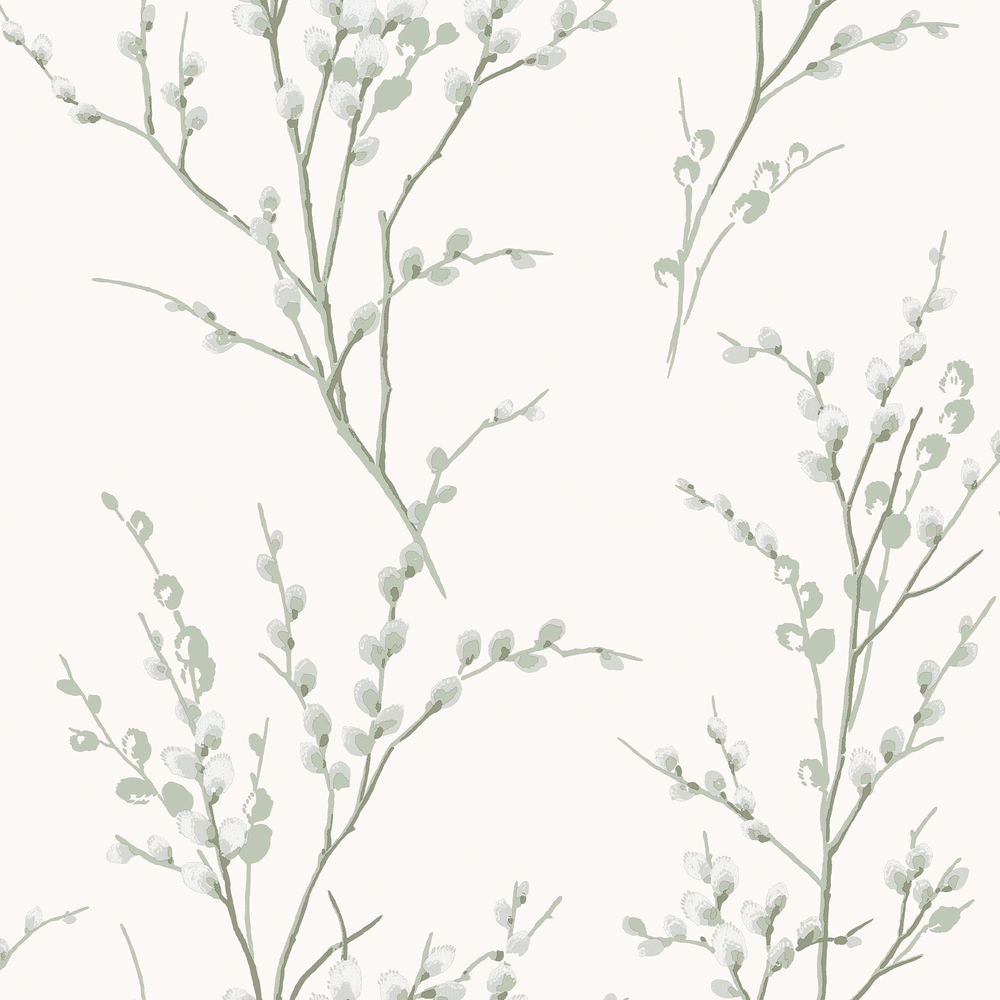 Het Pussy Willow behang met frisse bloemenprint is een elegante keuze voor elke kamer. De saliegroene accenten op een gebroken witte achtergrond voegen een eigentijds accent toe.