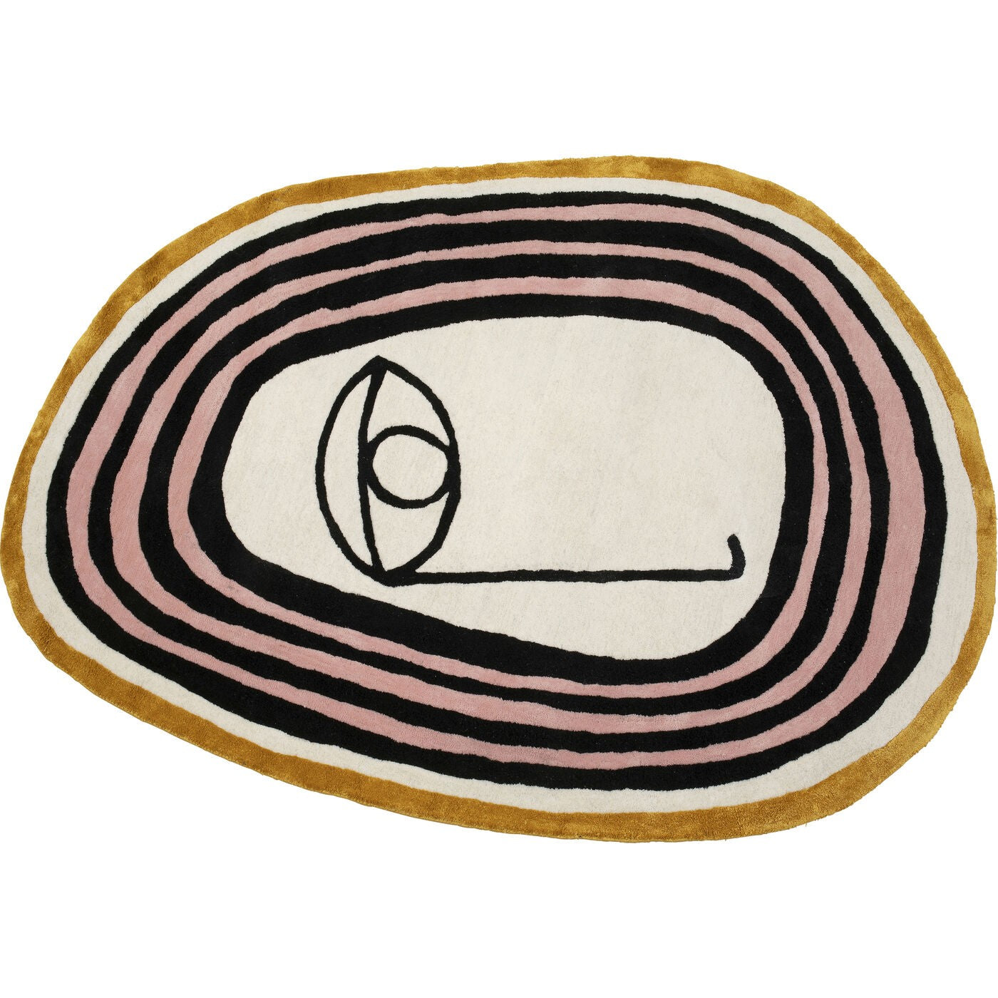 - Dit getufte tapijt speelt met de basiskleuren wit en zwart, gesublimeerd door elegante accenten van geel en roze.