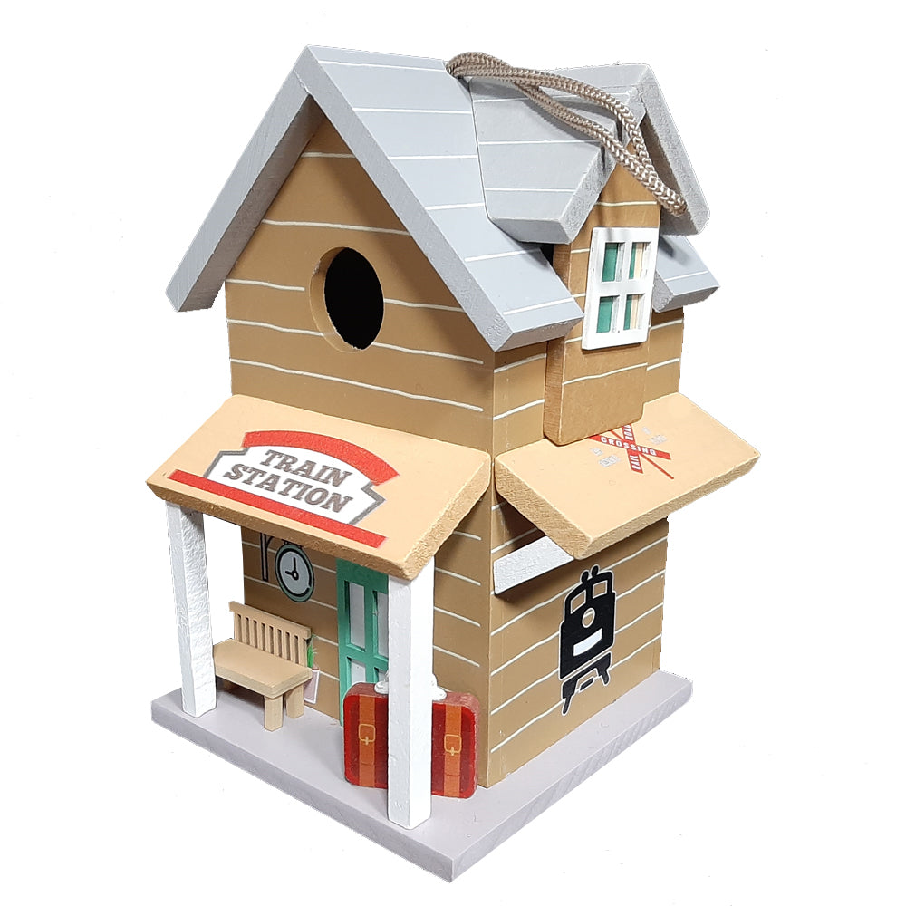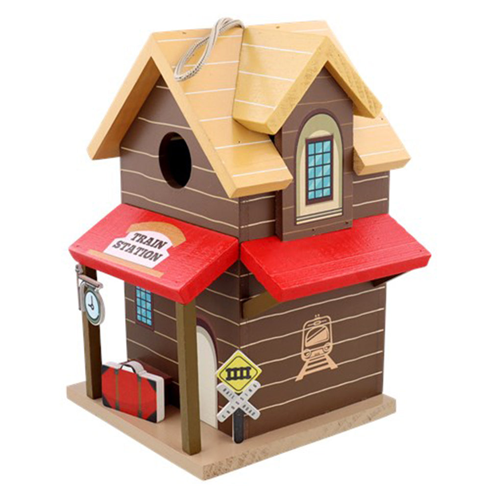 Aan de voorzijde zit een invliegopening van circa 32 mm. Dat maakt deze nestkast zeer geschikt voor de koolmees, pimpelmees, ringmus, boomklever en bonte vliegenvanger. Het huisje is gemaakt van 100% FSC gecertificeerd vurenhout. Het huisje is geverfd in meerdere kleuren en heeft verschillende decoratieve elementen met een treinstation thema. Door middel van een ophangtouw aan de bovenzijde is het vogelhuisje eenvoudig op te hangen. Het klepje aan de zijkant is te openen door het clipje opzij te schuiven. Hierdoor kant het huisje eenvoudig worden gereinigd. Het huisje heeft een afmeting van circa 15 x 15 x 23 centimeter.