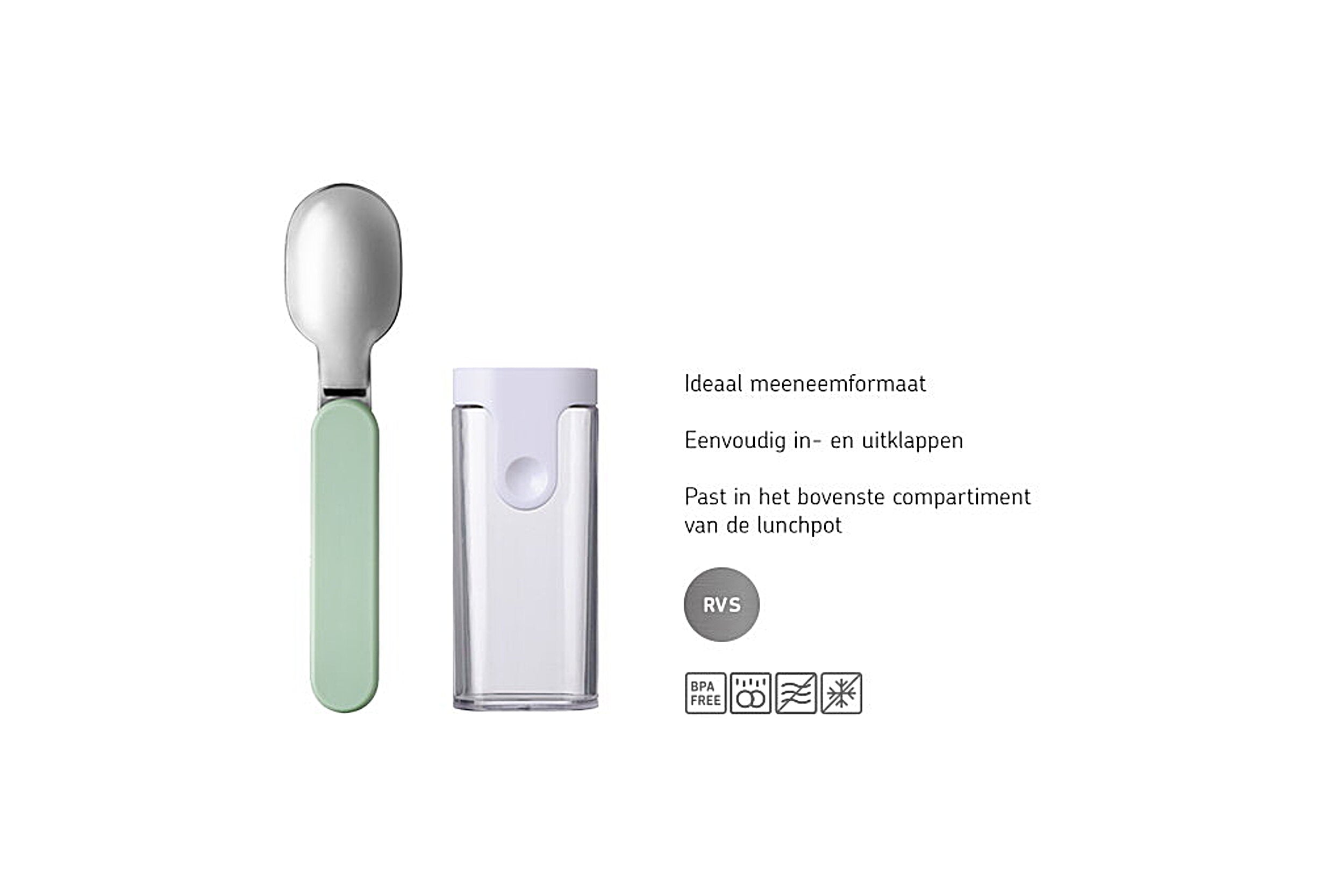 Lunchpotlovers opgelet! Neem jij je pot ook graag mee voor een verwarmend soepje op je werk of yoghurt met fruit in de trein? Dan ga je hier heel blij mee zijn: de vouwlepel Ellipse in wit past opgeklapt precies in het bovenste compartiment van je lunchpot! Zo heb je nooit meer een vieze lepel in je tas én houd je alles handig bij elkaar. Je kunt de lepel ook los meenemen in de bijgeleverde cassette. Je vouwt ‘m met één simpele klik uit. Eten maar! Nadat je thuis bent alles in de vaatwasser en je bent weer klaar voor de volgende maaltijd. Ook leuk: hij is er in dezelfde kleur als je favoriete lunchpot.
