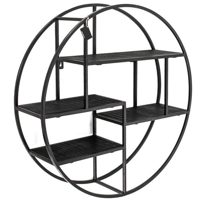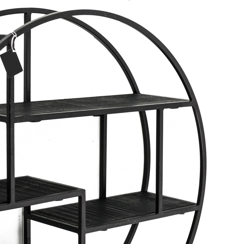 Dit zwarte, metalen wandrek is de perfecte combinatie van stijl en functionaliteit. Met zijn ronde ontwerp en royale afmetingen van 90 x 90 x 20 cm brengt dit wandrek een moderne en elegante uitstraling in je interieur.