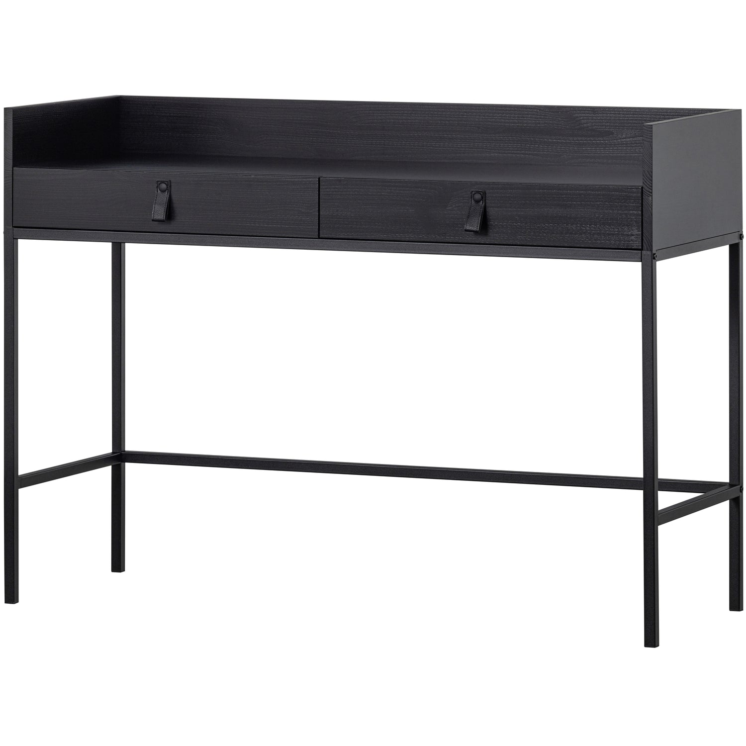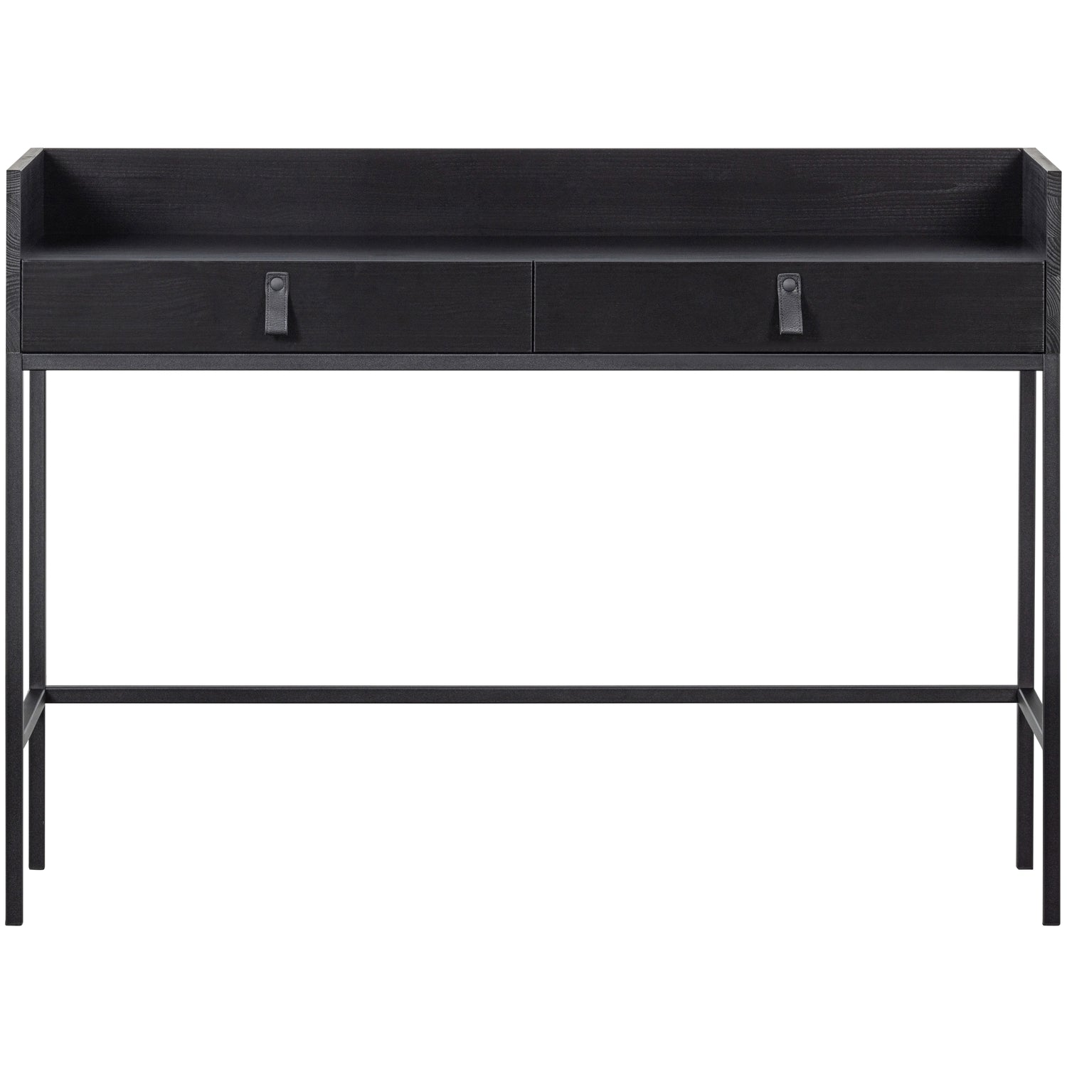 Bookazine is voorzien van twee laden met twee zwart leren grepen. De inhoud van elk van deze lade is 5,5 cm hoogte, 56 cm breedte en 40 cm diepte. Het werkblad is 117 cm breed en 41 cm diep, de 10 cm hoge rand zorgt voor een mooie afscheiding. De slanke poten zijn 64 cm hoog en 2x2 cm. Op 20 cm boven de grond bevindt zich een spijl om de stabiliteit van het bureau te waarborgen.