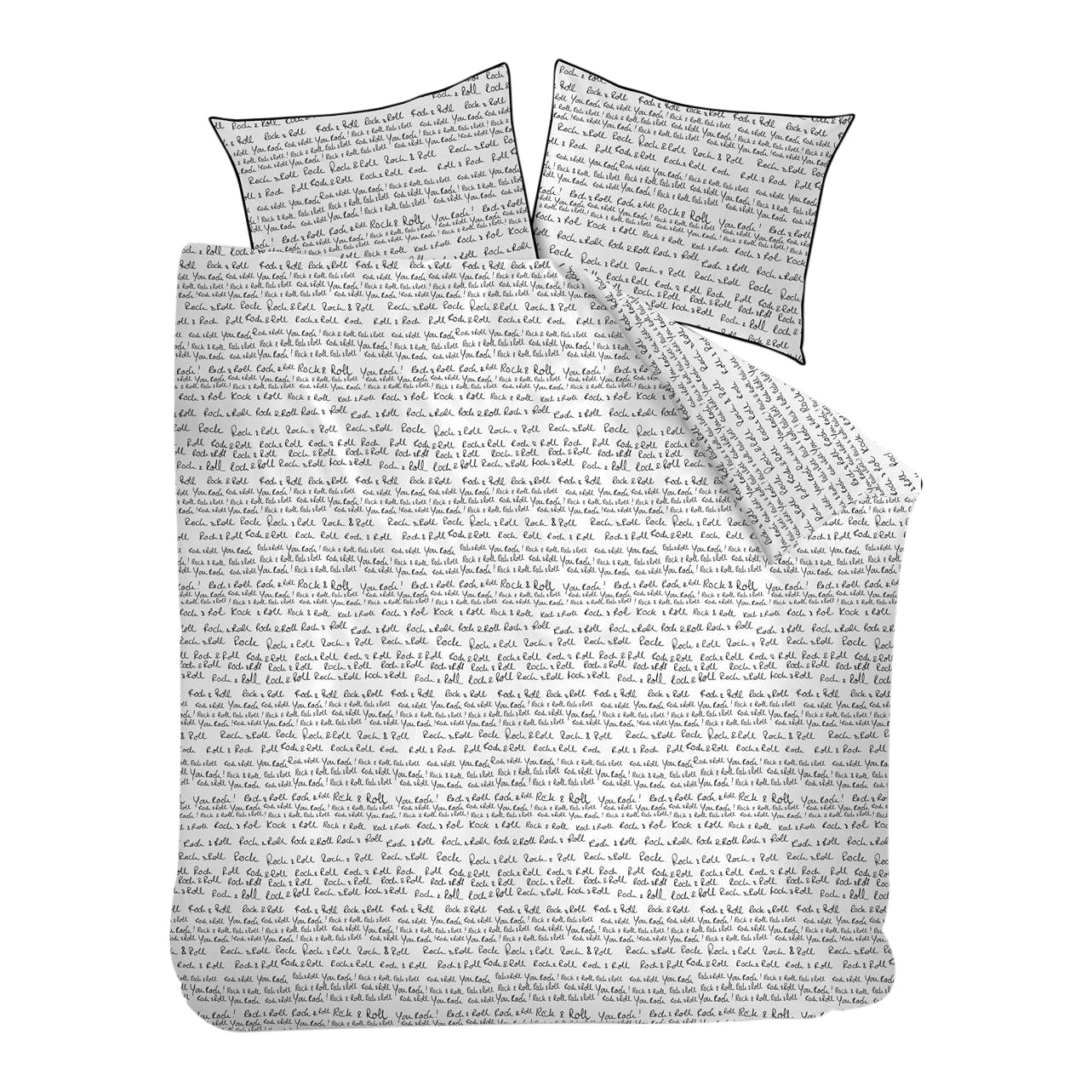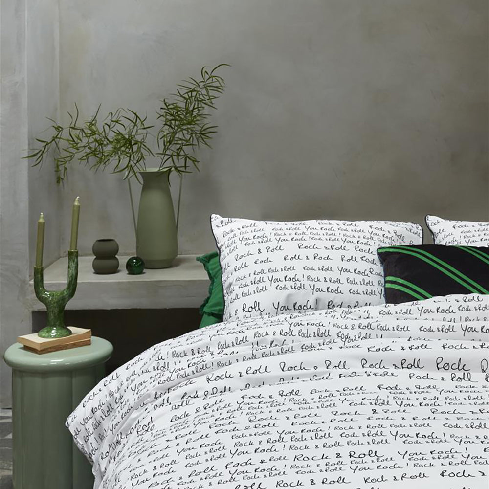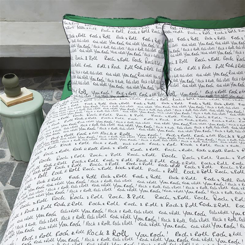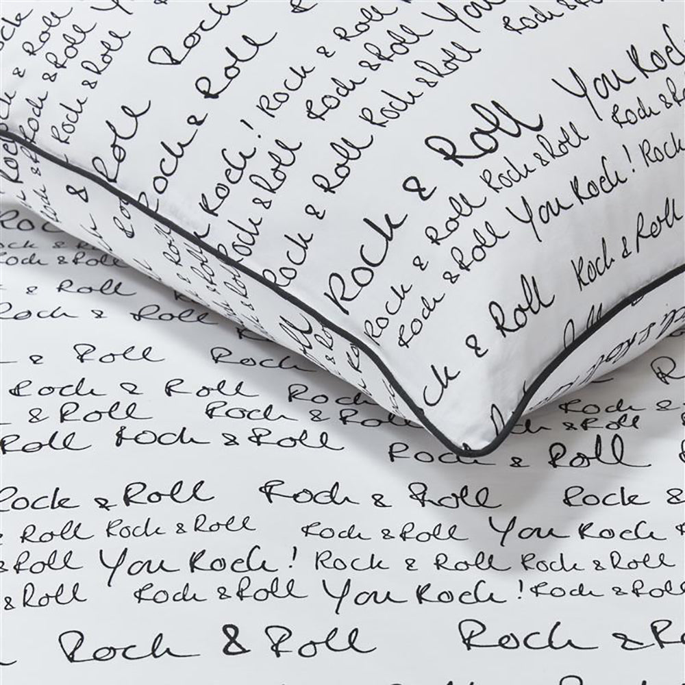 You Rock! Met het dekbedovertrek Rock&Roll van vtwonen. Het dessin bestaat uit een handgeschreven tekst en loopt door tot op de achterzijde én de kussenslopen. Het overtrek is gemaakt van 100% katoen en heeft een handige instopstrook.