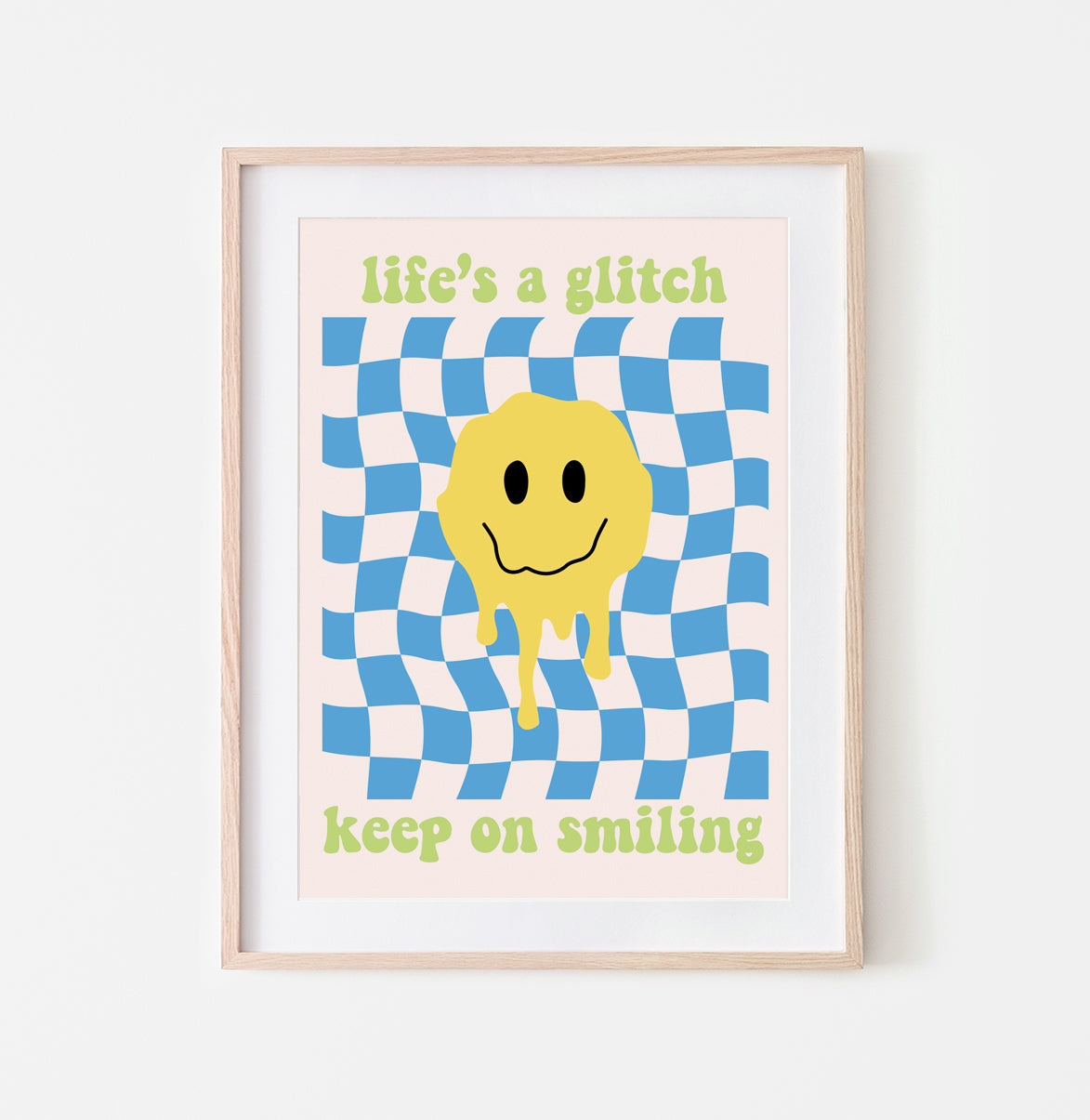Breng de speelse energie van retro design in je interieur met onze opvallende poster. Met de tekst "Life's a Glitch" in nostalgische letters wordt deze poster een echte blikvanger.
