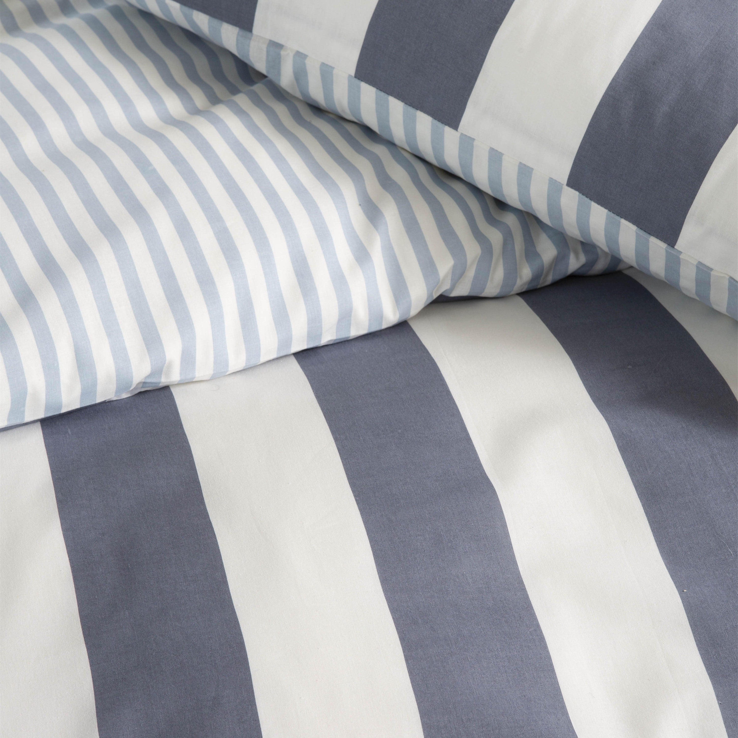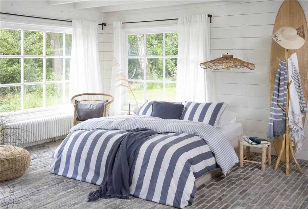 Het dekbedovertrek Classic Stripe doet je helemaal denken aan een dag op het strand. De verticale brede strepen aan de voorkant in een donkerblauwe kleur en subtiele dunne lijntjes aan de achterzijde in een lichtblauwe kleur zijn geïnspireerd op de trend Coastal Living.