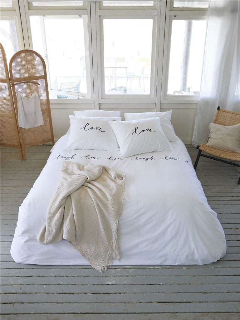 Door de handgeschreven quote ‘Laugh, Live, Love’, word jij iedere dag herinnerd om te lachen, te leven en lief te hebben. Deze sierlijke tekst op het witte overtrek is over de gehele breedte zichtbaar.