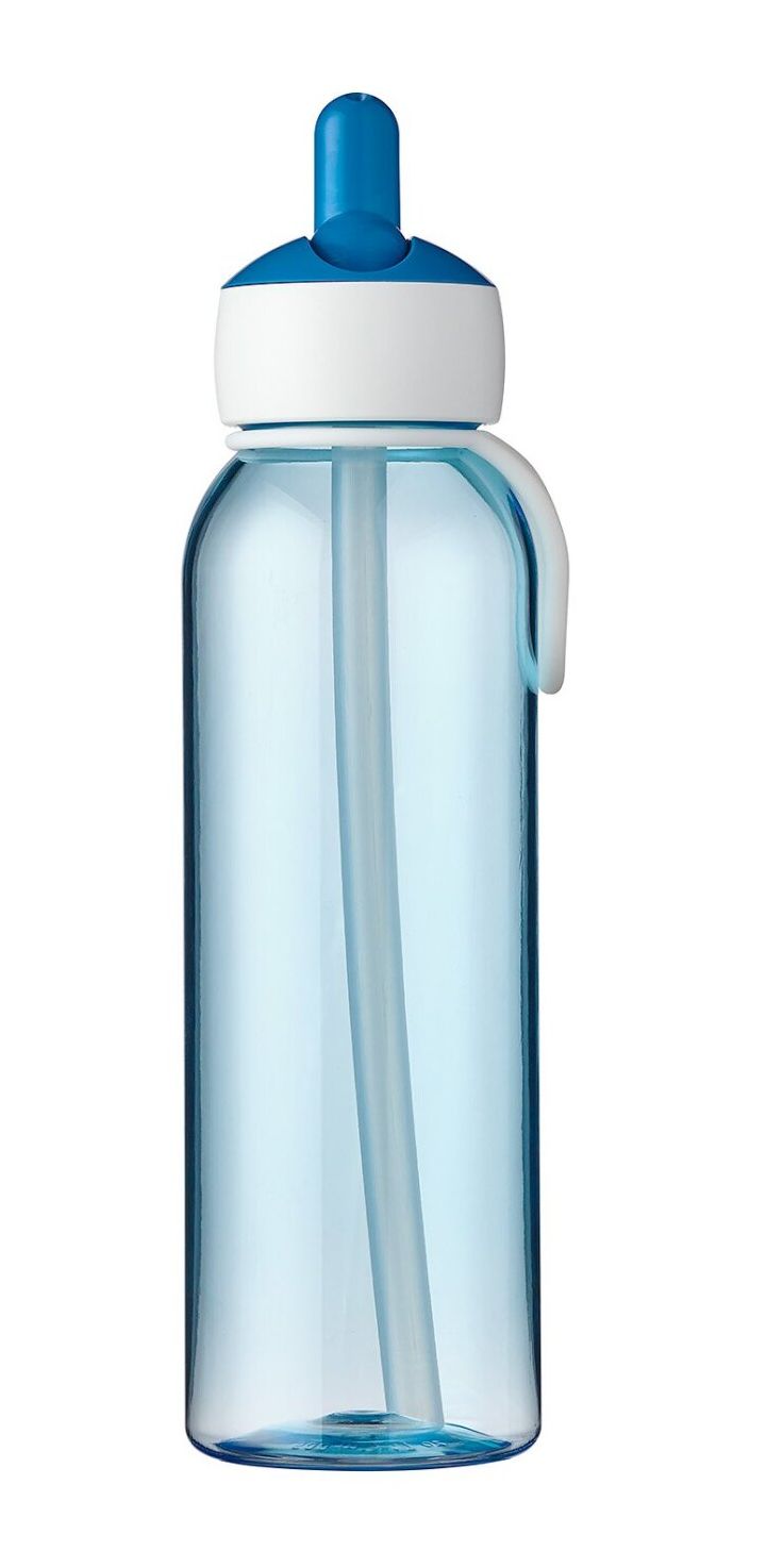 Wordt het tijd dat jouw kind wat meer water gaat drinken? Met deze vrolijke flip-up waterfles in de kleur blauw van Mepal wordt dat een stuk makkelijker! De fles is transparant, waardoor je kind gestimuleerd wordt om de fles leeg te drinken. De waterfles is voorzien van een handig flip-up systeem, waardoor zelfs de kleinste handjes de fles zelf kunnen openen en sluiten: even klikken en drinken maar! De tuit is verbonden met een rietje, dat drinkt lekker makkelijk. De flip-up fles is ook geschikt voor koolzuurhoudende dranken. We raden je aan om bij koolzuurhoudende dranken de fles zonder het rietje te gebruiken. Na gebruik mag de flip-up waterfles gewoon in de vaatwasser. De fles is volledig BPA-vrij en kan tegen een stootje.