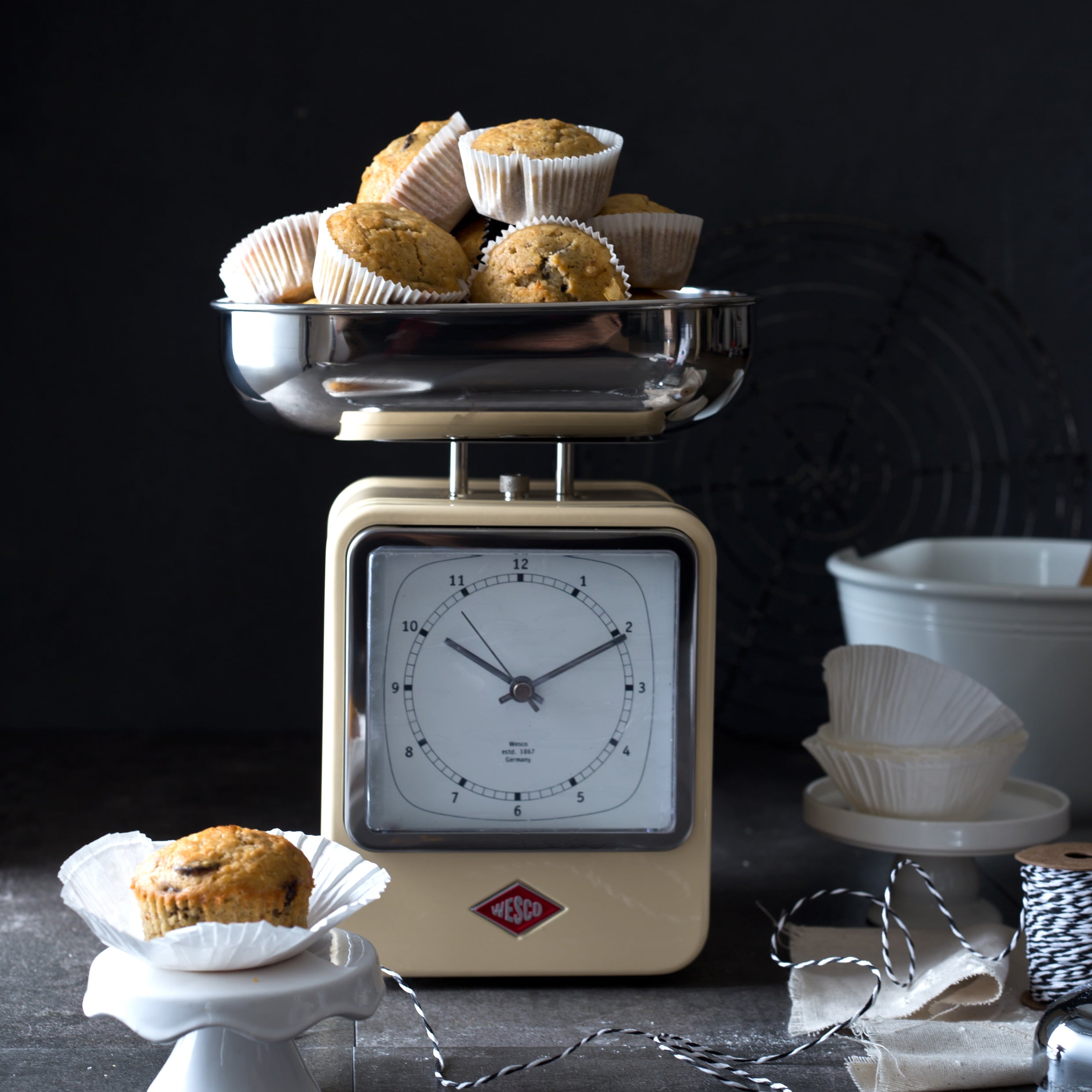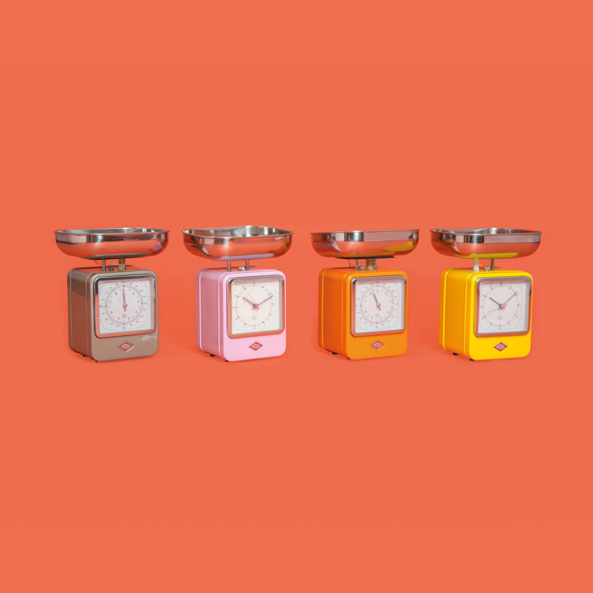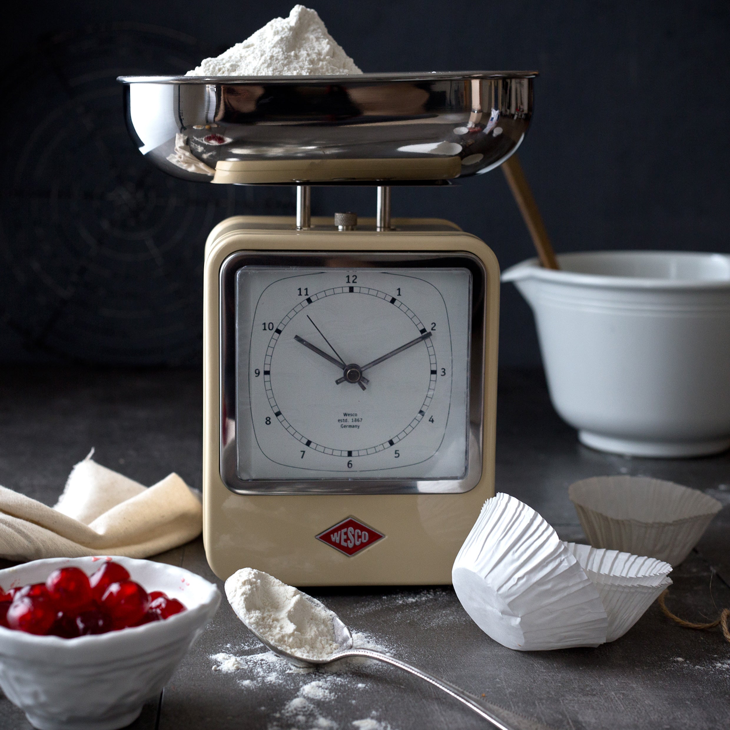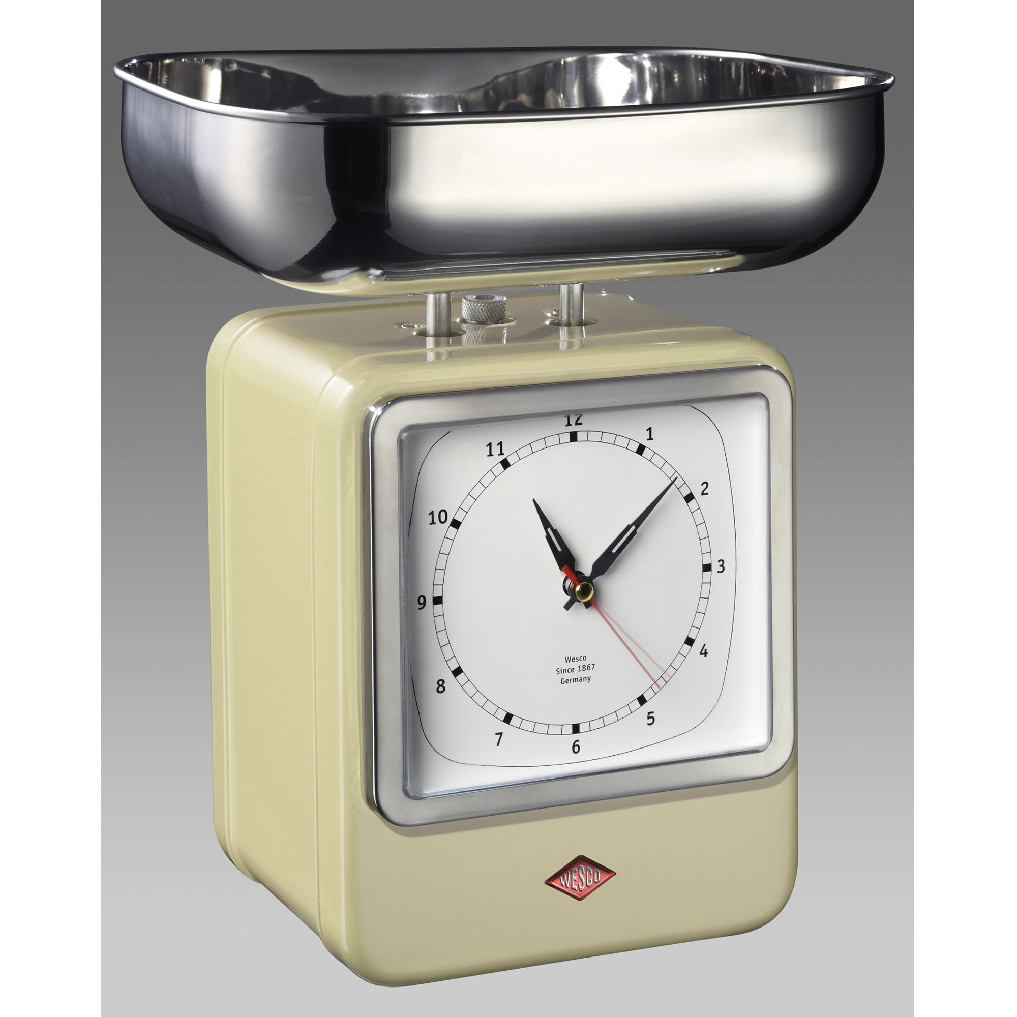 Wesco Keukenweegschaal met klok De retro Wesco keukenweegschaal heeft een meetbereik tot 4 kilo en weegt op de 20 gram nauwkeurig. De analoge weegschaal en klok werken op één AA batterij die is meegeleverd in de doos. De basis van de weegschaal is gemaakt van staal met een poedercoating. Dit maak je met een vochtige doek makkelijk schoon.