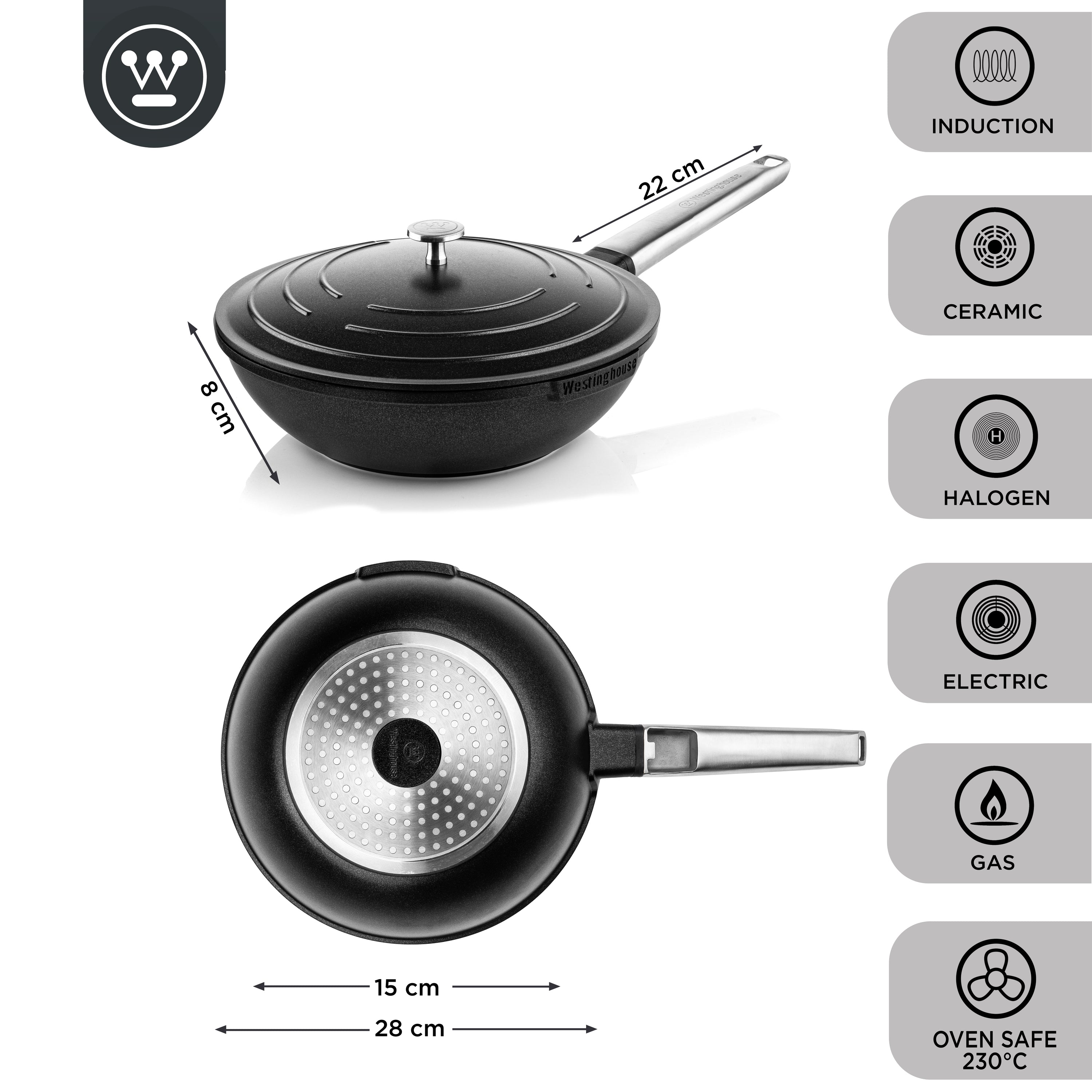 Met deze pannenset maak jij de lekkerste wok- en roerbakgerechten en grill je de lekkerste stukken vlees. Ideaal om een heerlijke steak te bereiden.Lichtgewicht en uitstekende warmtegeleidingAan zware pannen heb je niets, daarom zijn alle pannen van de Westinghouse Performance Series Cookware van lichtgewicht materialen ontworpen. Zo kun je elke pan gemakkelijk uit de kast pakken en verplaatsen in de keuken van bijvoorbeeld het aanrecht naar het fornuis. Ook hebben de Westinghouse pannensets een perfecte warmtegeleiding wanneer de pan op het fornuis of in de oven staat.Koken en bakken moet niet alleen leuk en smakelijk zijn, maar ook efficiënt en veilig.Alle pannen van de Westinghouse Performance Series Cookware hebben een PFOA-vrije anti-aanbaklaag dat geen gifstoffen bevat. Tevens komen er geen schadelijke stoffen vrij tijdens het koken dankzij de speciale QuanTanium coating. Gegarandeerd veilig en smakelijk koken dus! Niet-klevend materiaal en gemakkelijk te reinigen. Daarnaast hebben alle pannen uit de Westinghouse Performance Series een handige en kwalitatieve antiaanbaklaag die lang mee gaat, waar geen eten of etensresten aan blijft plakken of kleven tijdens het koken. Ook is de gehele pannenset makkelijk schoon te maken en kunnen de pannen in de vaatwasser of vaatwasmachine. Bij deze pannenset van Westinghouse maakt het niet uit wat voor fornuis of oven je hebt. De pannen van de Westinghouse Performance Series Cookware zijn namelijk geschikt voor de gaskookplaat, elektrische kookplaat, keramische kookplaat, inductiekookplaat en de halogeen kookplaat. Daarnaast kunnen de pannen in elk soort oven tot 220 Celsius, van bakoven tot heteluchtoven en van combi-oven tot stoomoven.Pluspunten• Veelzijdig en multifunctioneel: koken, bakken, braden, stomen, grillen, wokken met één pannenset• Uniek en speciaal design: meerdere lagen kwalitatief materiaal voor veilig en efficiënt koken• Premium anti-aanbaklaag: PFOA-vrij, dus géén gifstoffen dankzij QuanTanium coating• Gegoten aluminium: geen zwaar gietijzer, maar lichtgewicht aluminium dat 3x sneller warm wordt