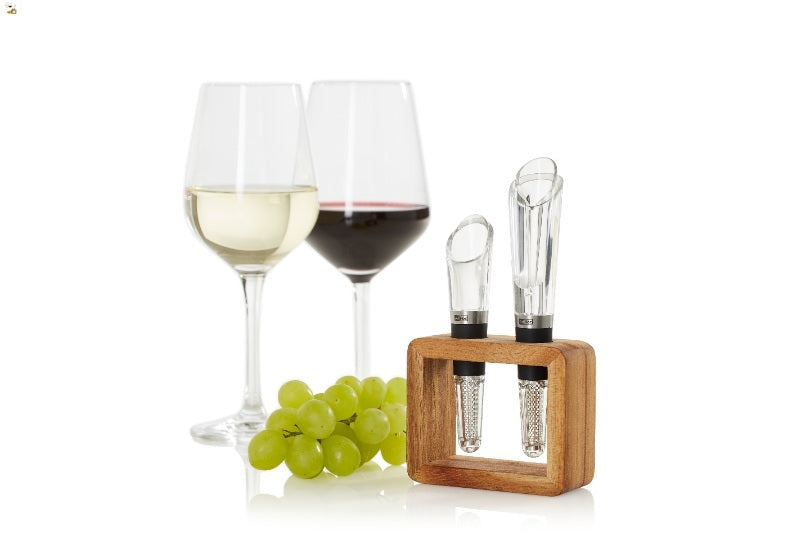 Er zijn veel mensen die graag van een goed glas wijn willen genieten. En om ieder glas wijn zo goed mogelijk tot zijn recht te laten komen heeft iedere soort wijn zijn eigen behandeling nodig. Met deze extra aandacht kan de smaak van de wijn optimaal ontwikkelen. Deze wijnschenker set met houder van AdHoc is met deze gedachten ontwikkelt. In de set vind je een Vine wijnschenker -en filter voor witte wijn, een Airovin wijnbeluchter -en schenker voor rode wijn en een houder van acaciahout.