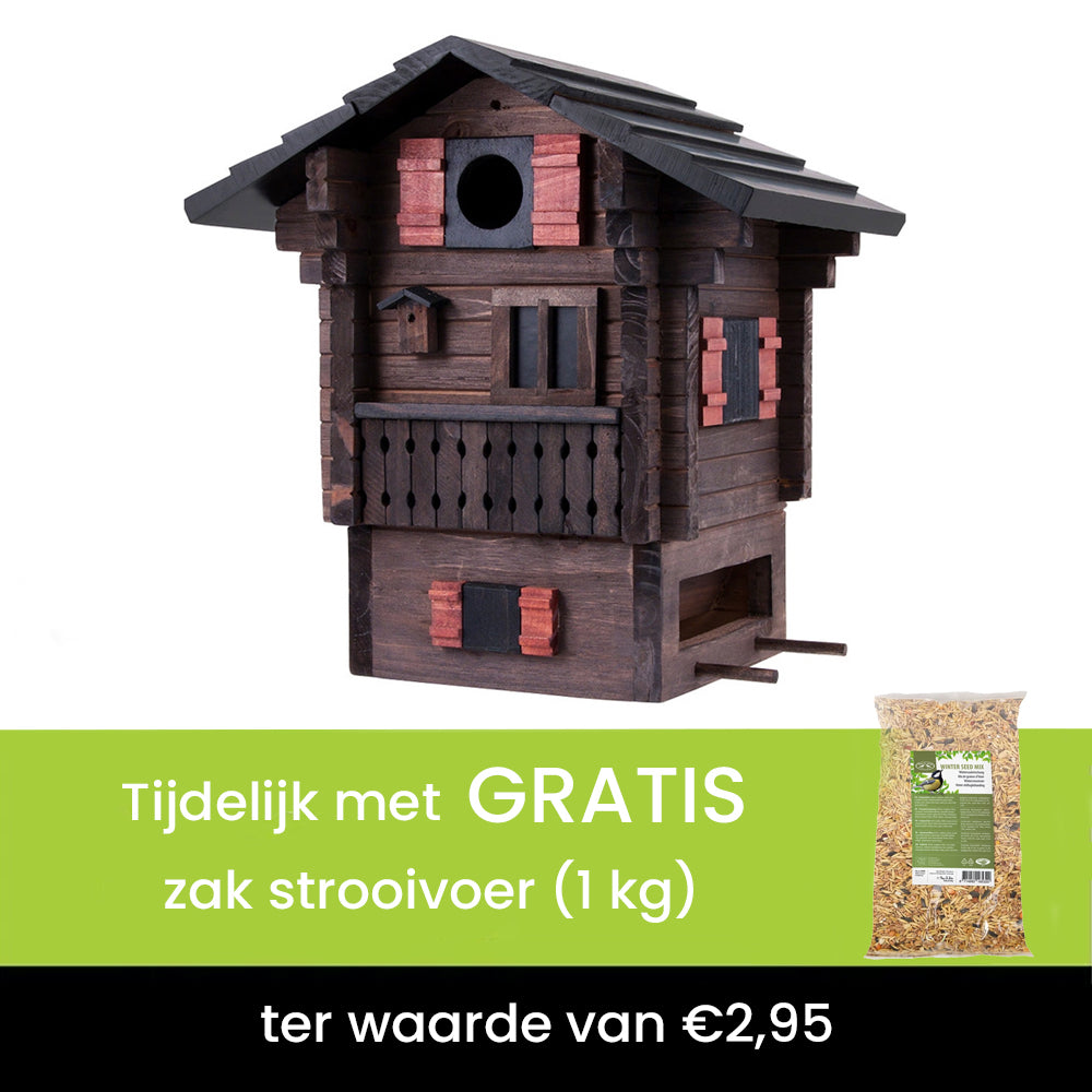 Het Multiholk Fjällstugan is een combinatie van een vogelhuisje en een voederhuisje. Dit huisje heeft een award gekregen voor het meest innovatieve, decoratieve en functionele tuinproduct. Het is hoogwaardig afgewerkt en voorzien van vele details net als de Scandinavische bouwstijl. U kunt het multiholk ook alleen als voederhuis laten dienen. Dit kan door de invliegopening af te sluiten. Het dak is afneembaar, waardoor u eenvoudig het vogelzaad kunt bijvullen. Het voedergedeelte bevat een 2-liter reservoir voor vogelzaad. Grote vogels kunnen niet landen op het voedergedeelte en dit maakt het voederhuis een veilige plek voor kleine vogels. Het vogel/voederhuis heeft een afmeting van circa 18.5 x 19.5 x 24.5 centimeter (lxbxh).