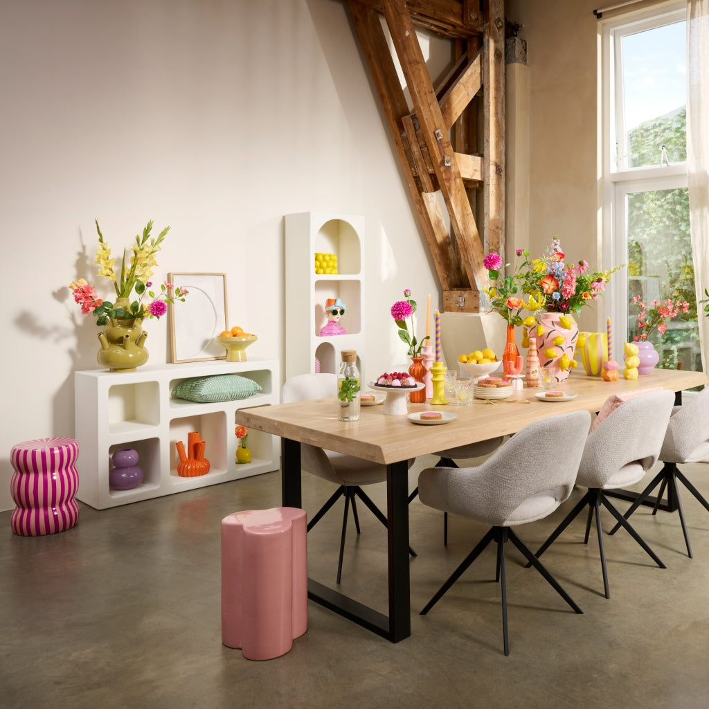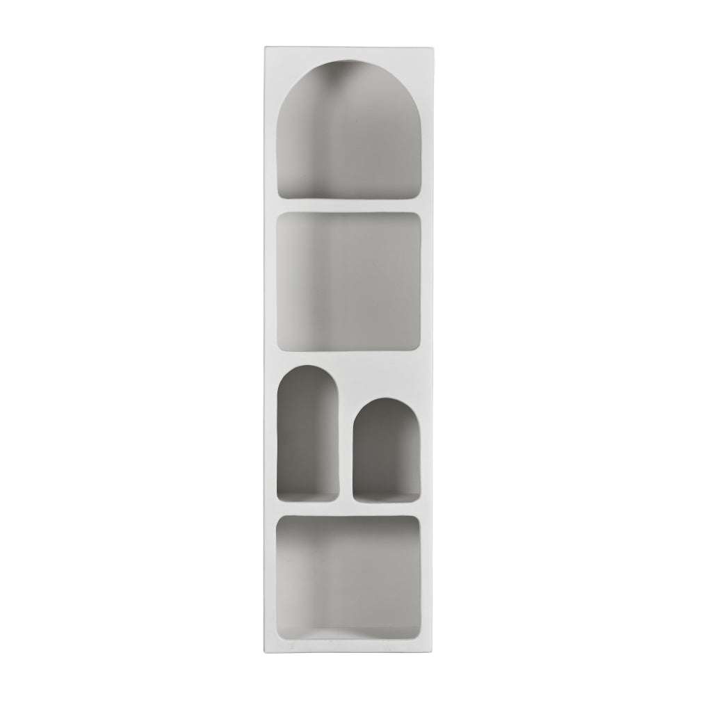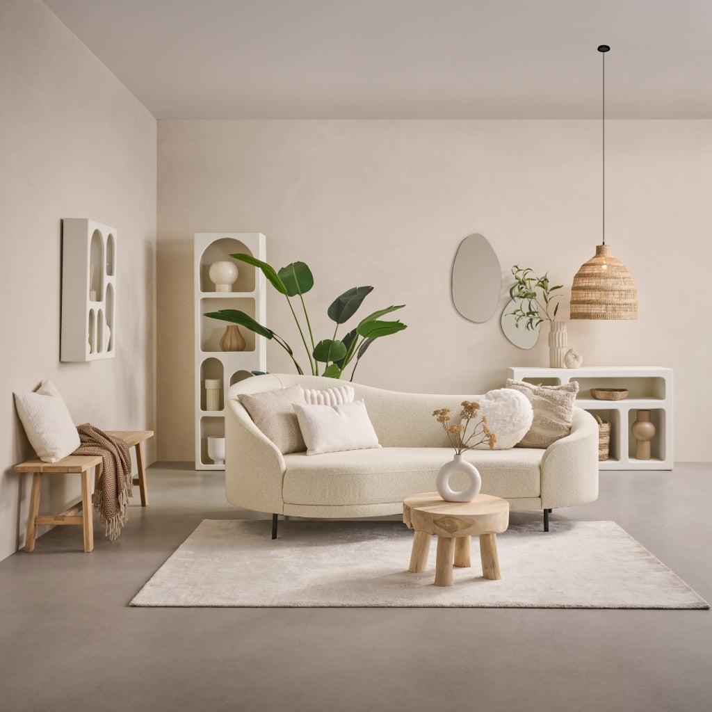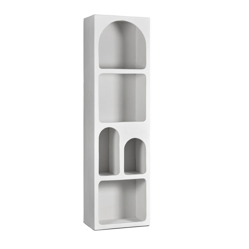 De Foza kast straalt een onmiskenbare stijl uit, die vraagt om eenvoud. Een paar fraaie vazen, een plant en een dierbare foto volstaan om de uitstraling compleet te maken. De hoge wandkast is voorzien van vakken met unieke, organische vormen en is afgewerkt met een melkwitte kalkpleister. Hiermee creëer je moeiteloos een minimalistische sfeer, perfect voor zowel een Scandinavisch interieur als een strakke, moderne woonstijl. Indeling:| Afmetingen | |