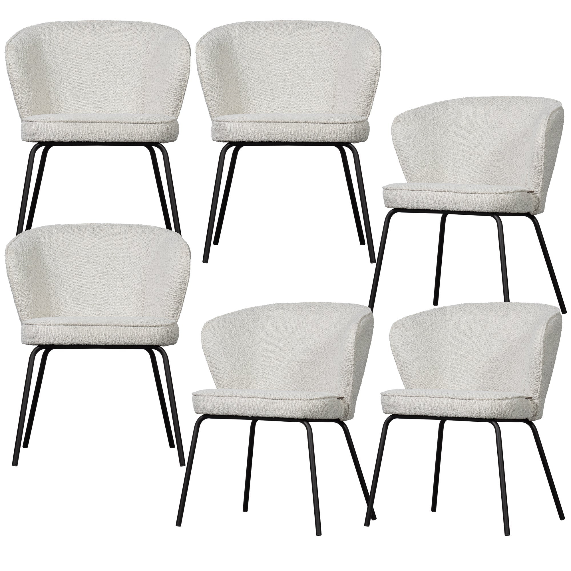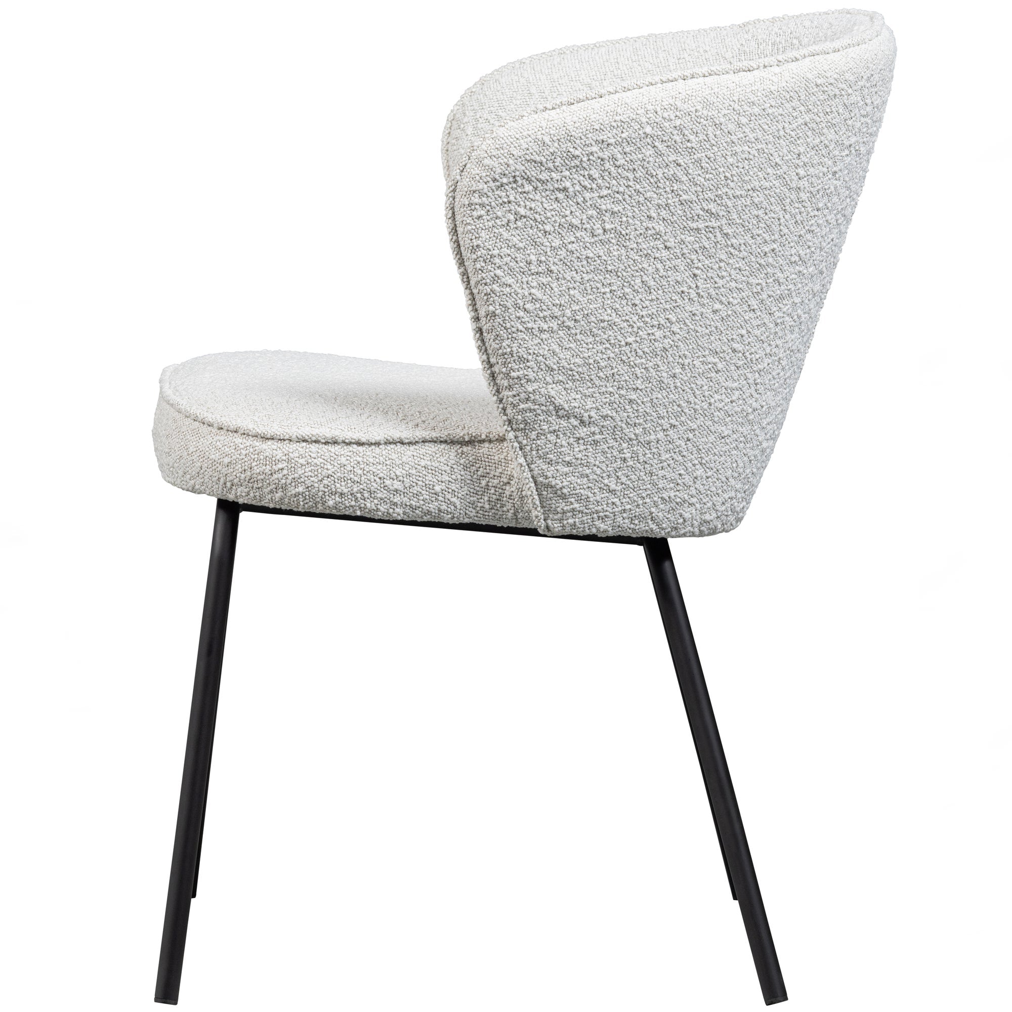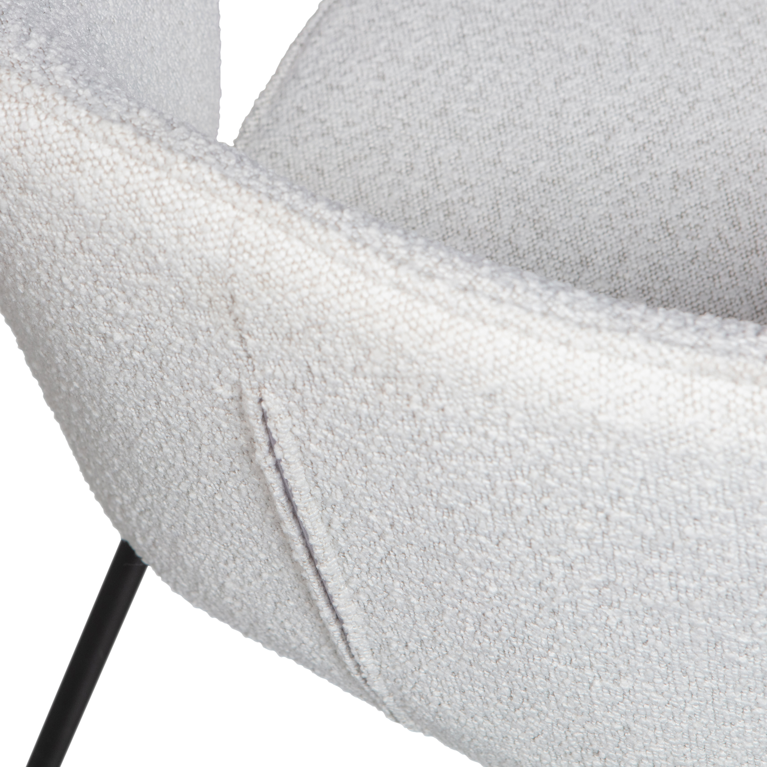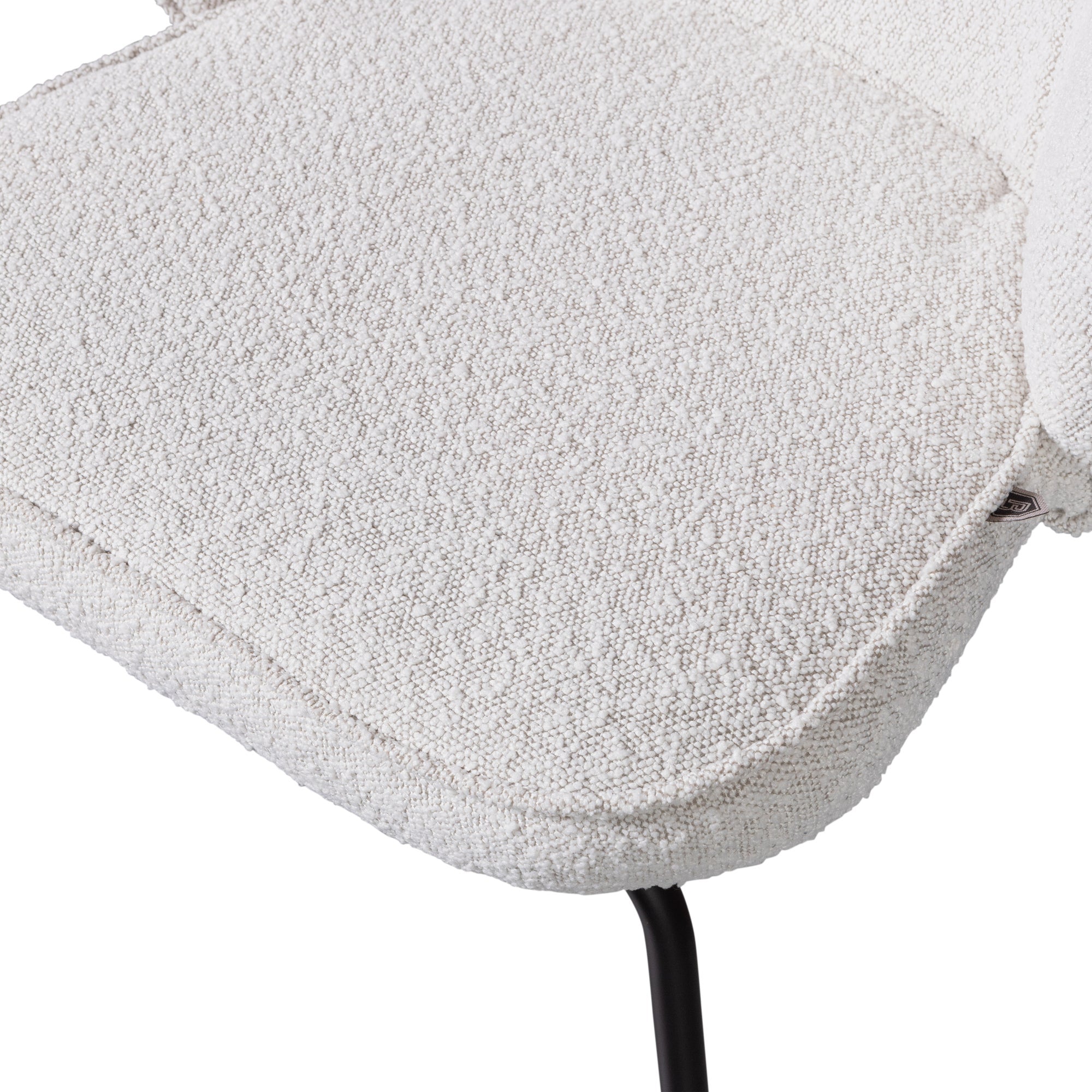 Het onderstel is gemaakt van matzwart metaal, wat de eetkamerstoel een tijdloze uiterlijk geeft. Het zitgedeelte is gestoffeerd met onze zachte Colmar bouclé stof. Het materiaal van de Colmar bouclé stof speelt in op de laatste trend: zachte materialen. De stof is zacht en heeft een elegante textuur die meteen warmte in huis brengt. Onze Colmar bouclé stof heeft een Martindale van 100.000, dat betekent dat de stof geschikt is voor intensief gebruik. De dichte weeftechniek zorgt voor de sterkte van de stof, dit maakt dat de bouclé niet snel zal slijten of scheuren. Ook heeft elke kleur een hoge kleurvastheid, maar het is aangeraden om direct zonlicht te vermijden om kleurnuances te voorkomen.