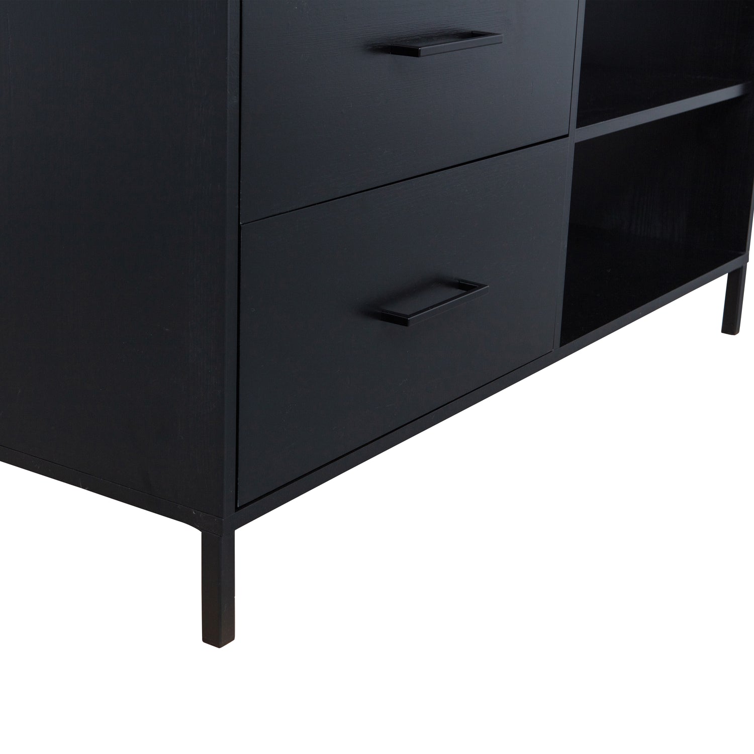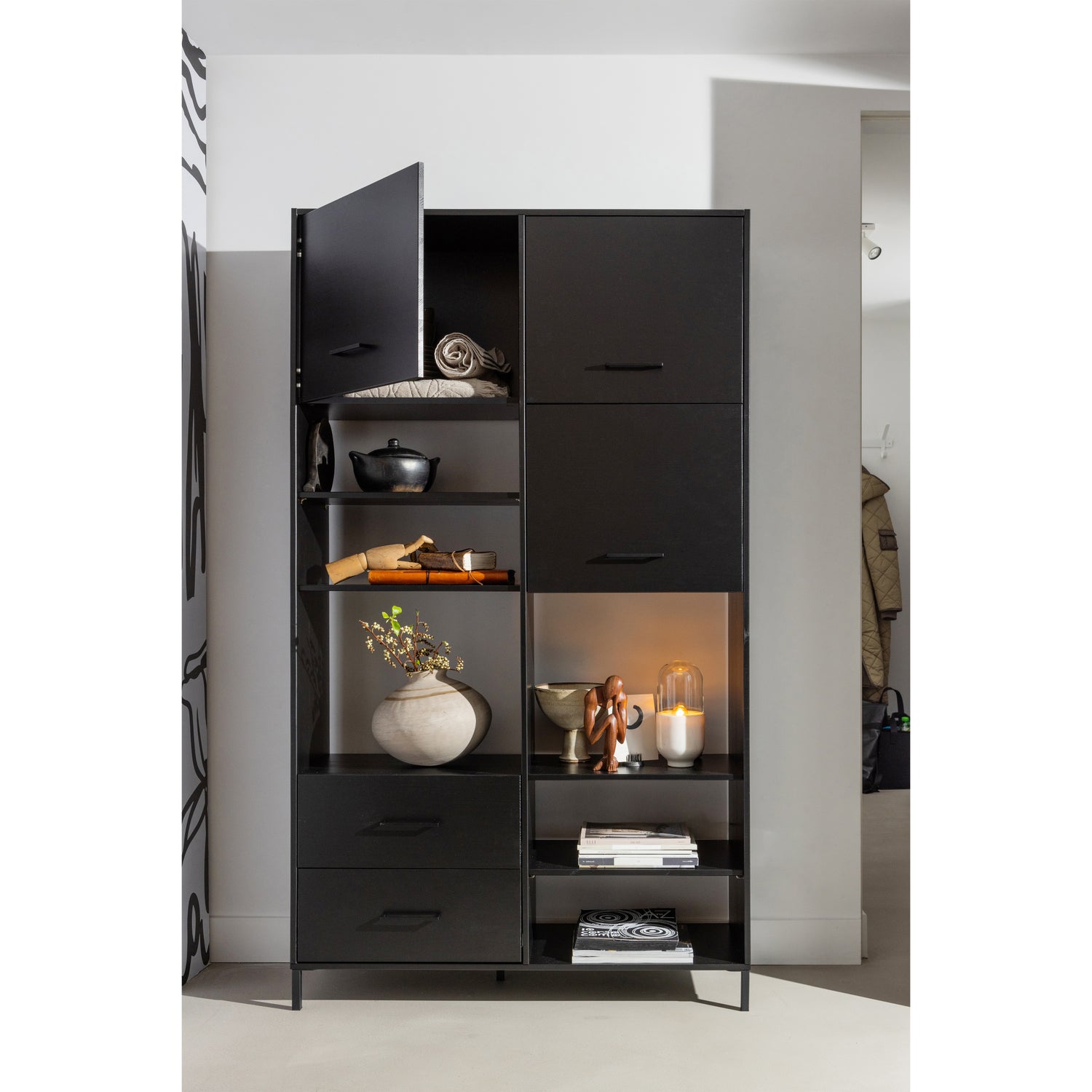 De royale Aiko vakkenkast, uit de collectie van het Nederlandse interieurmerk WOOOD, is vervaardigd uit FSC-gecertificeerd grenenhout met een diepzwarte afwerking. De combinatie van open- en dichte vakken zorgt voor een speels doch stijlvol geheel, een zee van ruimte voor jouw mooiste accessoires.