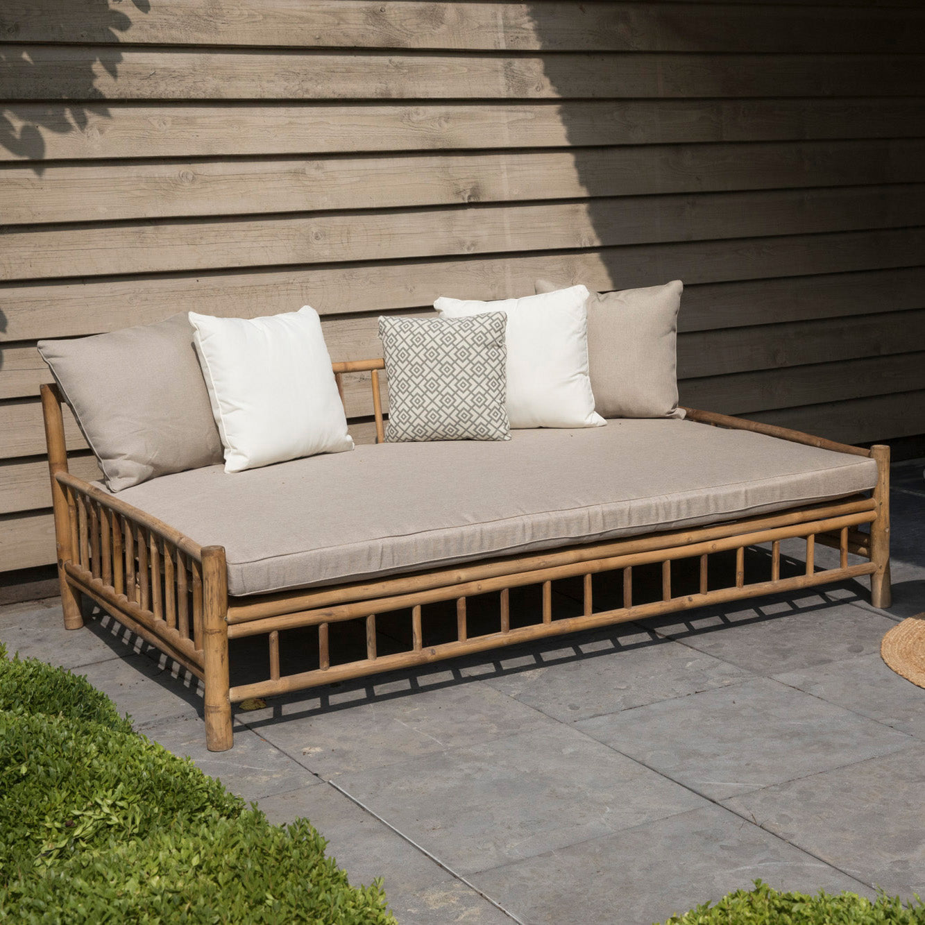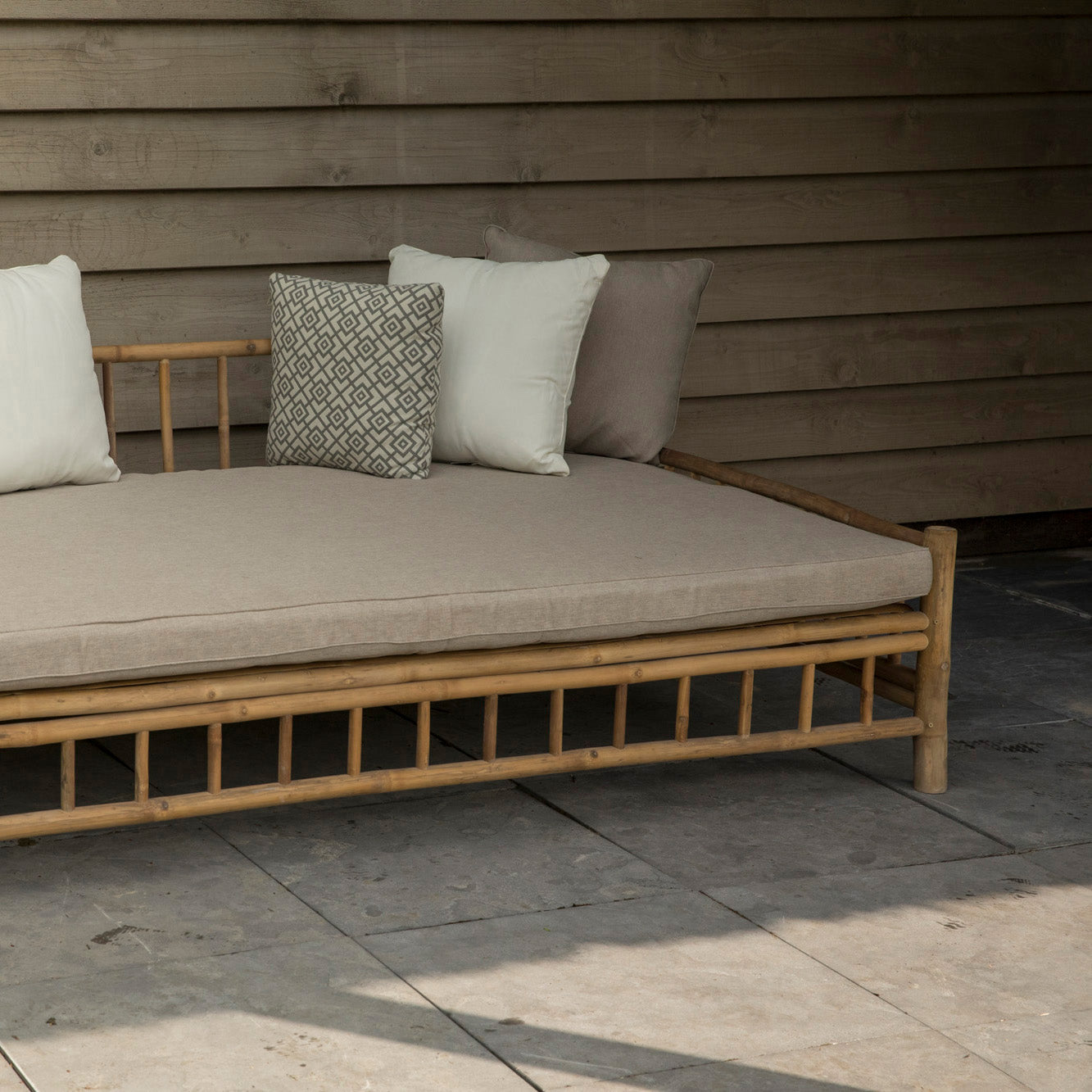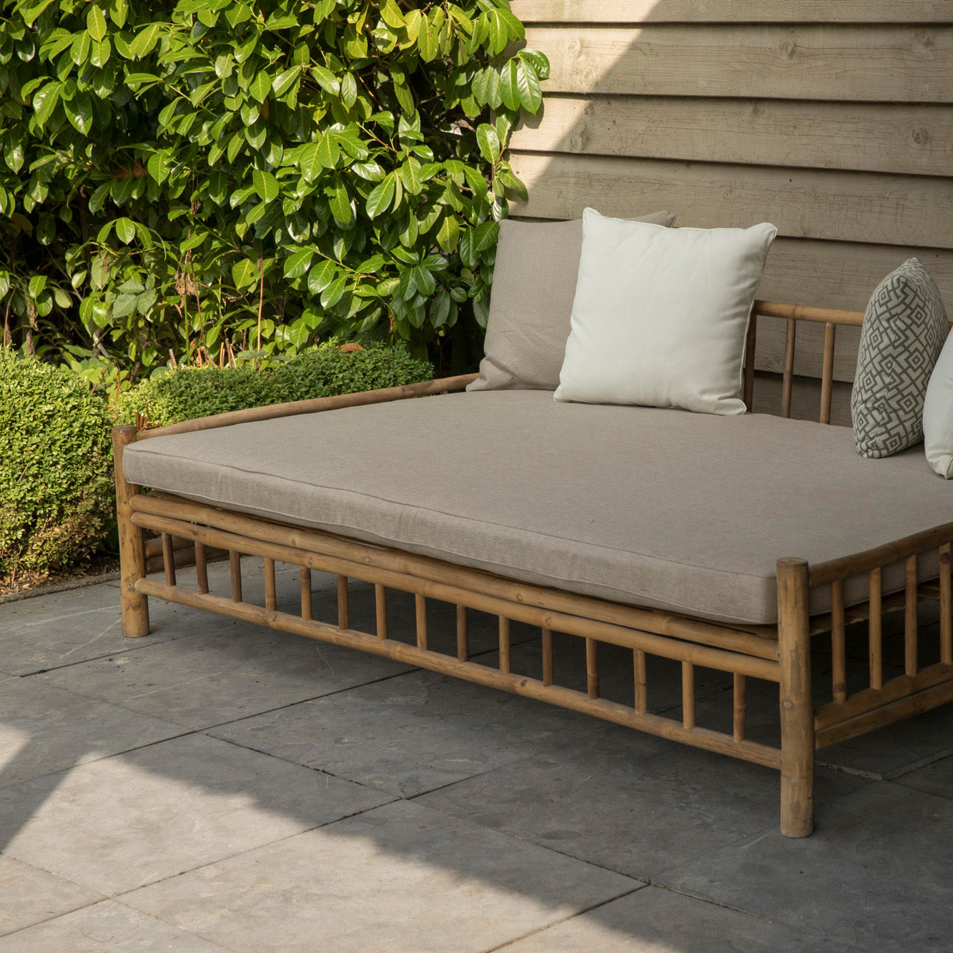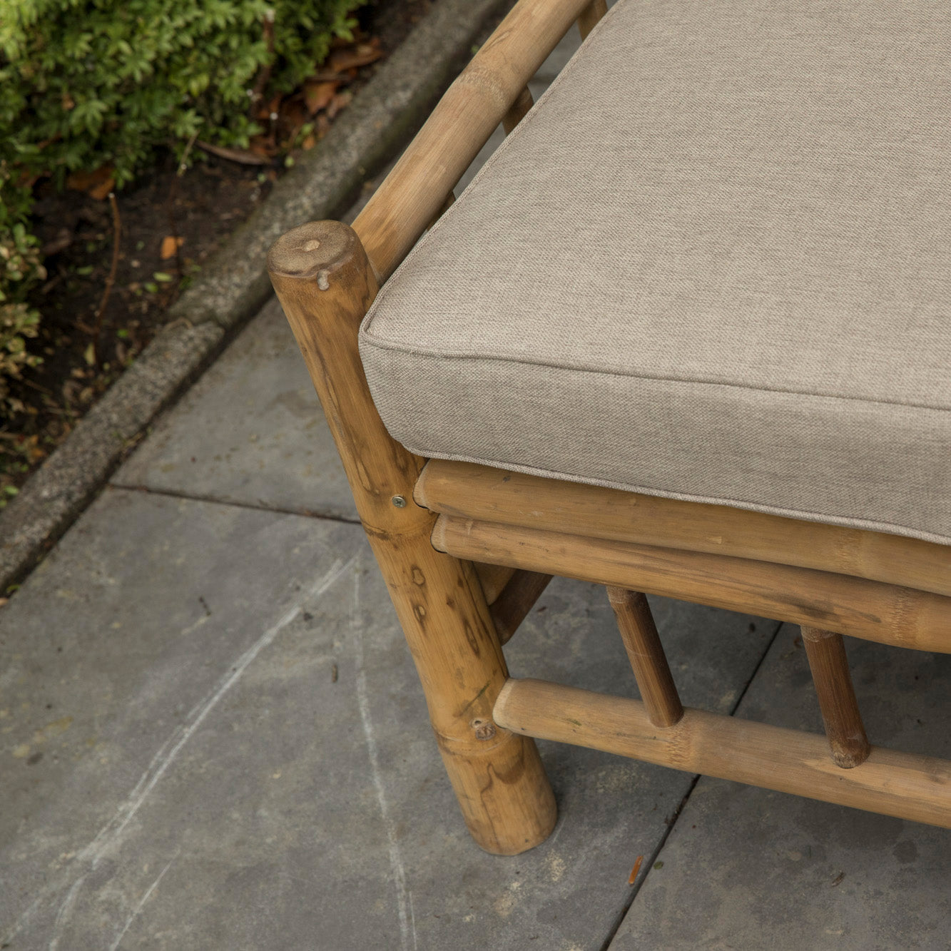 De WOOOD Bamboo loungeset is een echte eyecatcher die je terras nog meer laat stralen. De loungeset is gemaakt van bamboe. Bamboo is een natuurproduct wat reageert op diverse weersinvloeden. Na verloop van tijd zal het dan ook gaan verkleuren en kunnen er haarscheurtjes ontstaan. Dit is niet te voorkomen en wordt dan ook gezien als de charme van het product. Deze verschijnselen doen geen afbreuk aan de kwaliteit van de Bamboo loungeset. De comfortabele kussens van de Bamboo loungeset zijn voorzien van een sterke buitenstof en de vulling is voorzien van standaard foam. De kussens kunnen daarom niet buiten blijven liggen. Wij adviseren dan ook om de kussens na gebruik op een droge en geventileerde plek op te bergen. Bijvoorbeeld in de schuur of een opbergbox. De hoezen van de kussens zijn afneembaar zodat je ze met de hand kunt wassen. Om zo lang mogelijk te genieten van je Bamboo tuinmeubelen adviseren wij om 2x per jaar (april en oktober) de tuinmeubelen te behandelen met een Bamboo protector.