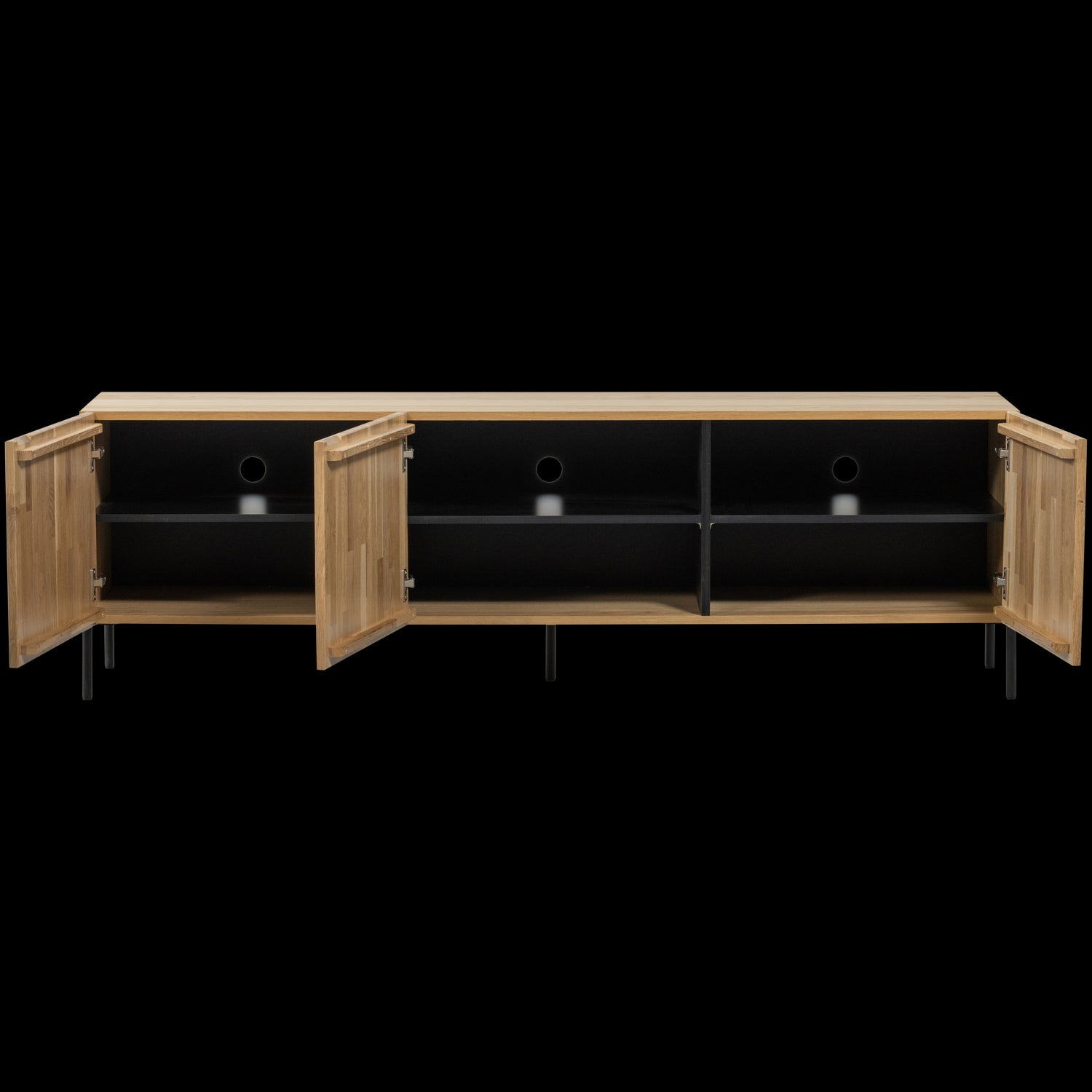 Afmetingen Hoogte: 56 cm Breedte: 180 cm Diepte: 46 cm Afmetingen vakken: H 37,6 cm x B 57,7 cm x D 43,6 cm Poothoogte: 15 cm Gewicht: 34,4 kg Draaggewicht per plank: 10 kg Draaggewicht bovenblad: 30 kg