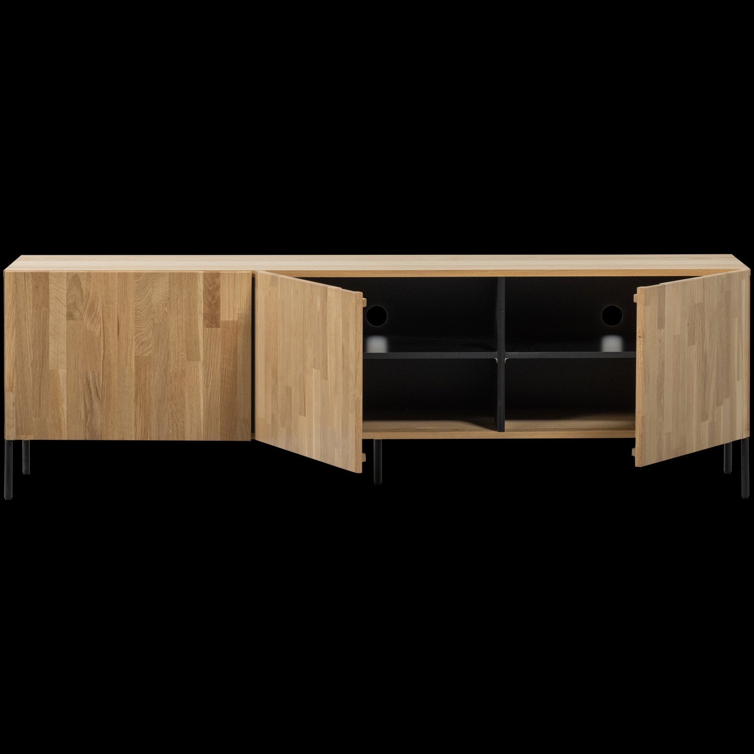 Een tijdloos design, een warme natuurlijke houtkleur en royale opbergruimte: dat zijn de kenmerken van het Bono TV-meubel. Het is een stijlvolle toevoeging aan ieder interieur uit de collectie van het Nederlandse interieurmerk WOOOD. Dit tv-meubel is vervaardigd uit eikenhout en heeft een gebeitste afwerking, waardoor er verschillen in kleur en nerftekening kunnen voorkomen. Dit maakt ieder meubel uniek! Achter de drie kastdeuren biedt het meubel volop opbergruimte. De binnenruimte is slim verdeeld met een legplank, waardoor je moeiteloos je media-apparatuur, accessoires en andere essentials kwijt kunt.