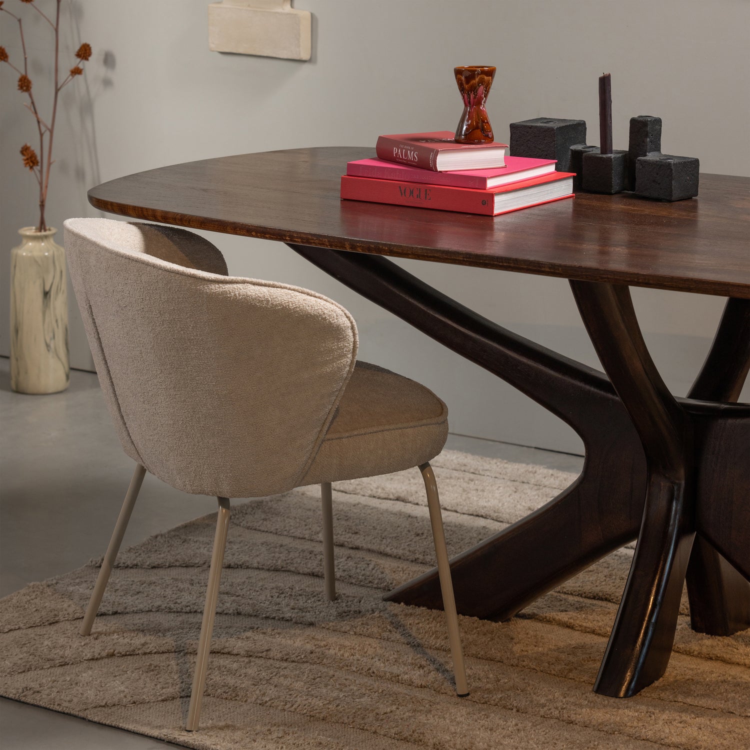 De Bridge eettafel komt uit de collectie van het Nederlandse interieurmerk WOOOD. Het grove design in combinatie met de warmgekleurde walnootfinish geeft een stoere, robuuste uitstraling aan het artikel. De massieve kruispoot biedt ruimte om vrij te zitten aan de tafelranden, wel zo praktisch! Een bolt statement! Materiaal
