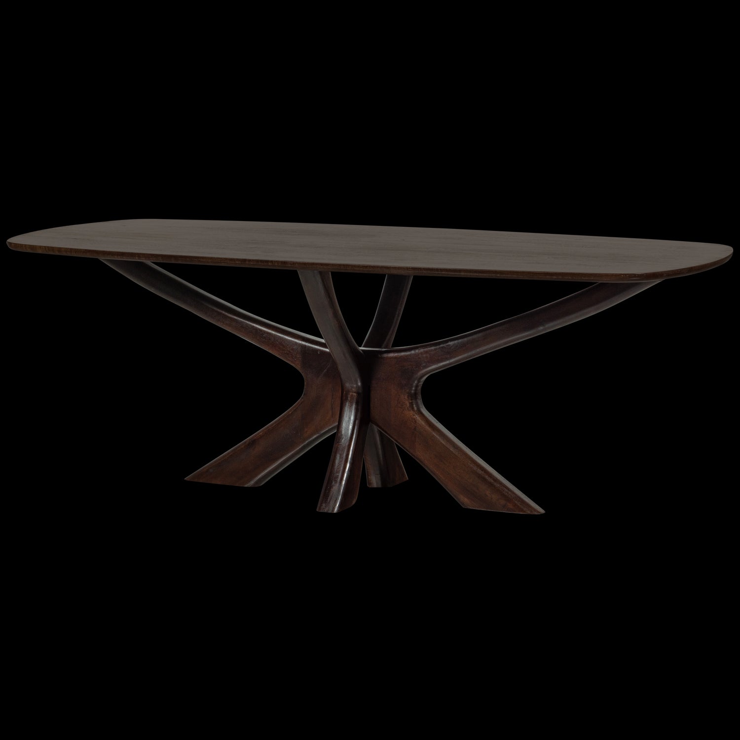 De Bridge eettafel komt uit de collectie van het Nederlandse interieurmerk WOOOD. Het grove design in combinatie met de warmgekleurde walnootfinish geeft een stoere, robuuste uitstraling aan het artikel. De massieve kruispoot biedt ruimte om vrij te zitten aan de tafelranden, wel zo praktisch! Een bold statement!