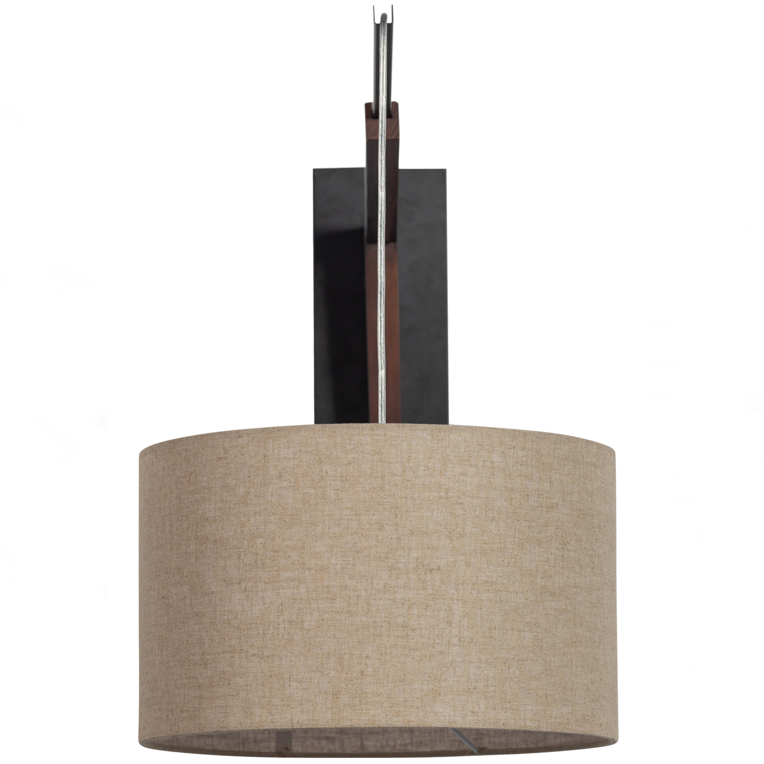 De wendbare muurlamp is opgebouwd uit een combinatie van walnootkleurig hout en matzwart metaal. De lampenkap is gevormd uit matwit kunststof, bekleed in een zandkleurige linnenlook.
