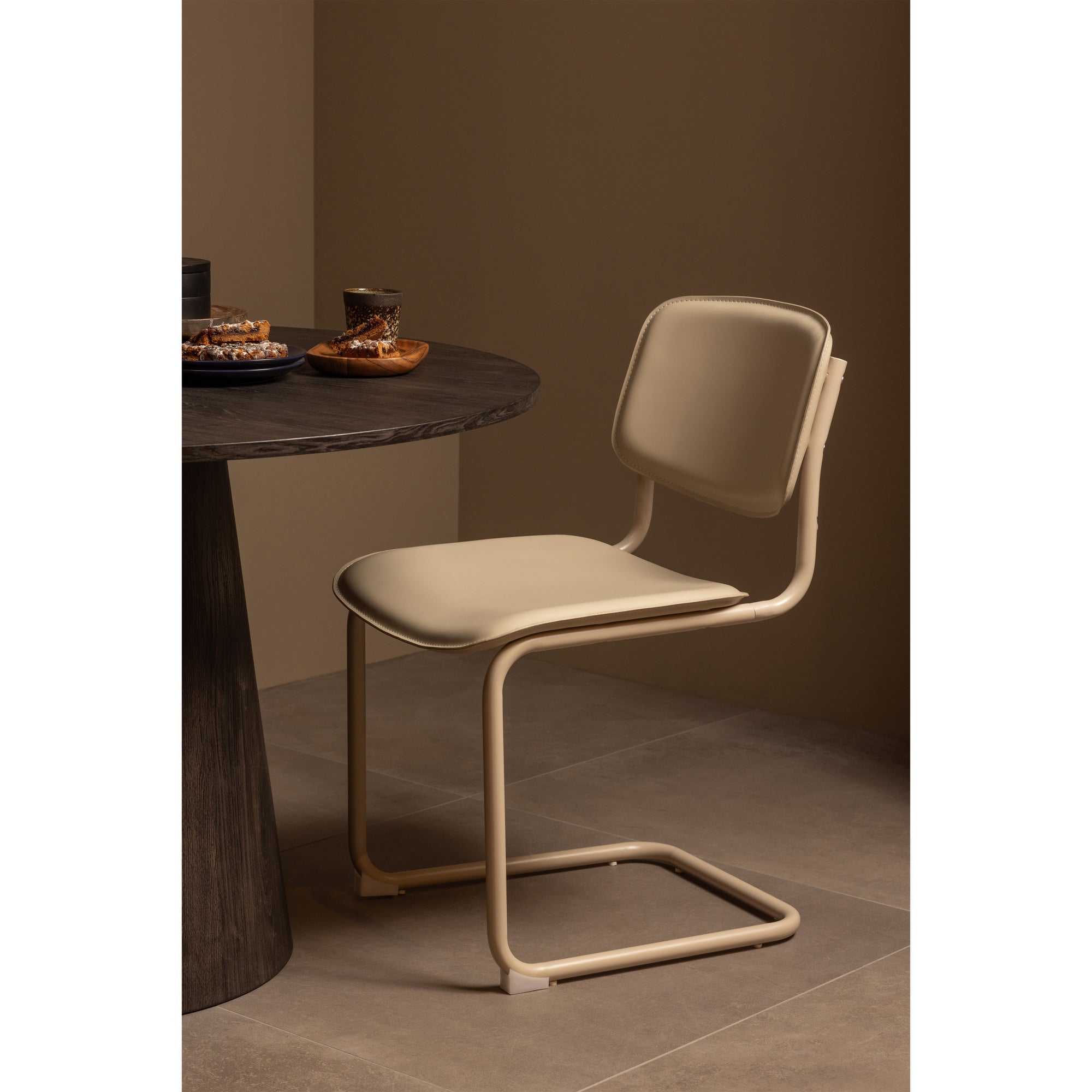 Urenlang tafelen is waar de Cody eetkamerstoel prima voor kan zorgen. De eetkamerstoel, uit de Exclusive collectie van het Nederlandse merk WOOOD, heeft een stijlvol design. De gebogen lijnen van het buisframe in combinatie met de matte lederlook zorgen voor een mooi contrast. Een echte blikvanger! Materiaal