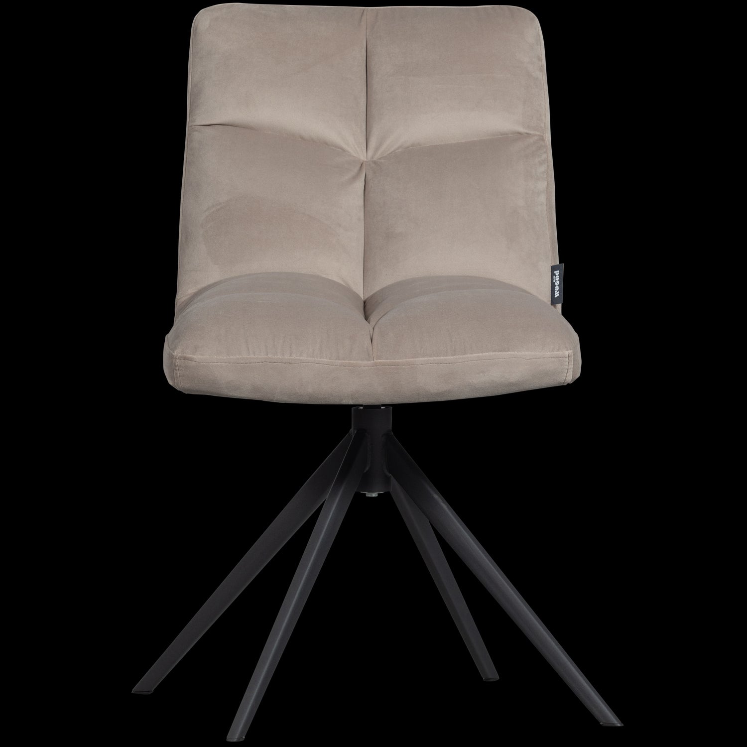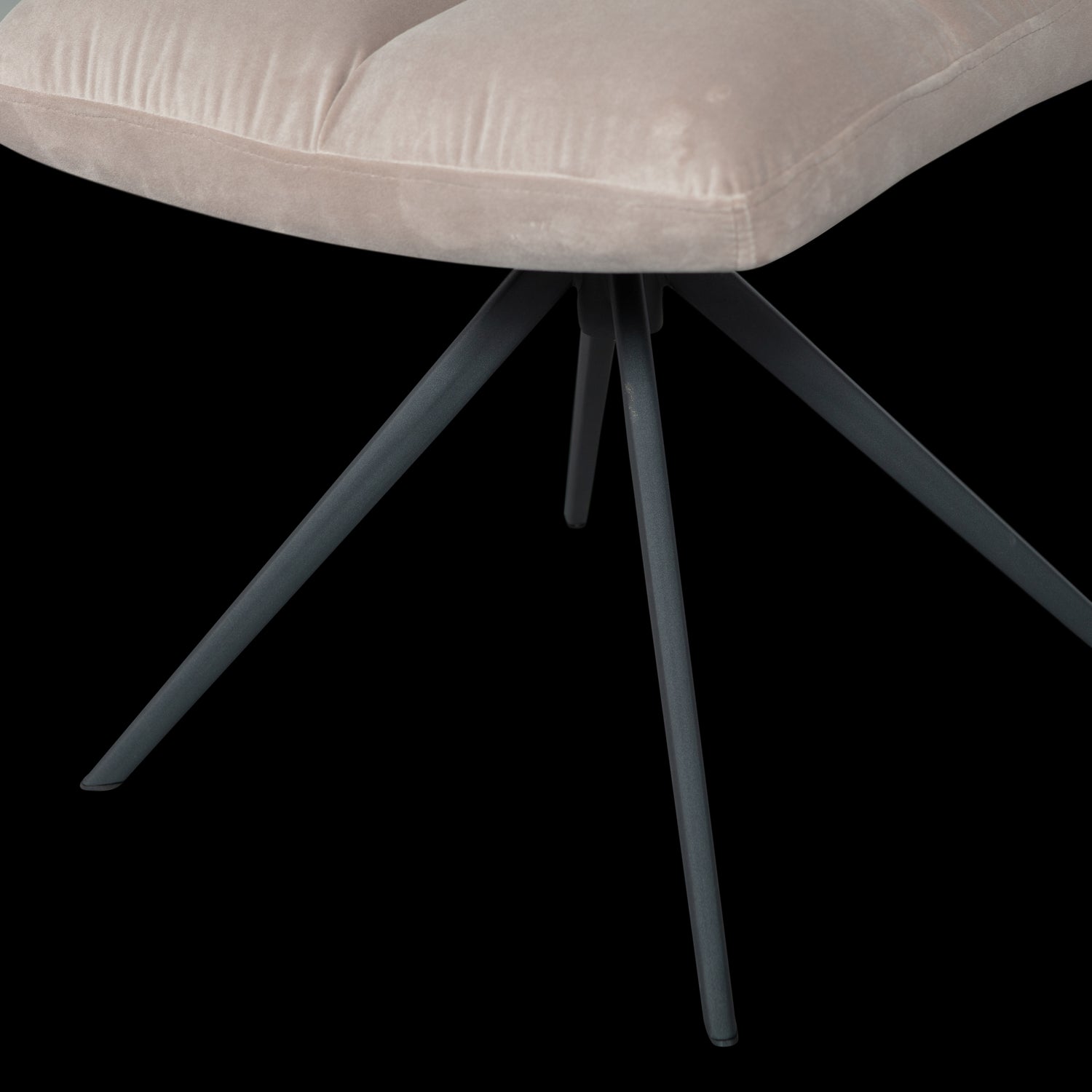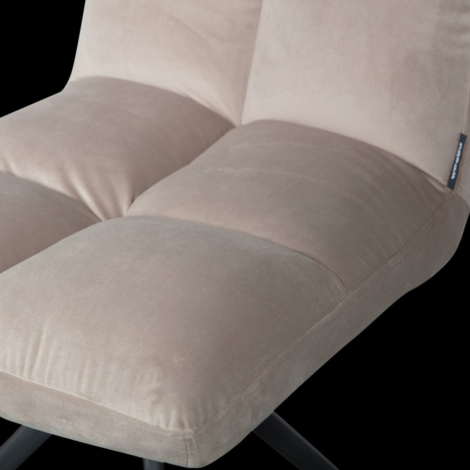 Vinny is bekleed met een matglanzende velvet. De samenstelling van 100% polyester maak de draaifauteuil zeer eenvoudig in onderhoud. De Vinny heeft een zwart, metalen onderstel met vier poten en een soepel draaisysteem. De polyurethaan schuimvulling geeft een hoog zitcomfort en is dus perfect voor eindeloos lang tafelen!