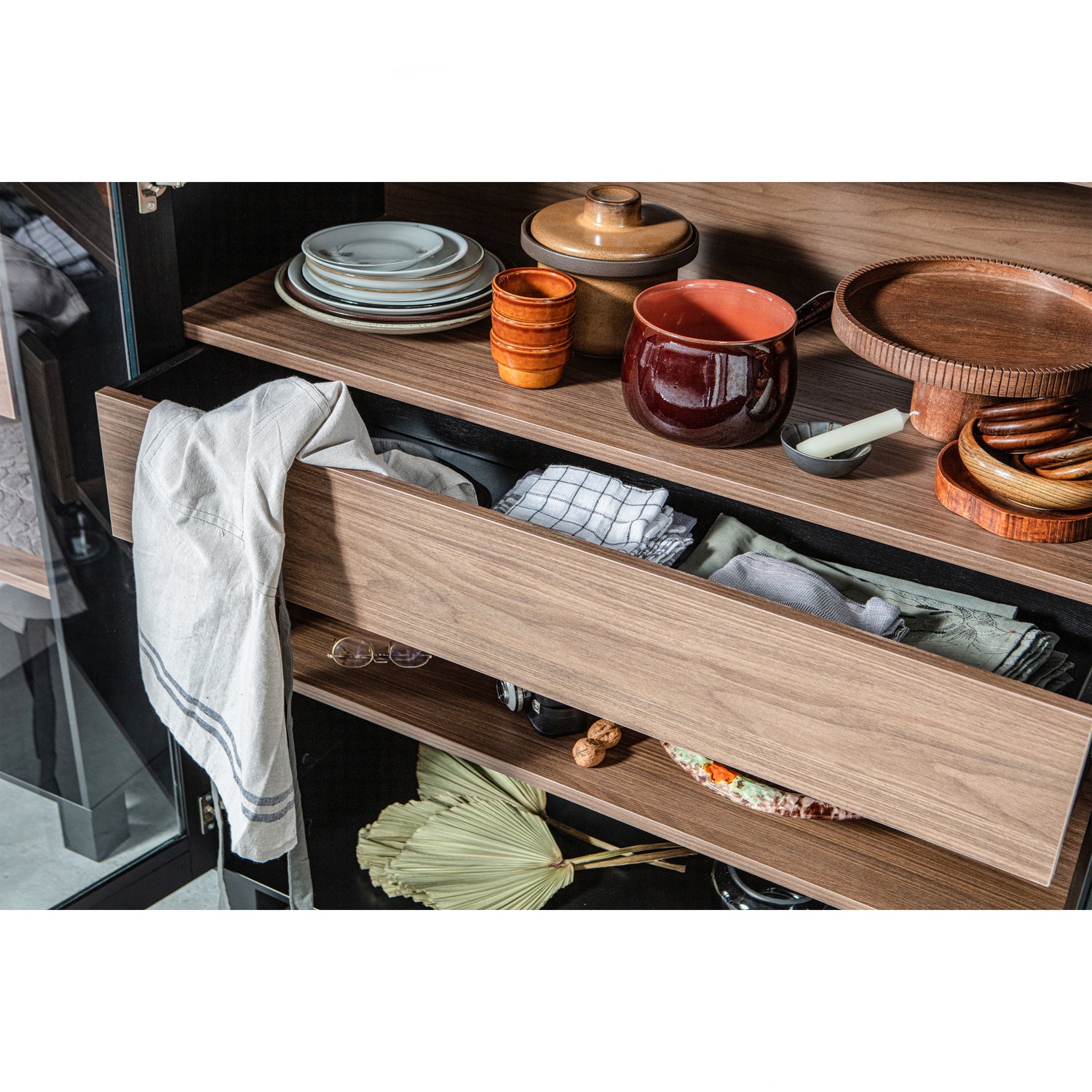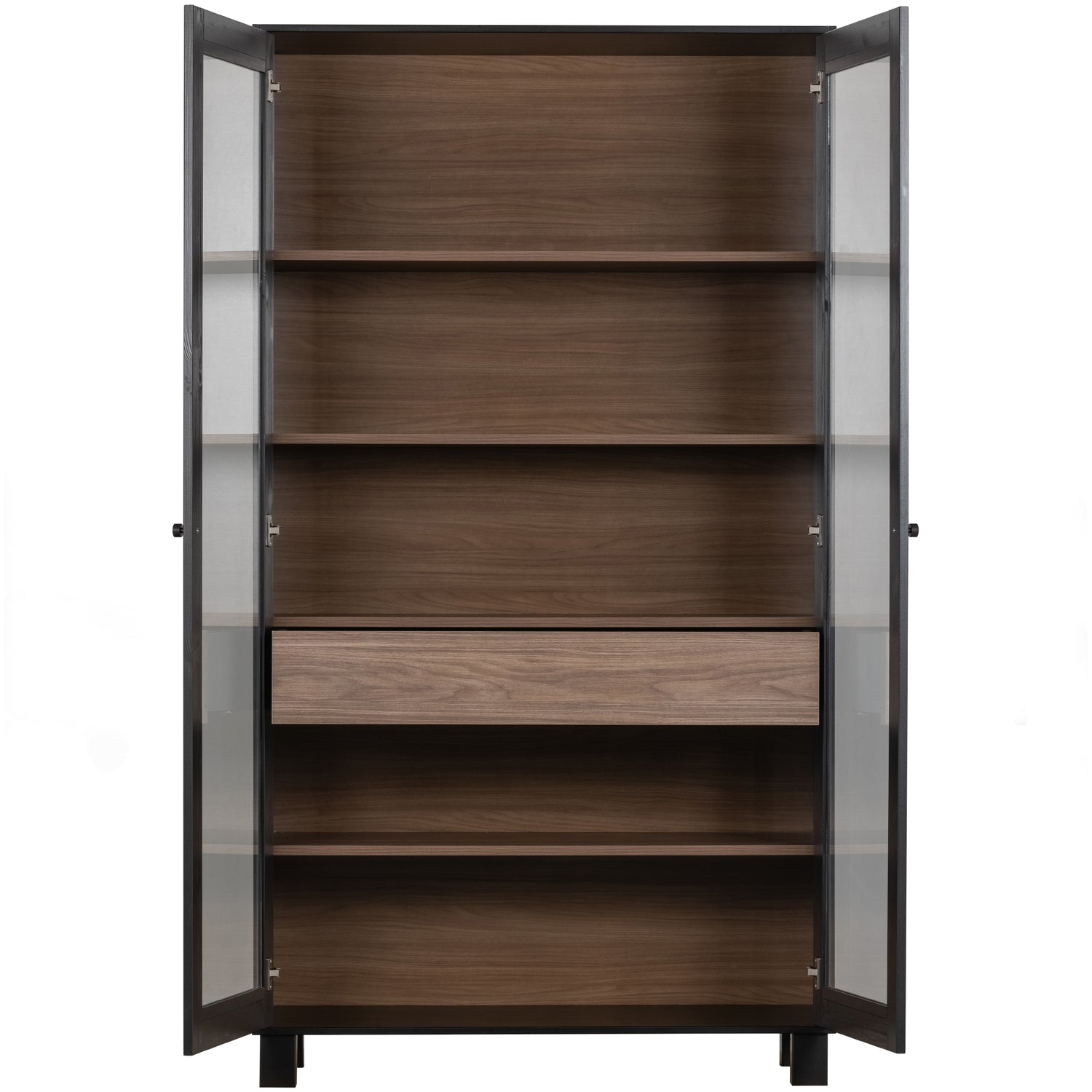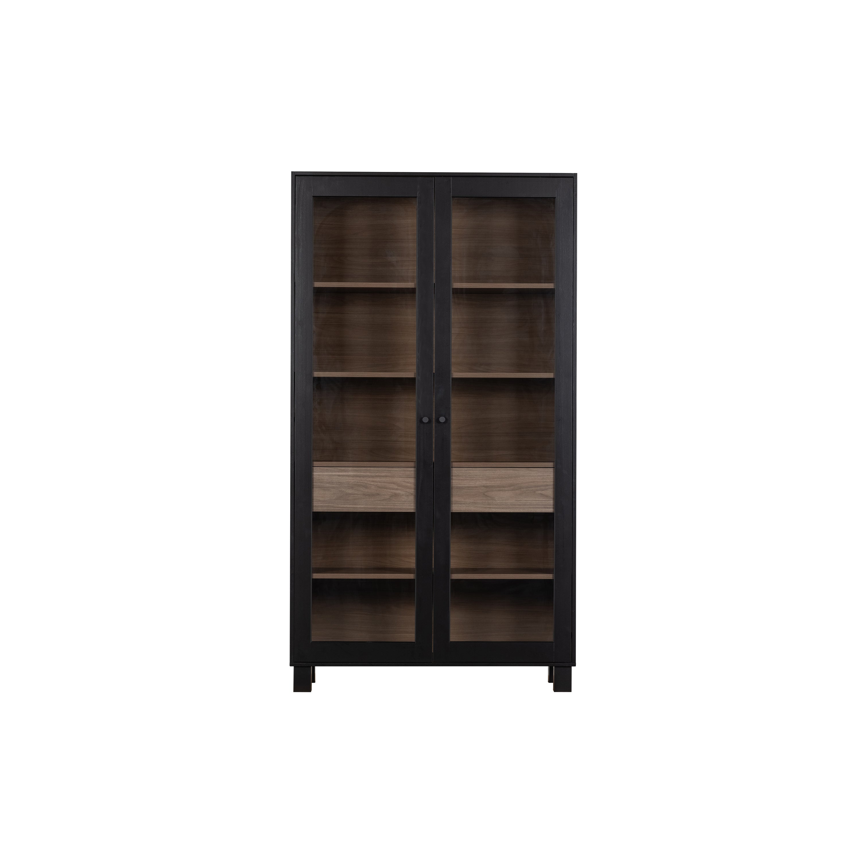 De Goos 2-deurs vitrinekast is een stoere eyecatcher in ieder interieur. De royale vitrinekast is een item uit de collectie van het Nederlandse merk WOOOD. Goos is vervaardigd uit grenenhout met een matzwarte buitenzijde. De warmgekleurde binnenzijde van walnootfineer zorgt voor een unieke twist aan het design.
