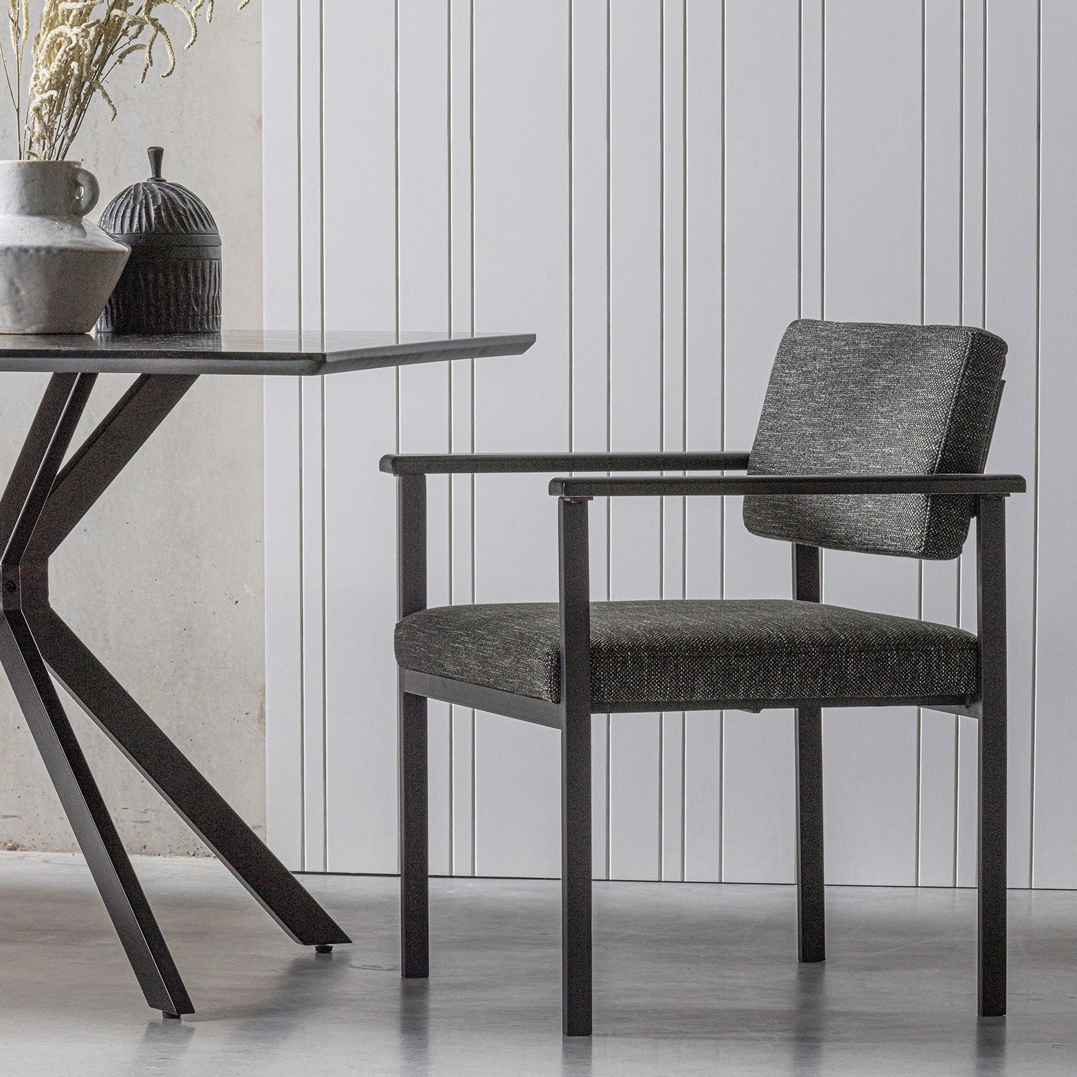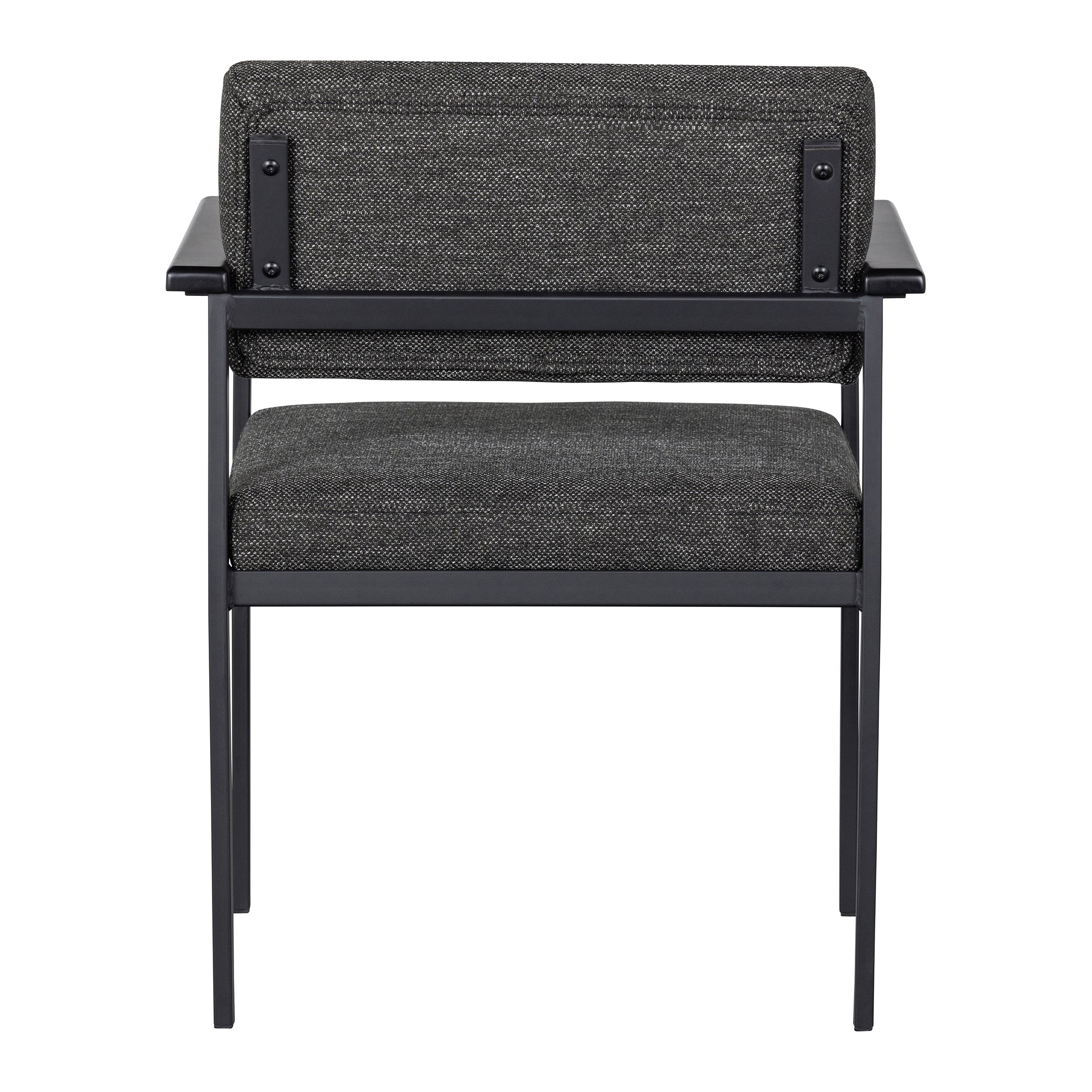 De poten zijn gemaakt van metaal met een matzwarte finish. De zitting is opgebouwd uit een houten frame met een standaard foam vulling van 7 cm dik. De zitting is bekleed met een eenvoudig te onderhouden, gemêleerde stof van 100% polyester. Afmetingen De Gust eetkamerstoel heeft een hoogte van 77 cm, breedte van 60 cm en diepte van 53 cm. De zithoogte is 43 cm. De zitbreedte van 52 cm en zitdiepte van 51 cm in combinatie met de hoge rugleuning zorgt dit voor een stevige zit. Urenlang tafelen is dus gegarandeerd! De maximale draagkracht van de Gust eetkamerstoel is 150 kg.