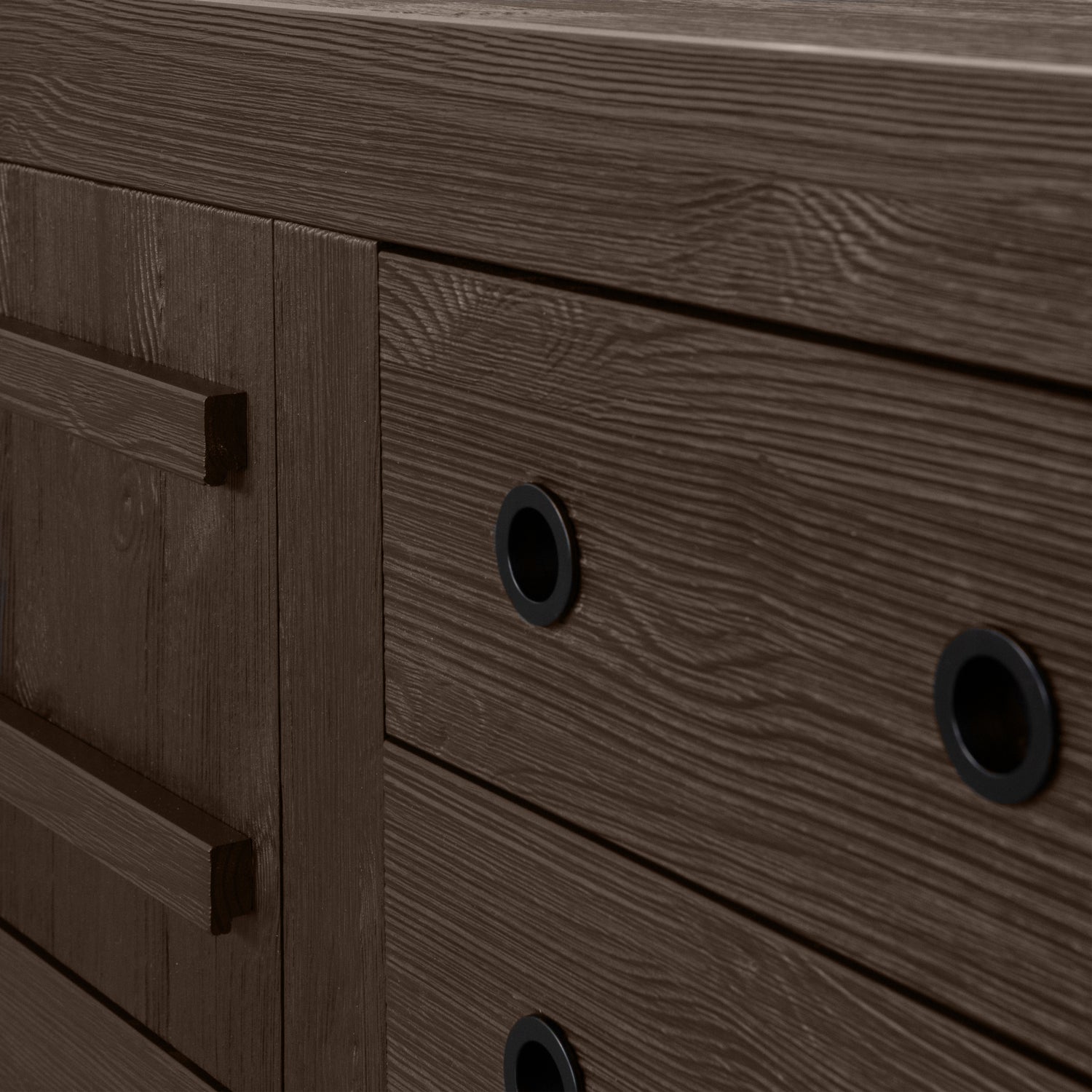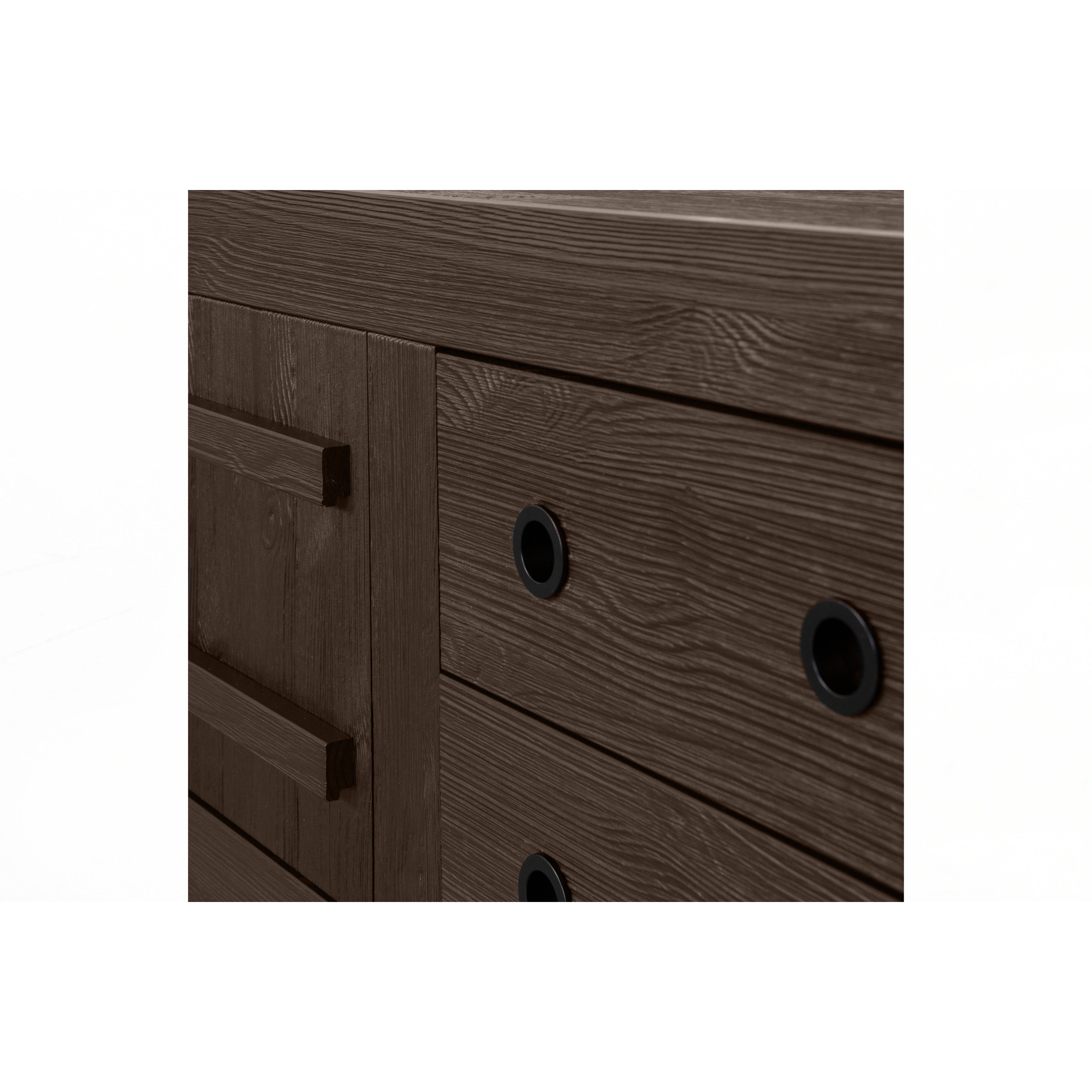 Het item is vervaardigd uit diep geborsteld grenenhout. De grenenhouten meubelen uit onze collecties zijn FSC-gecertificeerd en worden op diverse manieren behandeld. Zo is geschuurd grenen zeer glad en netjes en staat geborsteld grenen juist bekend om zijn karakteristieke nerftekeningen en doorleefde uitstraling. Voor een nog robuustere look wordt het grenenhout band gezaagd. Grenenhout wordt gekenmerkt door een lichtgele kleur en zichtbare vlamtekeningen. De zwarte legplanken en de ladewanden in het kastinterieur zijn gemaakt van spaanplaat (fsc) en de zwarte achterwand en ladebodems zijn gevormd uit HDF (fsc).