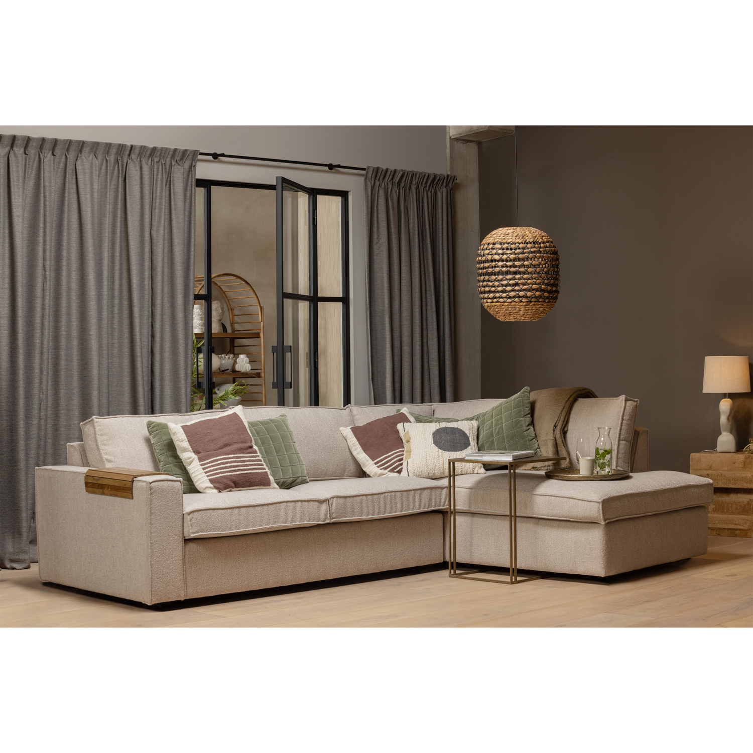 Materiaal: De Hajo hoekbank is bekleed met een lichte bouclé stof, bestaande uit 96% polyester en 4% polyacryl. Deze stof heeft een Martindale van 75.000, wat betekent dat hij uitstekend bestand is tegen slijtage en pillen. De stof is stevig, zacht en past goed in een modern interieur.