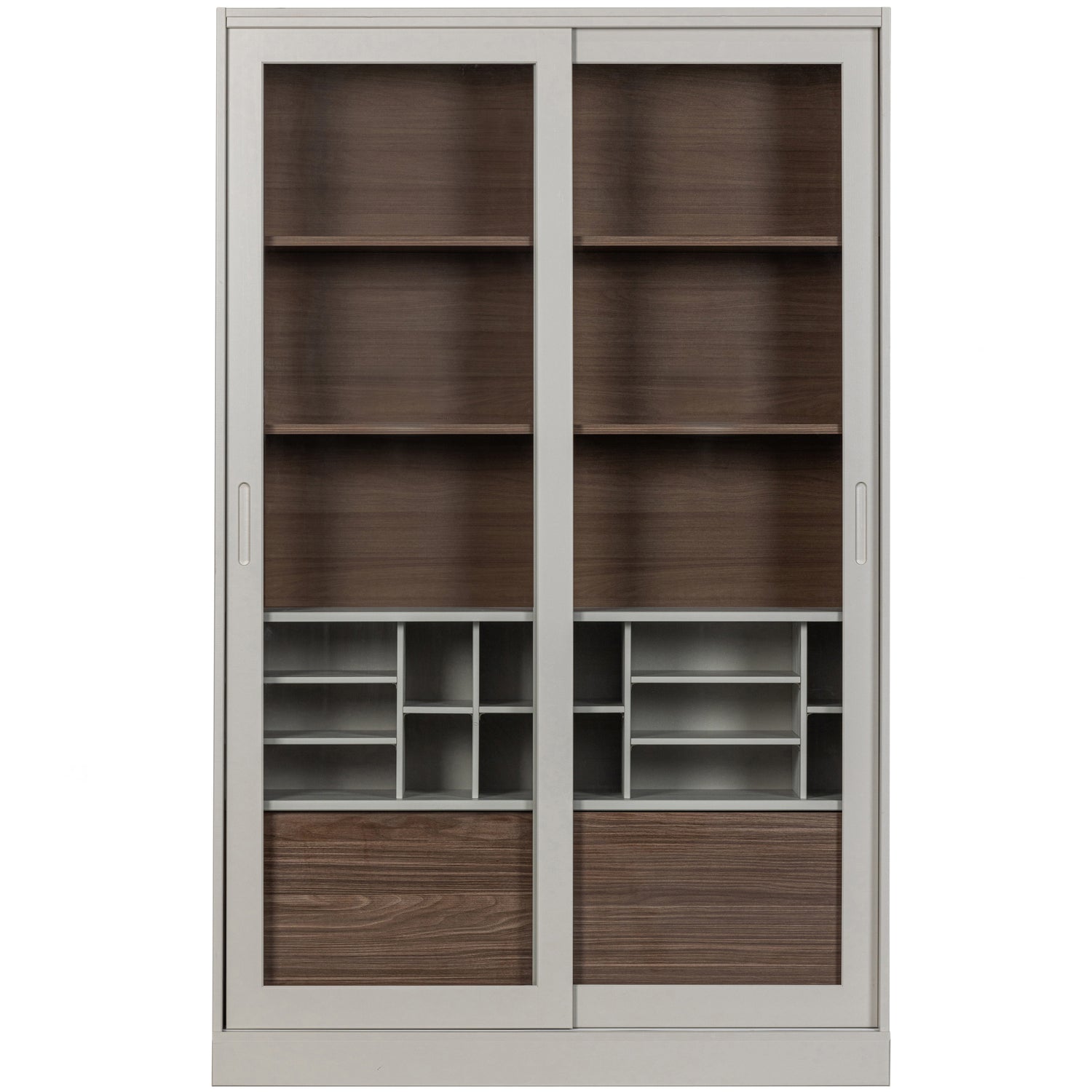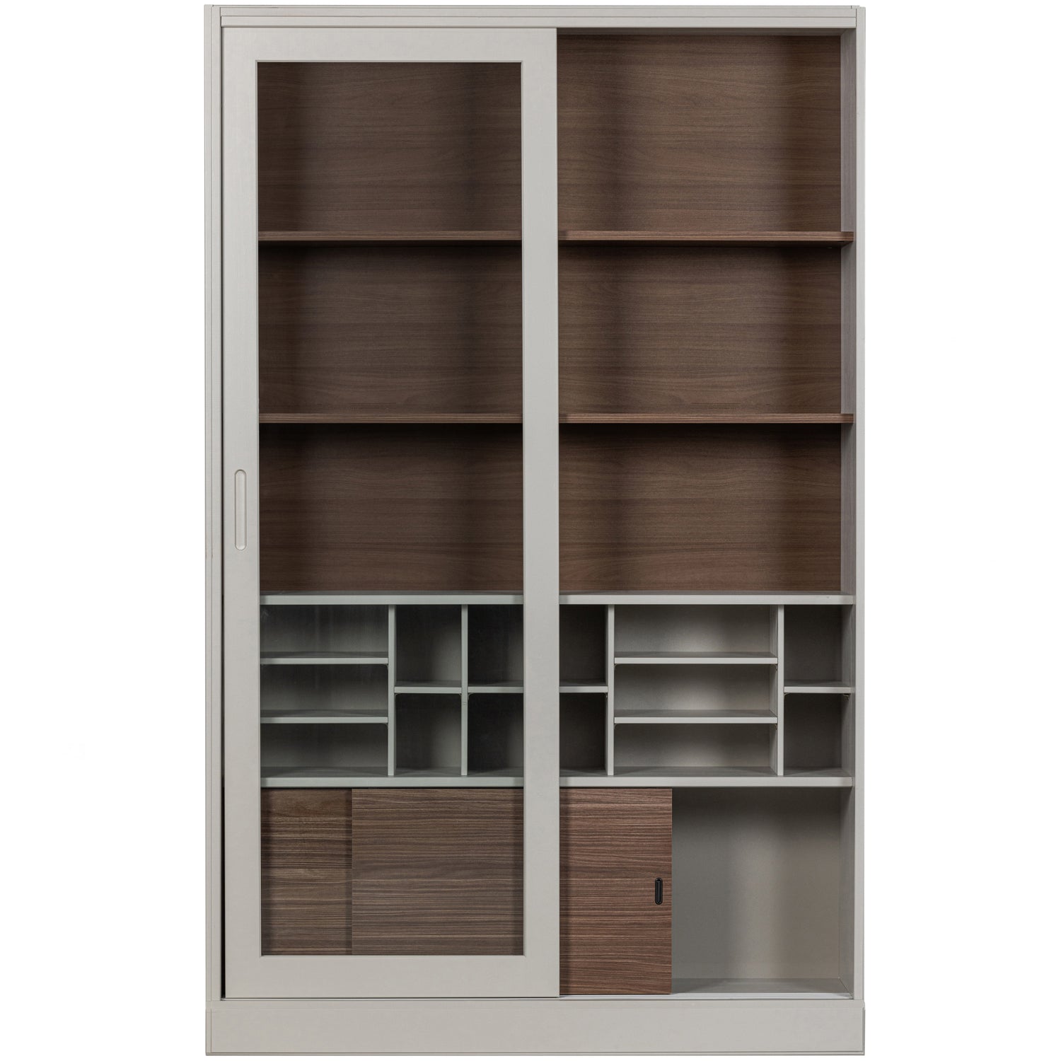 De James vitrinekast heeft een robuuste romp van sterk grenenhout, afgewerkt in een lichtgrijze mist kleur. De planken aan de binnenzijde van de kast zijn gemaakt van spaanplaat, de achterwand is uit MDF vervaardigd. Het interieur van de James kast is afgewerkt met een luxueuze notenhoutprint. Het glaswerk in de schuifdeuren is 4 mm gehard glas, wel net zo veilig! Houd er rekening mee dat de kast deels is vervaardigd uit massief grenenhout, een natuurproduct. Dit betekent dat het hout unieke kenmerken kan bevatten, zoals knoesten en nerven. Deze natuurlijke details zijn geen onvolkomenheden, maar juist een bewuste keuze om de kast een authentieke en karaktervolle uitstraling te geven. Elk exemplaar is hierdoor uniek.