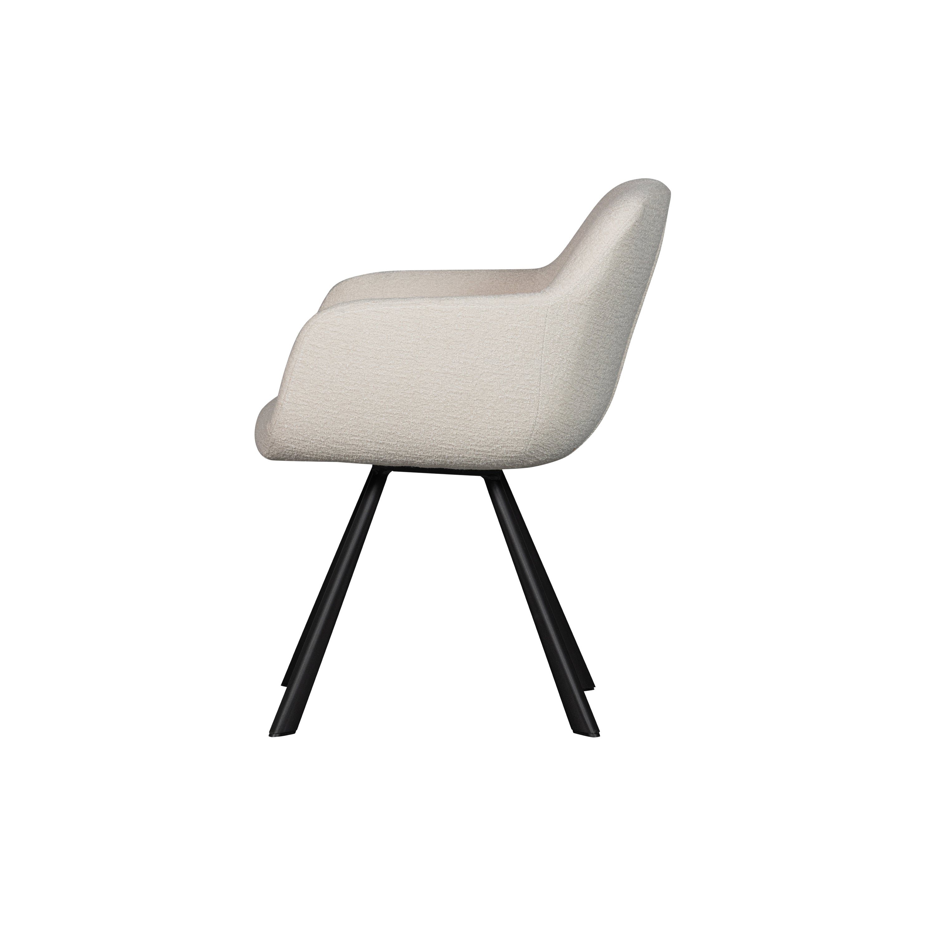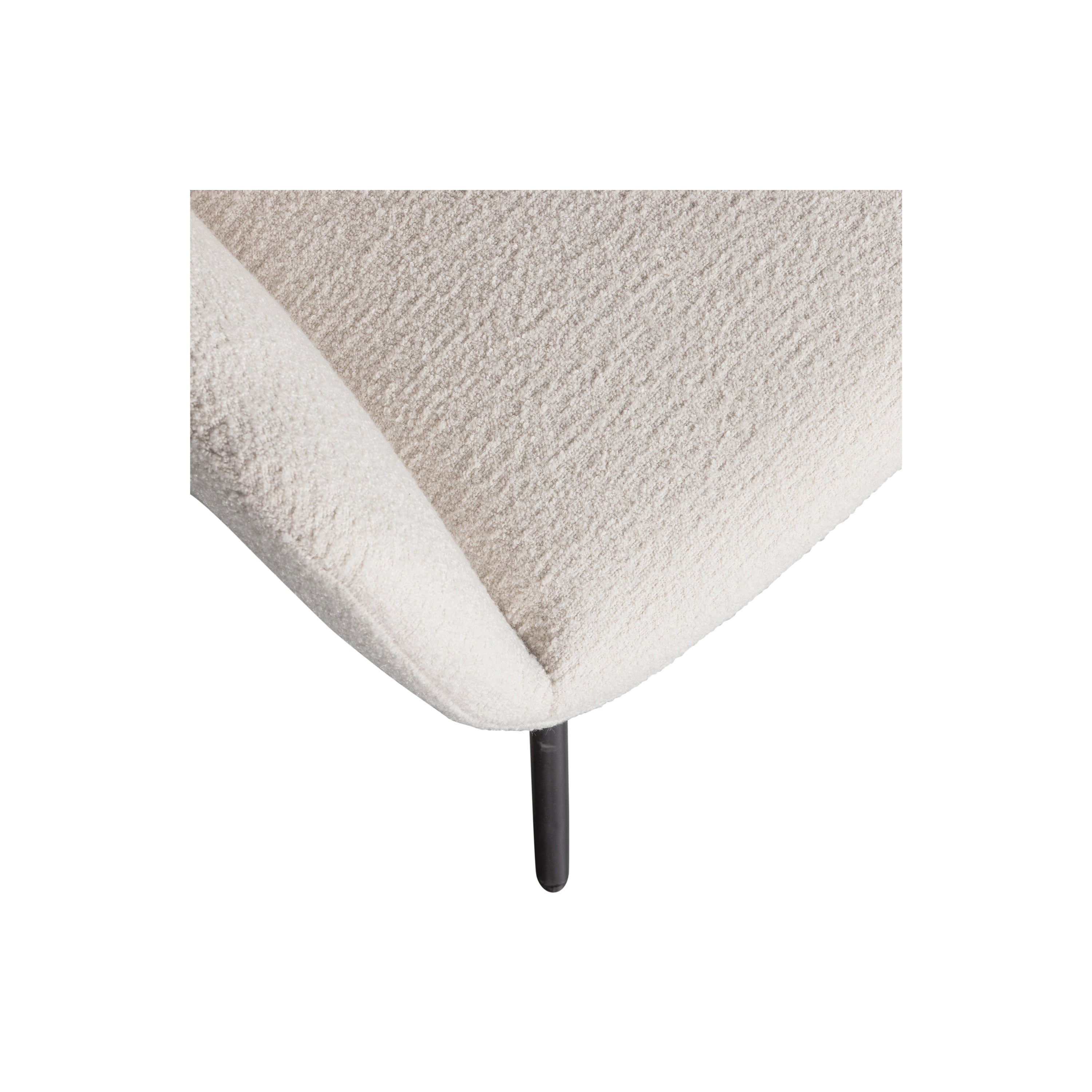 Materiaal De Juno eetkamerstoel heeft metalen poten met een matzwarte poedercoating. De zitting is gevormd uit een stalen frame en multiplex, bedekt met een polyurethaan schuim. De zitting is bekleed met een wollige bouclé. Deze zachte bouclé heeft een elegante textuur die meteen warmte in huis brengt. De dichte weeftechniek zorgt voor de sterkte van de stof, dit maakt dat de bouclé niet snel zal slijten of scheuren. Ook heeft elke kleur een hoge kleurvastheid, maar het is aangeraden om direct zonlicht te vermijden om kleurnuances te voorkomen. Afmetingen De Juno eetkamerstoel heeft een hoogte van 79 cm, breedte en diepte van 58 cm. De zithoogte bedraagt 49 cm, zitbreedte 44 en een zitdiepte van 42 cm zorgt voor een goede ondersteuning. De rugleuning steekt 35 cm boven de zitting uit en de armleuningen zijn vanaf de grond gemeten 64 cm hoog wat zorgt voor een geborgen gevoel. De poten hebben een hoogte van 38 cm en lopen taps uit. De afstand tussen de voor- en achterpoten bedraagt 48 cm, tussen de twee voorpoten is dit 40 cm. Juno kan per zitplaats tot 120 kg dragen. Onderhoud Bij eventuele vlekken direct droogdeppen met een schone doek of tissue. Beslist niet wrijven! De meeste vloeistoffen zijn te verwijderen met lauw water. Maak gebruik van een zachte, ronddraaiende beweging van buiten naar binnen. Als de stof losgehaald kan worden van het meubel is wassen op 30 graden of de stof laten stomen, mogelijk. Levering Juno wordt in één pakket, volledig gemonteerd, geleverd. Plaats voor het beschermen van harde vloeren viltglijders aan de onderzijde van de poten.