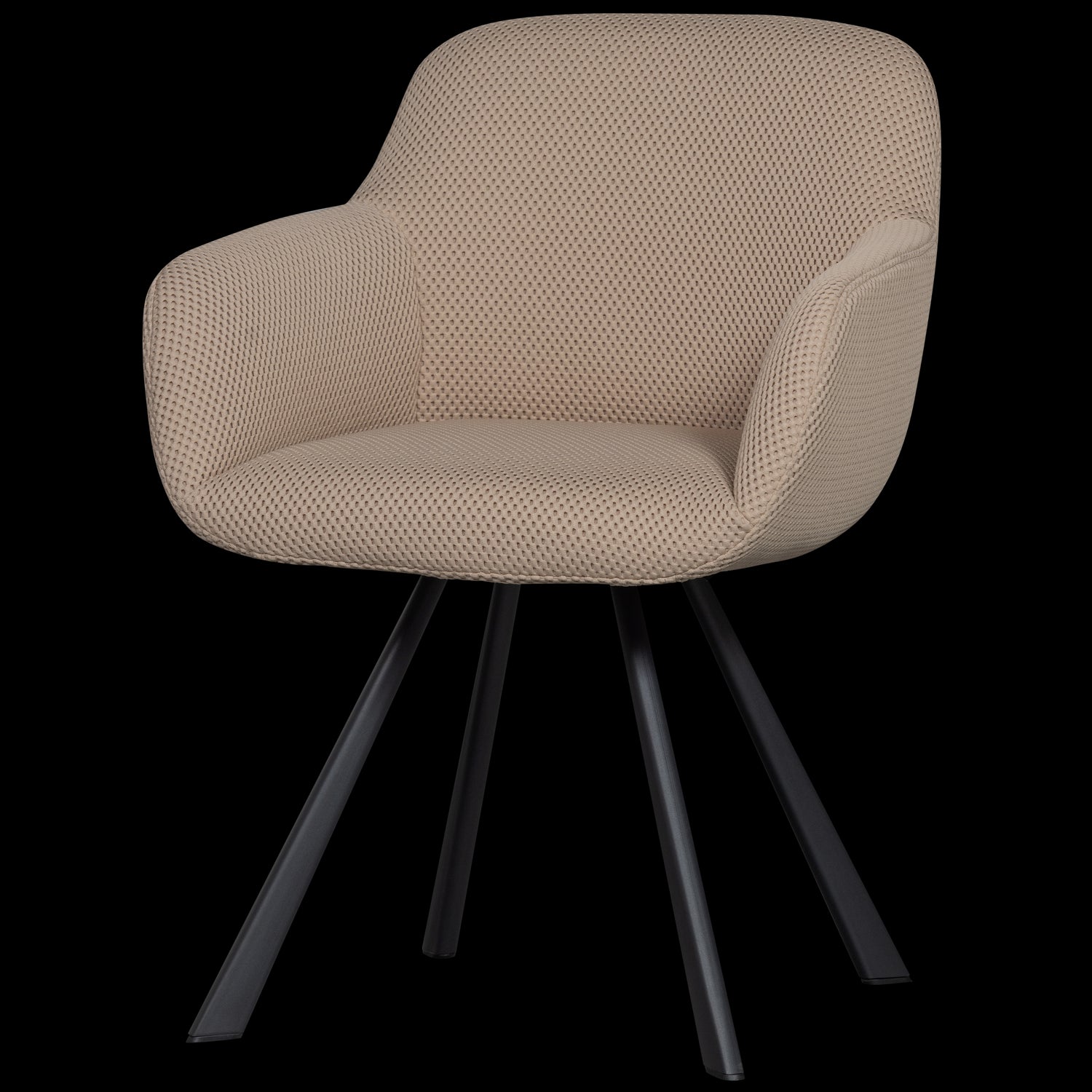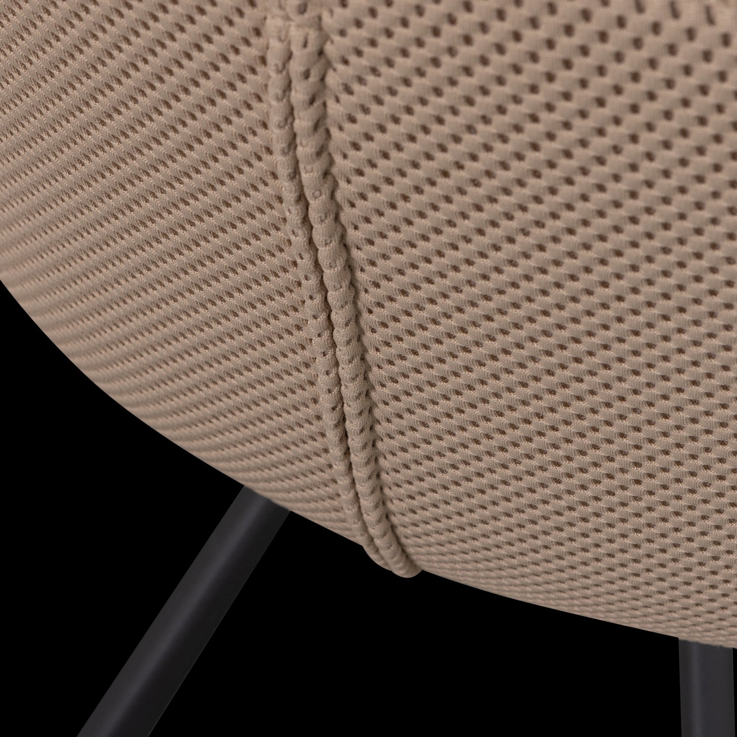 De Juno eetkamerstoel heeft metalen poten met een matzwarte poedercoating. De zitting is gevormd uit een stalen frame en multiplex, bedekt met een polyurethaan schuim. De zitting is bekleed met een mesh stof. Onze Wave gebreide mesh stof is een unieke toevoeging aan de meubelcollecties. De mesh stof heeft een opvallend 3D-effect en is van een zware kwaliteit. Met een samenstelling van 100% polyester en een Martindale van 100.000 is de stof van zeer sterke kwaliteit. De compact geweven backing zorgt dat het grafische patroon ten alle tijden in vorm blijft.