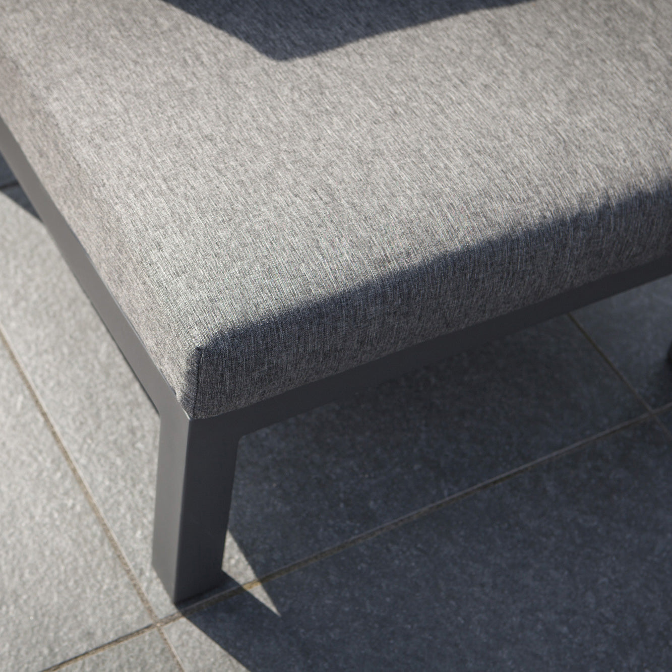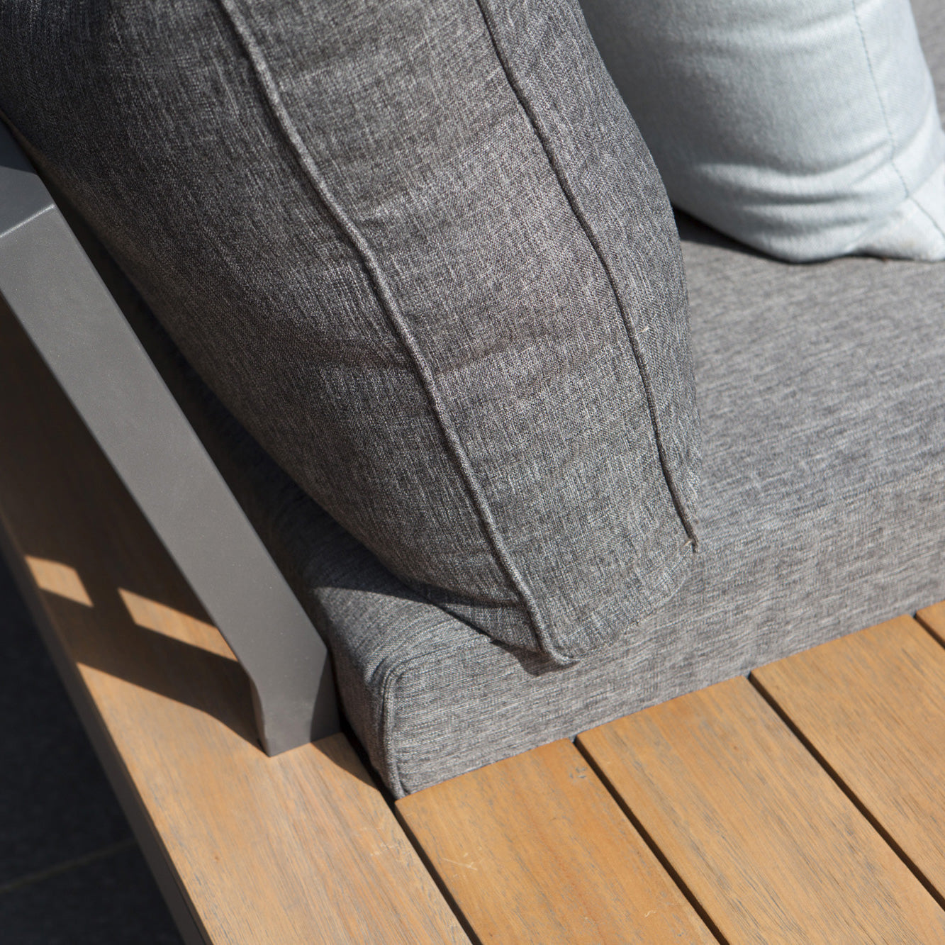 Wanneer je op zoek bent naar een royale, comfortabele en stijlvolle hoekbank voor in de tuin, dan is deze loungeset La vida van het outdoor merk Exotan perfect voor bij jou in de tuin. Op de La Vida loungeset kun je heelijk in de tuin relaxen en samen met vrienden en familie genieten van het buitenleven. Met deze set ben je in een keer klaar want bij deze hoekbank worden luxe kussens en een bijpassende salontafel geleverd. Plaats deze royale hoekbank op een zonnige veranda voor een waar relaxmoment en ervaar het luxe comfort. Deze hoekbank is gemaakt van FSC-gecertificeerd teakhout. Teakhout is een tropisch hardhout en een zeer duurzame houtsoort. Het hout heeft van zichzelf een donkerbruine ode kleur en is gekenmerkt door een strakke, rechte nerf. Hierdoor is het hout zeer geschikt voor verwerking. Let wel, bij buiten gebruik kan het teakhout echter verkleuren of ontstaan er haarscheurtjes in het hout. Dit heeft geen invloed op de constructie. Het frame is gemaakt van sterk aluminium en is voorzien van een chique antraciet kleur poedercoating. De kussens zijn bekleed met een antraciet kleur stof, geschikt voor buiten, en gevuld met standaard foam. De zithoogte van de bank is 43 cm, de salontafel heeft dezelfde hoogte. De zitbreedte van de rechte kussens is ieder 70 cm. De bank, inclusief kussens, heeft een zitdiepte van 52 cm. De aluminium poten zijn 28 cm en ieder 4x4 cm. De draagkracht van de loungeset is 500 kg wanneer gelijk verdeeld. De salontafel heeft de afmetingen: B 80 x D 80 cm en het tafelblad heeft een dikte van 1 cm. Tip! Om een teakhouten outdoor meubel in optimale conditie te houden is het raadzaam het regelmatig te onderhouden met de daarvoor bestemde onderhoudsmiddelen, raadpleeg een verfspeciaalzaak voor het beste advies. Reinig teakhout niet met te veel water, hierdoor gaan de houtvezels overeind staan en wordt het meubel erg ruw. De vulling van de bekleding is voorzien van standaard foam. Hierdoor kun je de kussens niet buiten laten liggen. Berg deze kussens dan altijd op in een droge, van zonlicht afgesloten plek. Hiermee voorkom je dat 'het weer' of schimmel in de kussens gaat zitten. Bescherm de meubelen tegen regen, nacht en winterperiode met een plasticfolie of beschermhoes. Indien mogelijk is het beter dat de meubelen binnenshuis overwinteren. Zorg er steeds voor dat het meubel niet in een plas water kan staan, of dat er water blijft staan op het meubel na een regenbui. Het water zal in het meubel trekken en randen vertonen na verloop van tijd. Deze vlekken zijn niet altijd eenvoudig te verwijderen. Verwijder overige vlekken met een neutrale zeep. Gebruik geen chemische middelen of hoge druk reinigers.