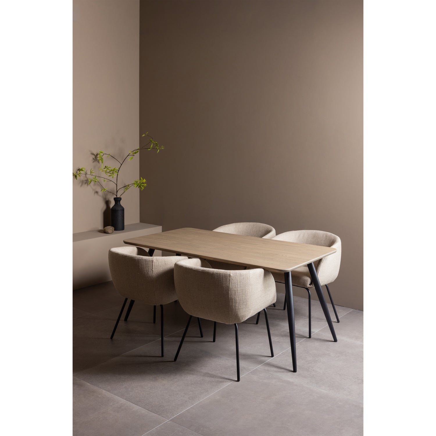 De Leon eetkamerstoel, uit de collectie van het Nederlandse interieurmerk WOOOD, heeft een subtiel kuipvormige zitting bekleed met een warme bouclé stof. De conische metalen poten geven de stoel een luchtige, moderne uitstraling.
